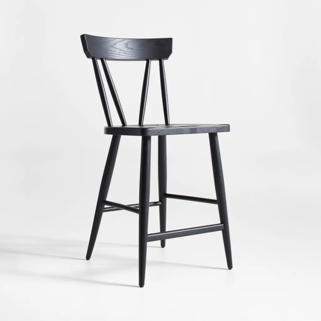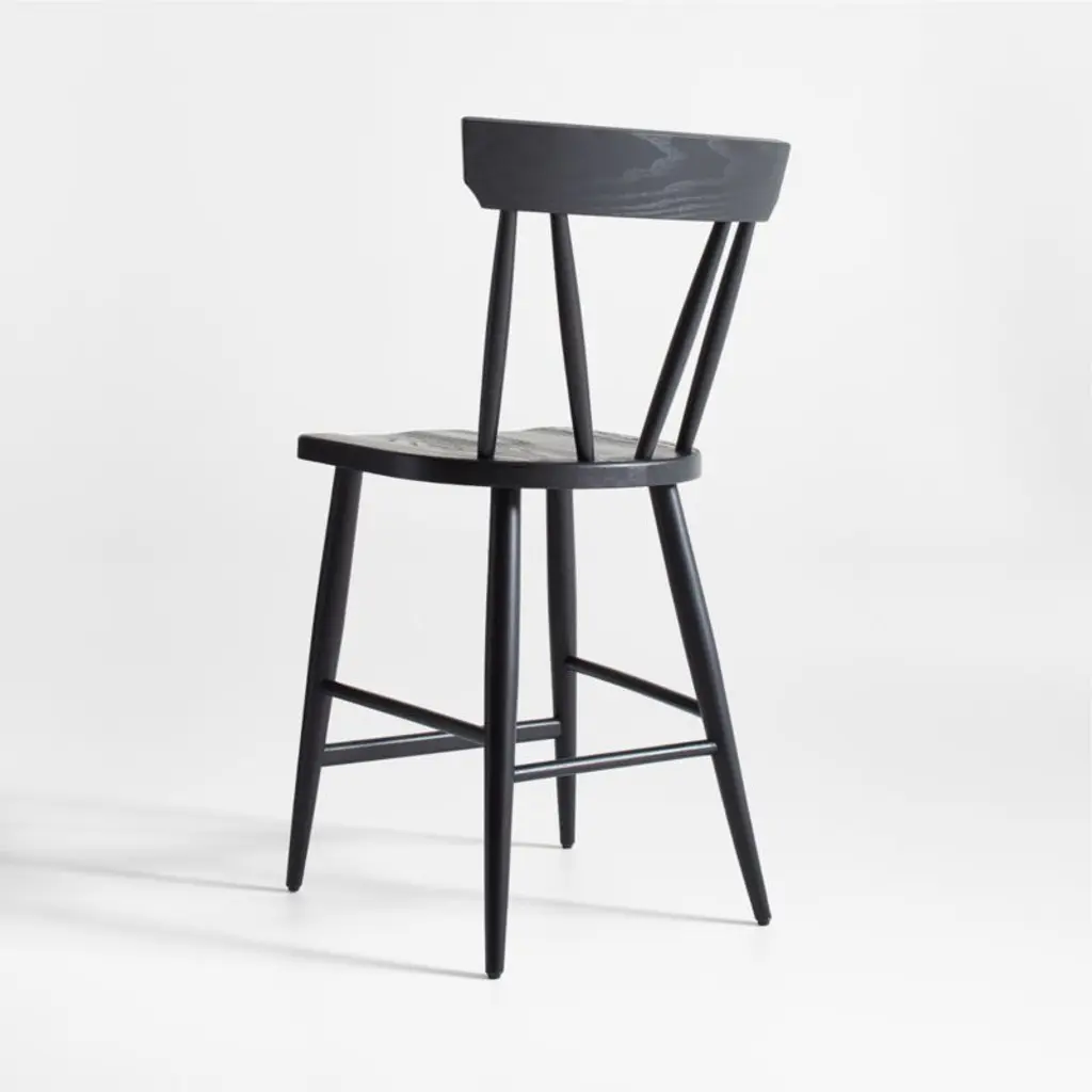 Fewer spindles and a chic black finish update the classic Windsor design with an easy air in our Juni counter stool. Channeling the casual attitude of Scandinavian farmhouse style, the ash wood stool relaxes with softened edges, tapered legs and spindles and sculpted, linger-worthy seat. A natural choice to pull up to kitchen counters and pub tables, the Juni black counter stool is a Crate & Barrel exclusive.By choosing FSC ®-certified furniture, you are supporting responsible management of the world's forests.