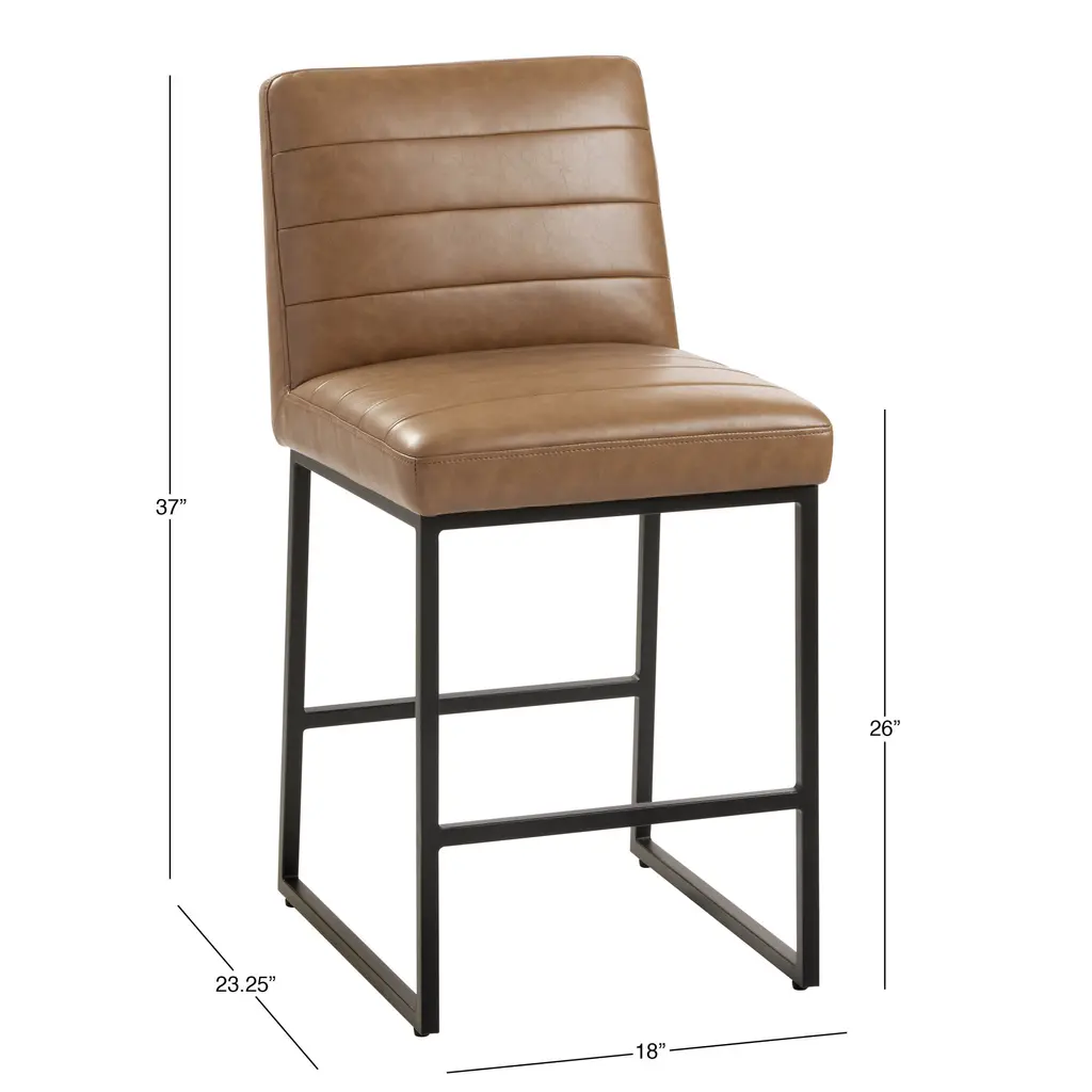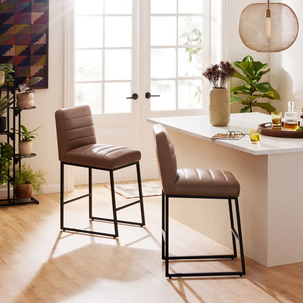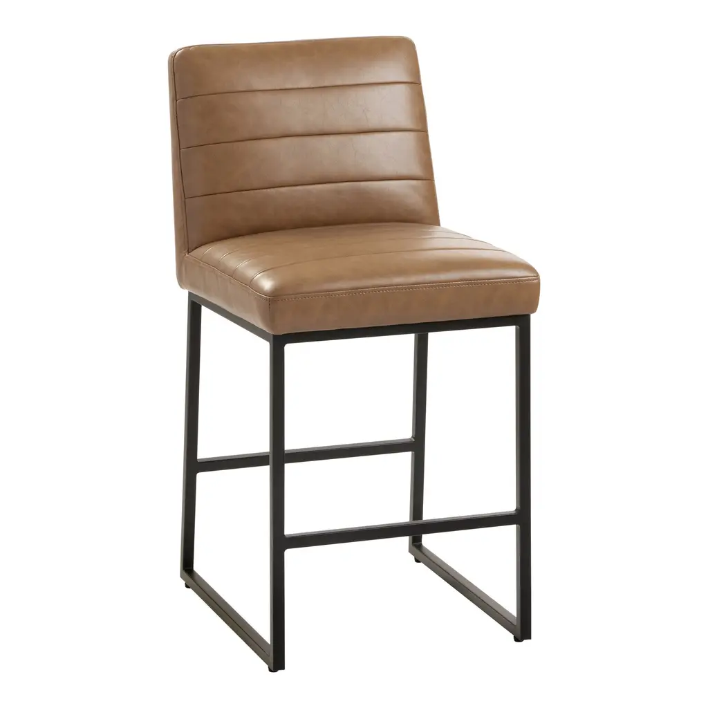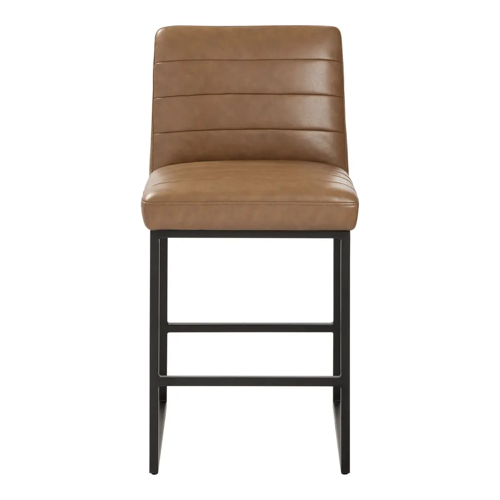Our sophisticated Katiya counter stool is upholstered in premium cognac-brown faux leather with a channel-tufted seat and backrest. Presented on a classic black base with a clean-lined footrest, this modern counter chair is a charming two-tone seat for your kitchen island or counter-height dining table. Its quality vegan-leather upholstery is exceptionally comfortable with a lasting durability that makes it easy to spot clean.