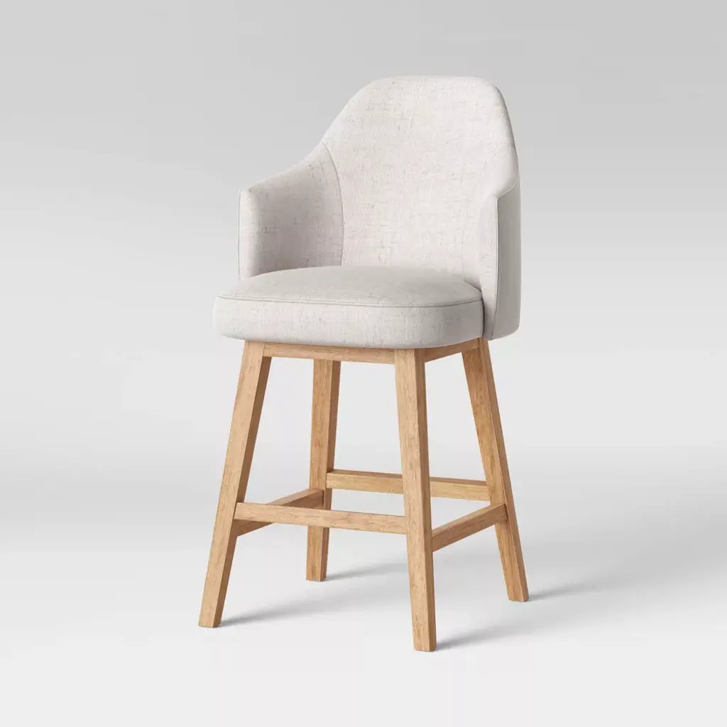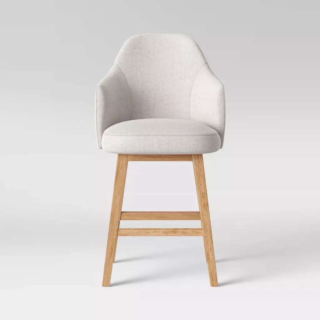 Complement a stylish and chic kitchen or lounge with the Kinston Swivel Curved-Back Upholstered Counter-Height Barstool from Threshold™. This counter-height stool has a beautiful look, with textured gray upholstery, a padded seat cushion and a back that's curved and extended forward to form armrests, helping to provide enhanced comfort for spending long hours sitting at the counter. The upholstered seat is perched on weathered wood-finish tapered legs, as well as complementing stretchers for foot resting. The counter stool with swivel seat function allows you to easily pivot in and out from the counter, providing greater accessibility. Threshold™: Looks like home, feels like you.