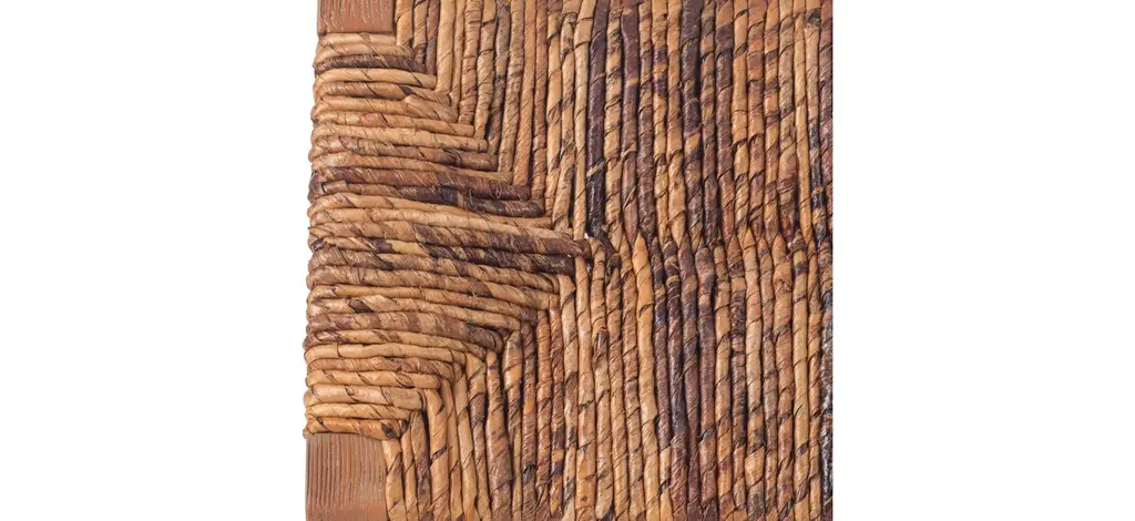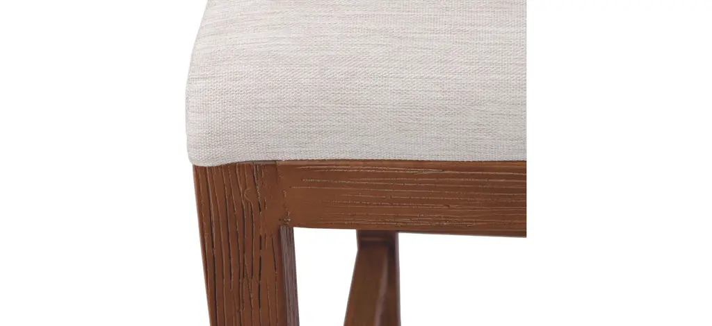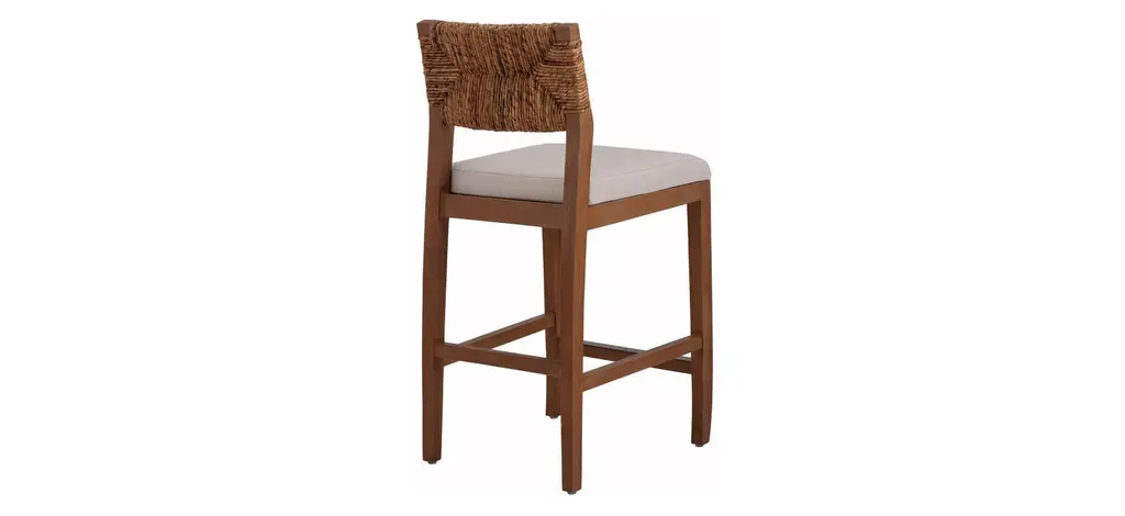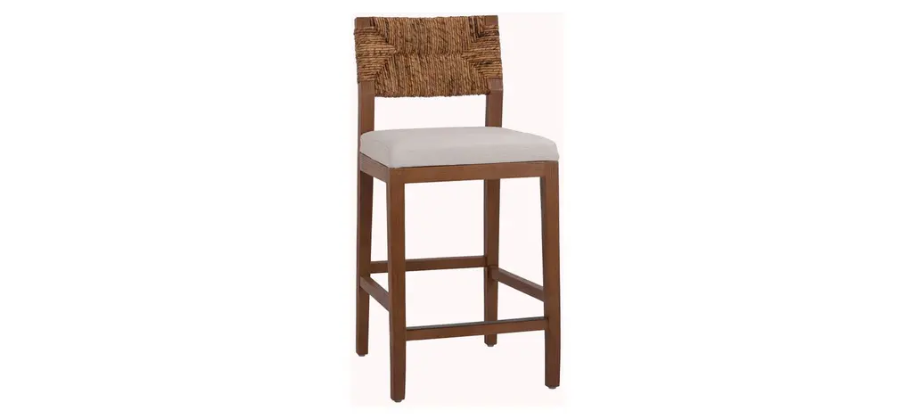 The Lyon Abaca Counter Stool seat back is made from woven banana leaf, a casual material that channels tropical locales. The solid mahogany frame wears a Nova Brown finish with a stationary polyester-covered cushion. This visually appealing rustic modern 27" height counter stool's design is complete with a foot stretcher for comfort and stability.
