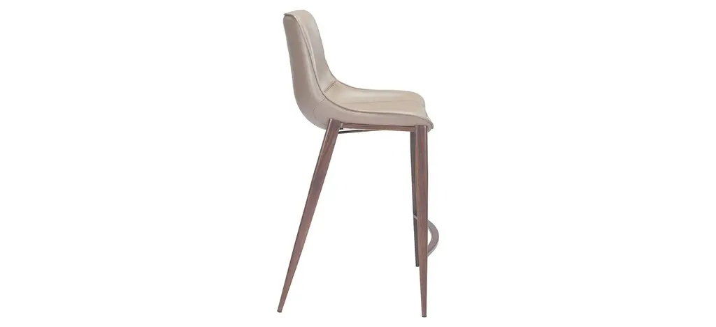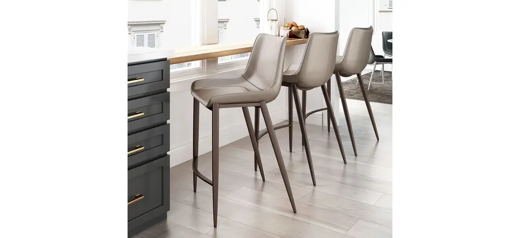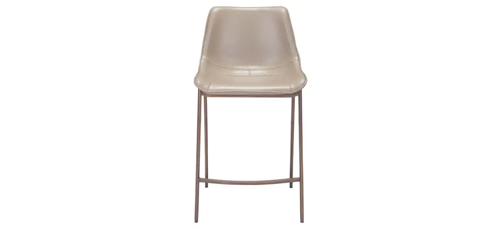 The Magnus Counter-Height Stool: set of 2 with its slim profile pulls up perfectly to the bar. Its super comfortable curved seat is covered in faux leather with dramatic stitching.