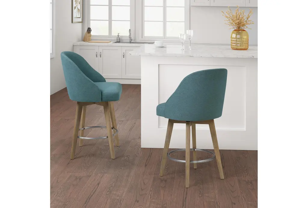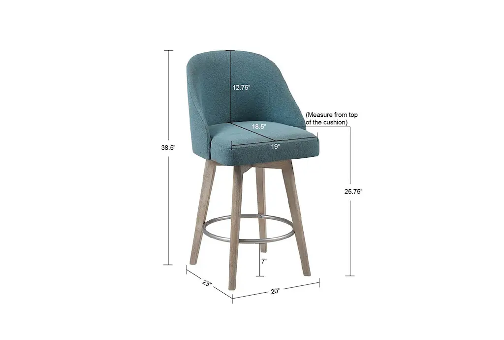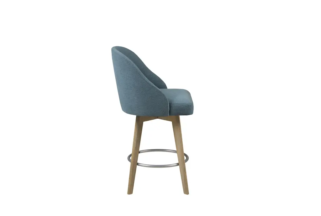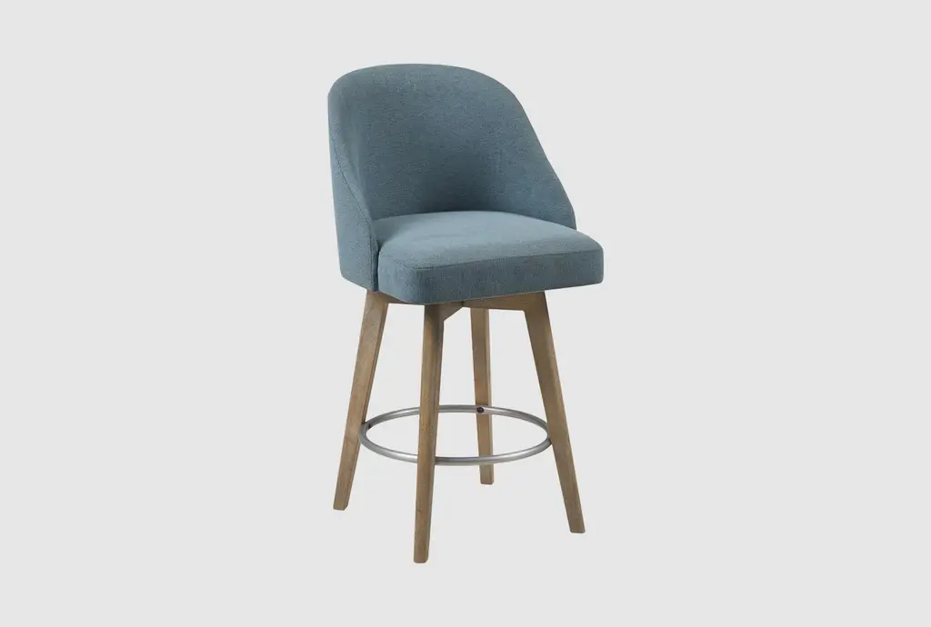 The Marshall Blue Wood 25.75" Counter Height Stool with Back and Swivel Seat is the perfect addition to your dining room or kitchen. This modern stool features a comfortable curved back and convenient swivel functionality, making it ideal for small spaces. The armless design and solid wood frame provide both durability and style.