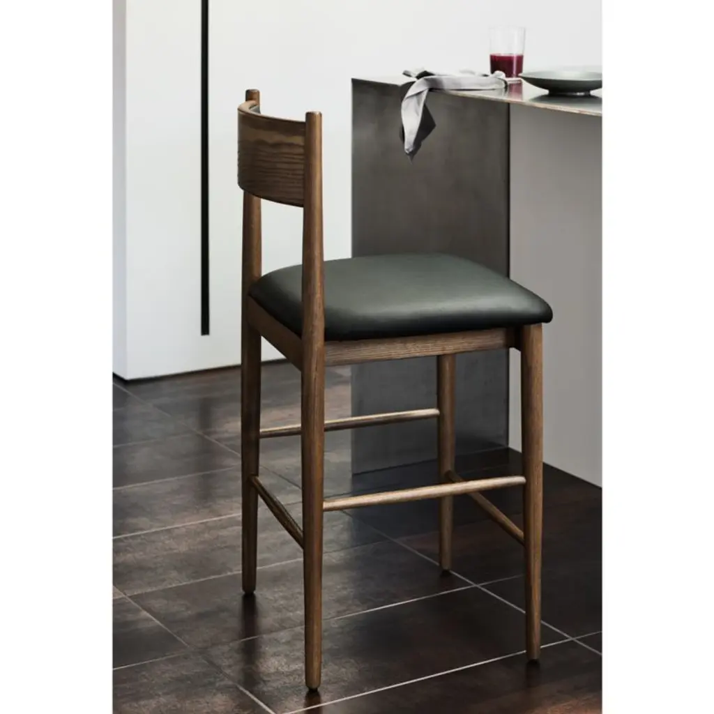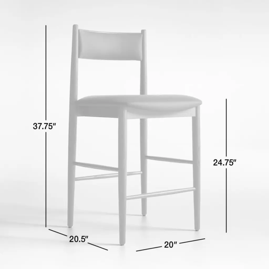 Our Petrie counter stool taps into the same stylish era as our furniture collection of the same name. With its classic mid-century modern silhouette, the brown-finished ash stool features subtly tapered turned legs and a barrel-curved backrest. A padded back and cushioned seat that extends slightly beyond the frame soften the look and provide linger-inducing comfort. Black leather upholstery indulges with a soft touch and fine-grained texture. The perfect update to counter or high-dining, our Petrie black leather counter stool is a Crate & Barrel exclusive.By choosing FSC ®-certified furniture, you are supporting responsible management of the world's forests.