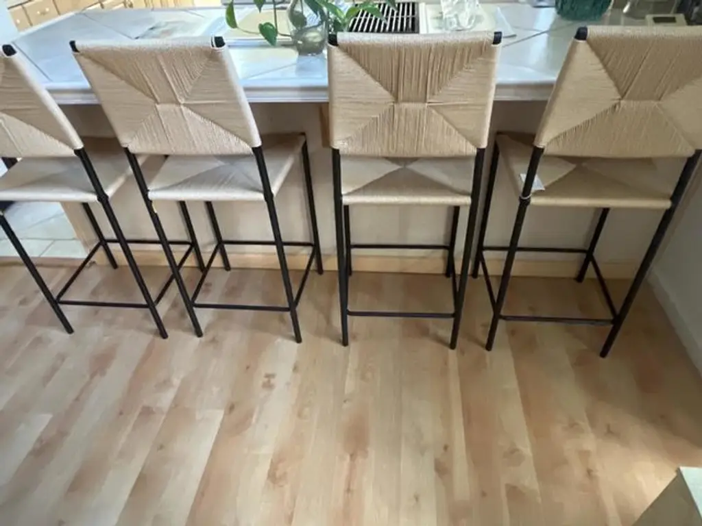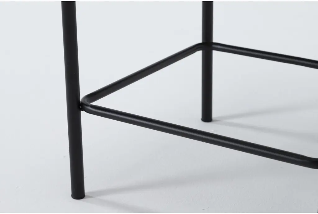 Introducing the Rattan Natural Woven + Black Metal 26" Counter Height Stool With Back | Armless, perfect for your dining room or kitchen. This rustic stool features a natural rattan seat and back, complemented by a sturdy black metal frame. Its woven design adds a touch of rustic charm to any space.