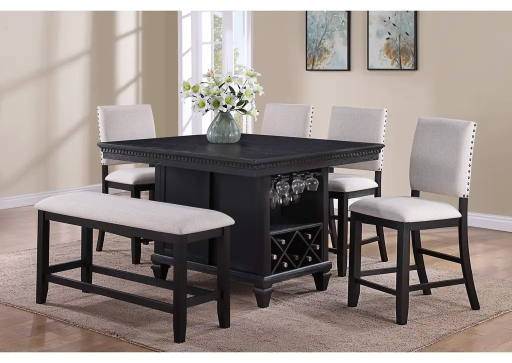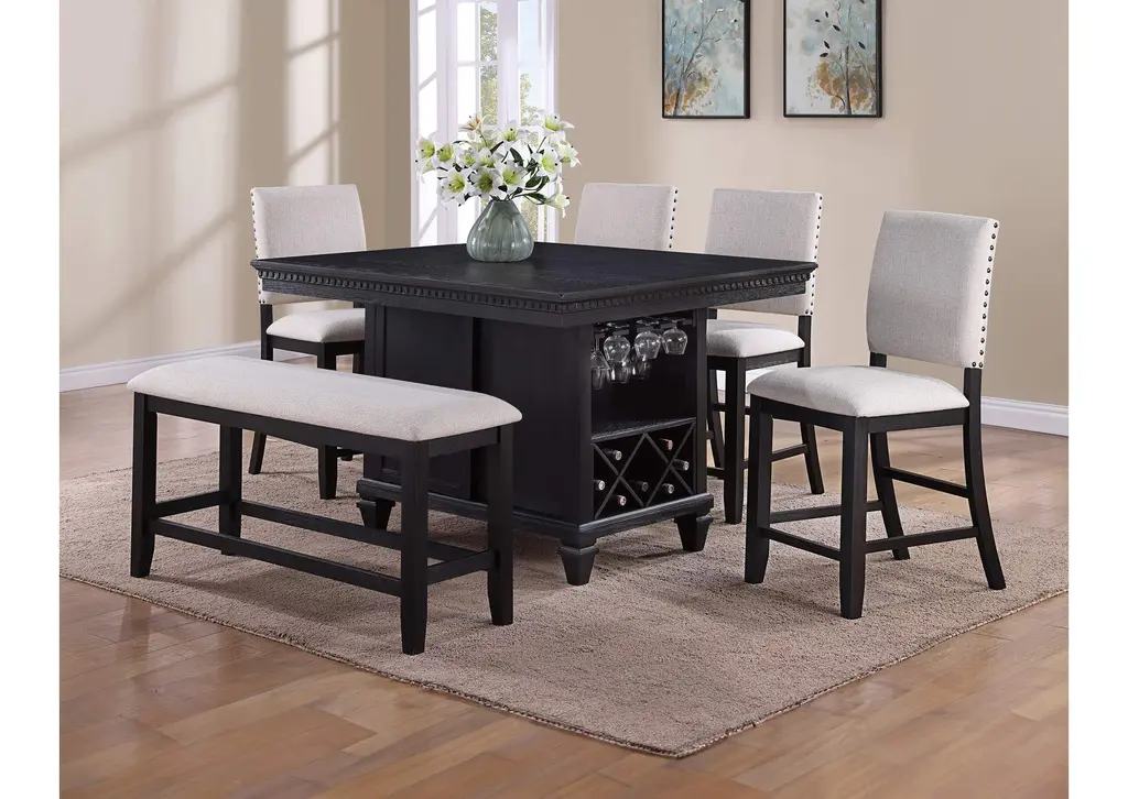 Elevate your dining experience with this elegant counter-height dining group, designed for both style and functionality. The sophisticated table features a rich, dark finish with intricate detailing along the edges, creating a refined and timeless appeal. Built-in storage, including a wine rack and glass holders, ensures effortless organization and easy access to your favorite beverages. The plush, upholstered chairs and bench offer luxurious comfort, enhanced by stylish nailhead trim for a touch of elegance. Perfect for intimate gatherings or lively dinner parties, this set combines practicality with upscale charm, making it a stunning centerpiece for any dining space. Weight 48.400 lbs. (21.78kgs.)