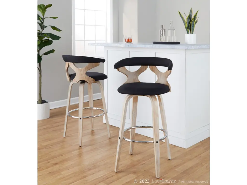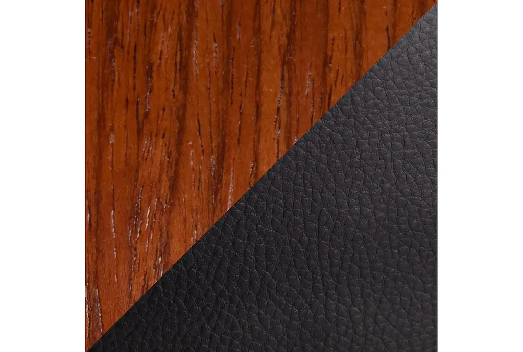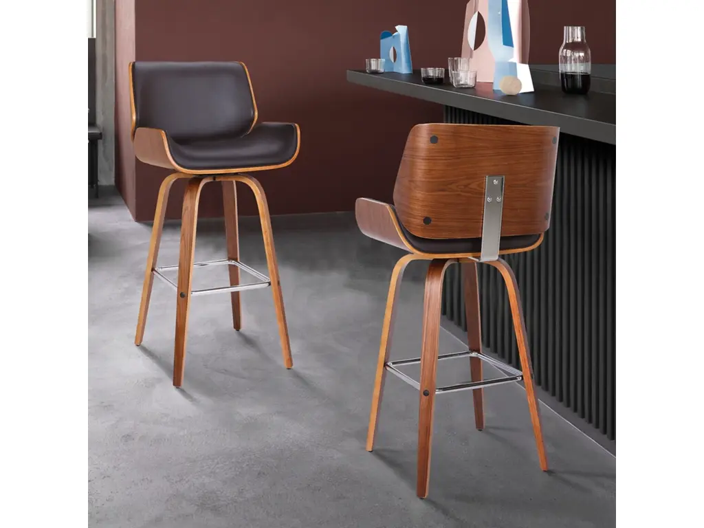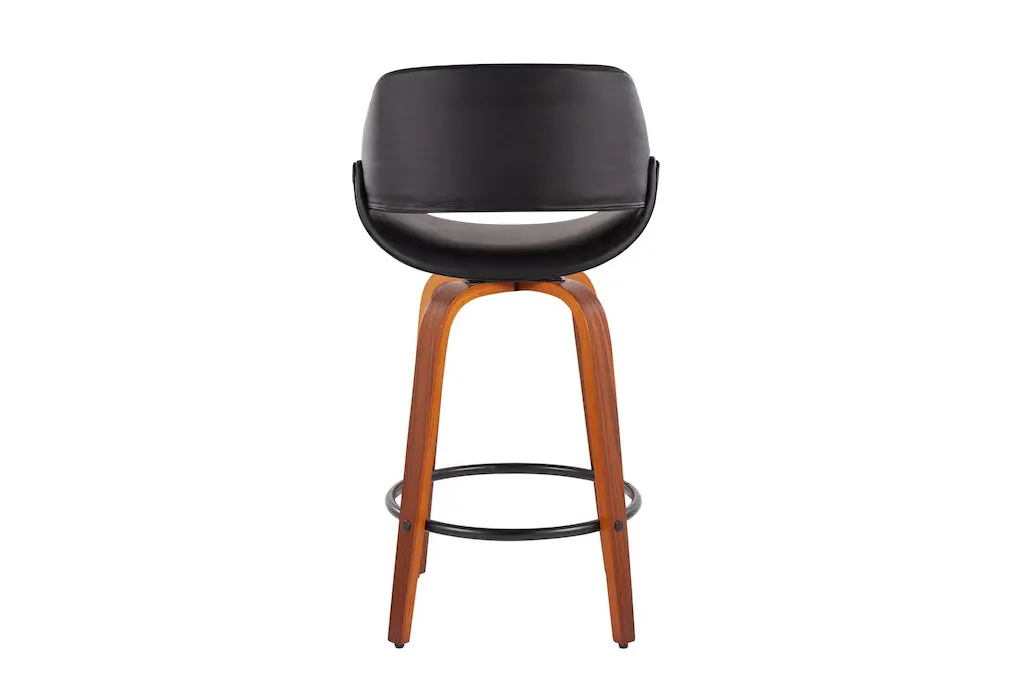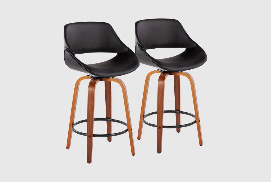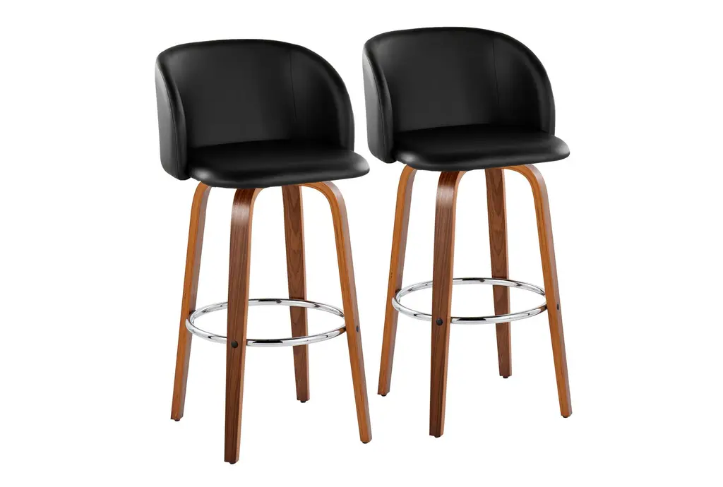 Elevate your dining room with the Rizzi Walnut and Black Faux Leather Counter Stool Set Of 2, featuring a sleek modern style and tall design. Crafted with durable faux leather and wood, this set is perfect for entertaining guests and adding a touch of sophistication to any space.