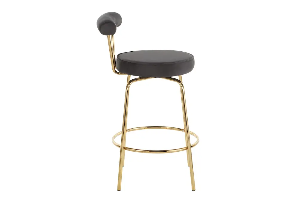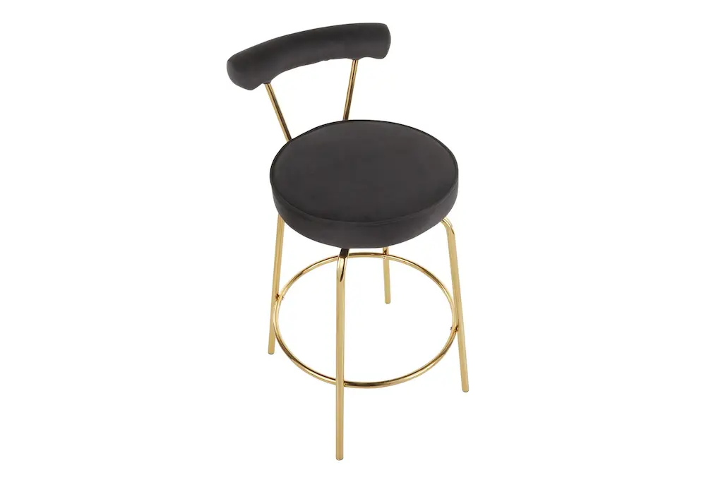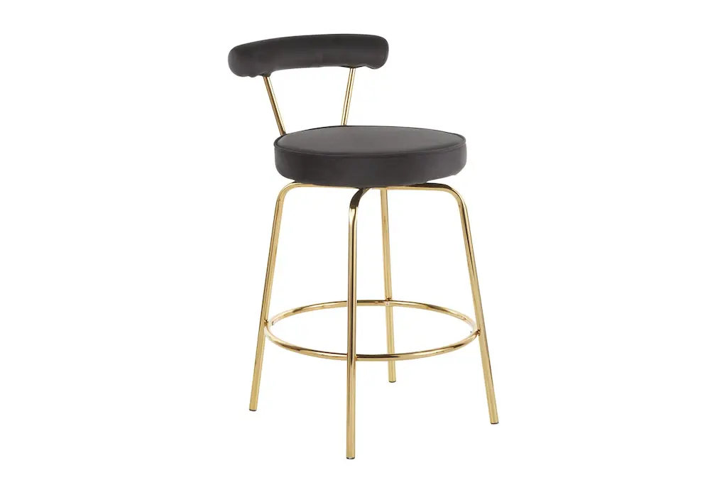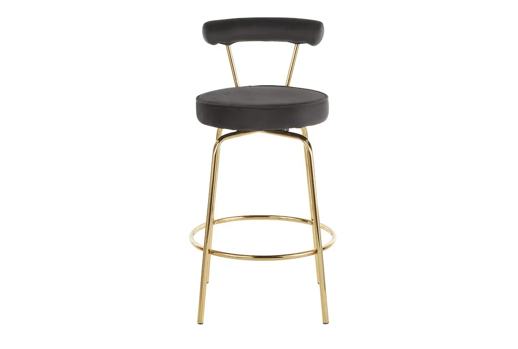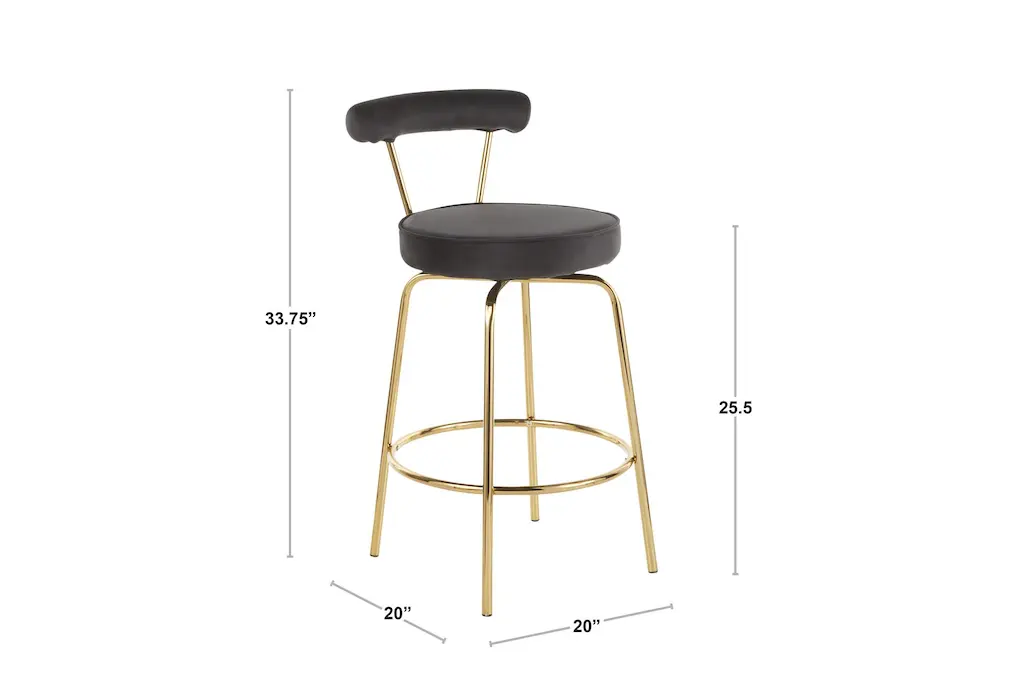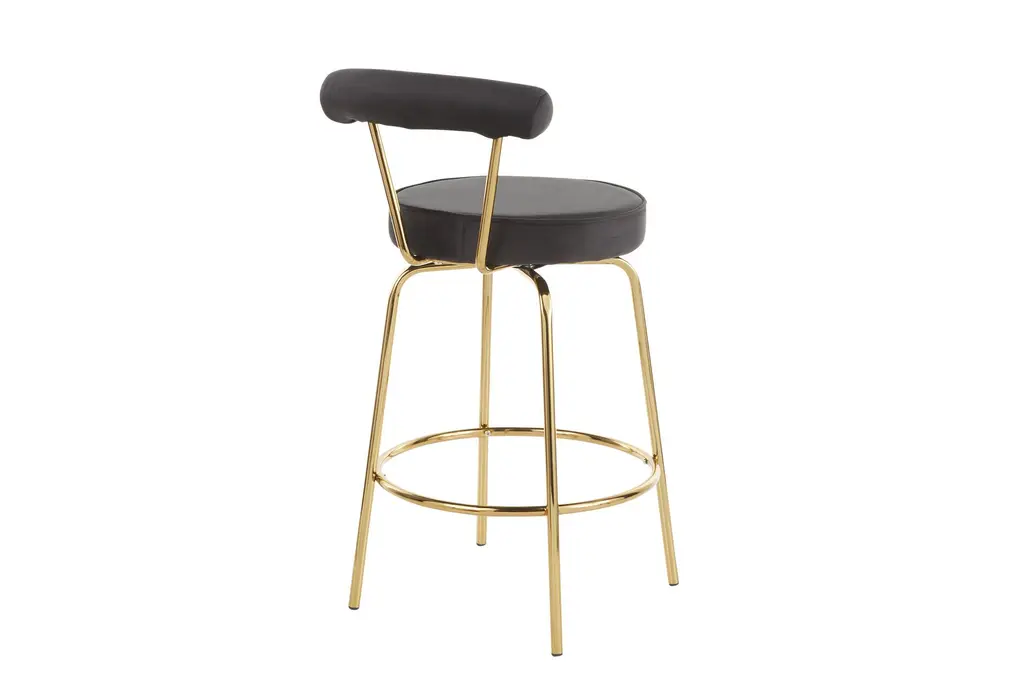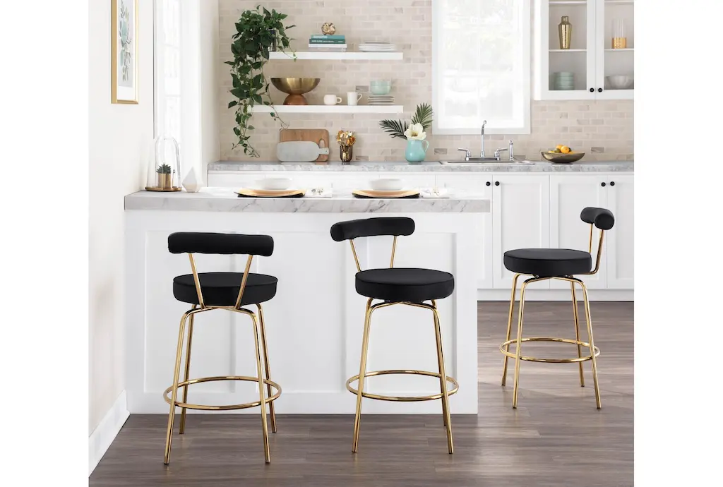 The Rudi Black Counter Stool Set of 2 is a modern, adjustable-height seating solution for your dining room. Crafted from velvet and metal, these stools feature a 360-degree swivel and are upholstered in stylish faux leather.