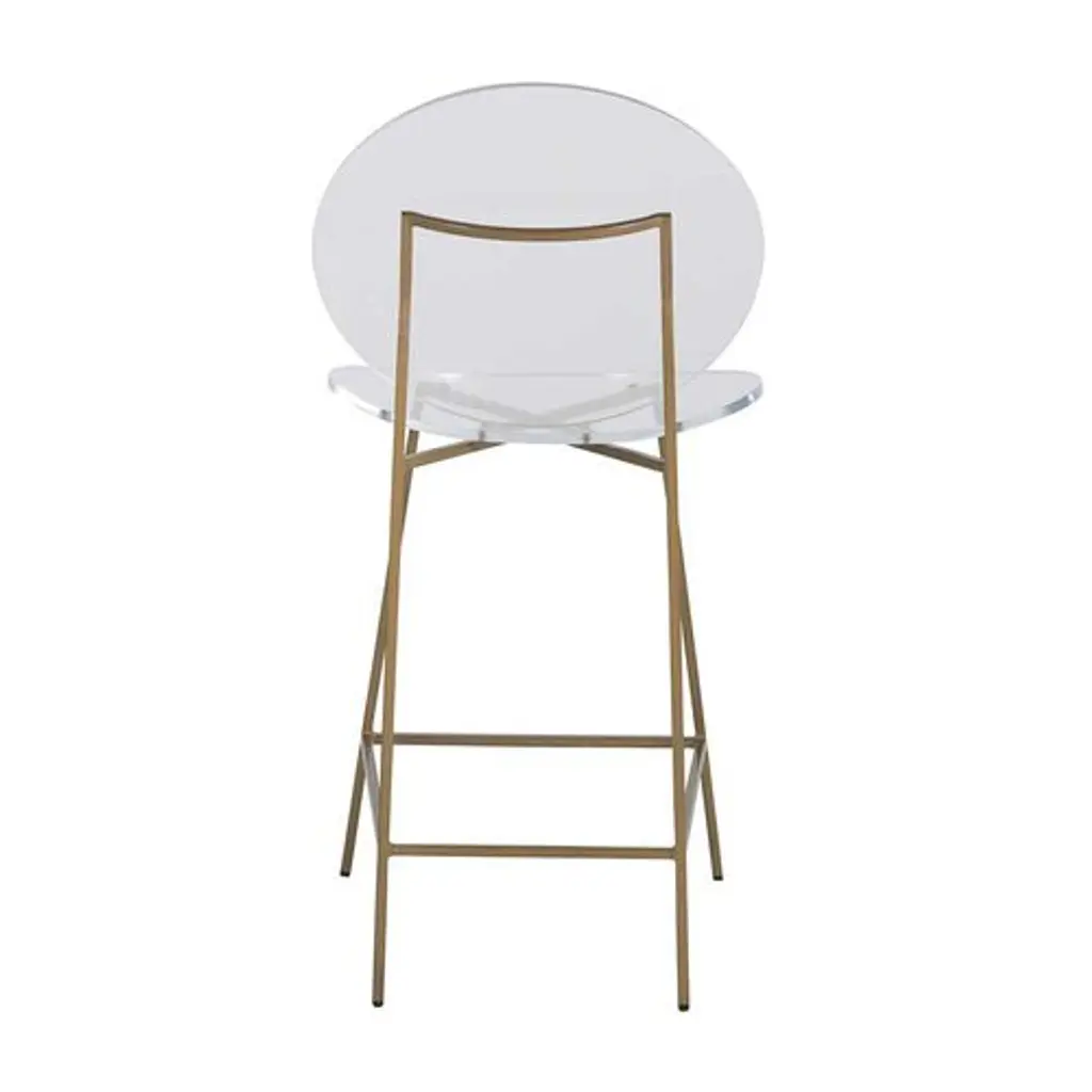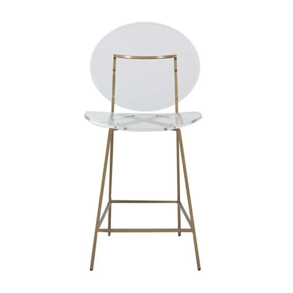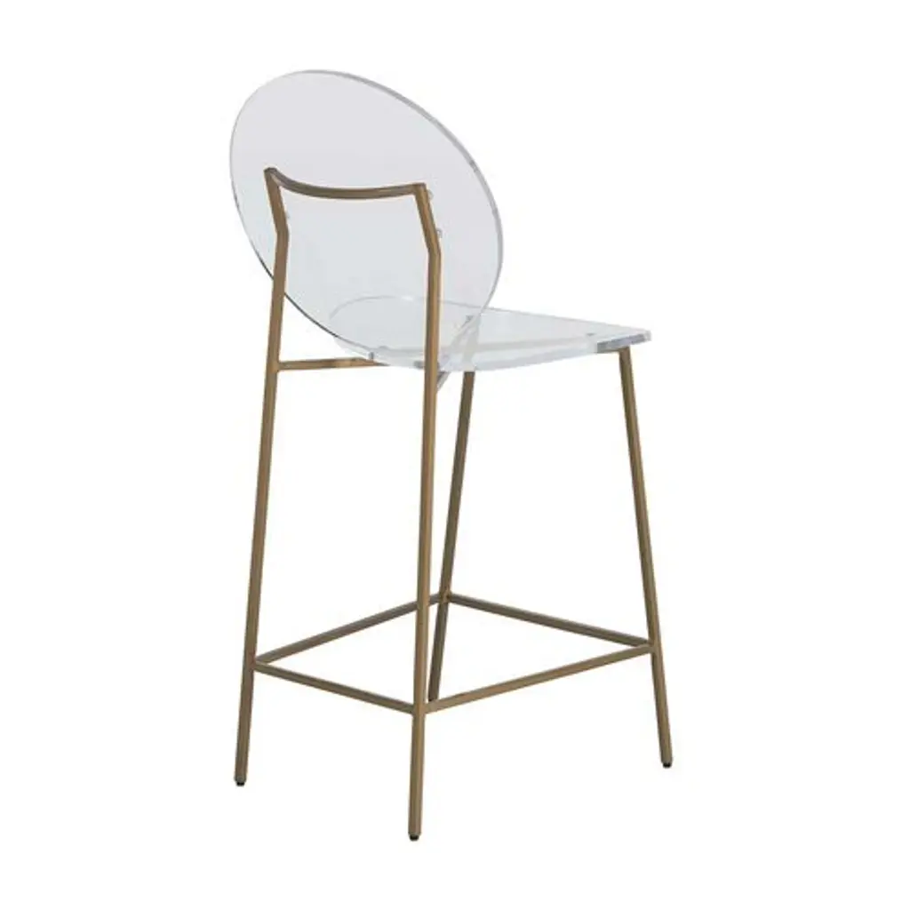The playful shell inspired Sandy Counter Stool combines a linear gold metal base with the transparency of acrylic for this feminine round back counter stool. For best care, avoid solvent based cleaners and simply dust or spot clean with a soft damp cloth.