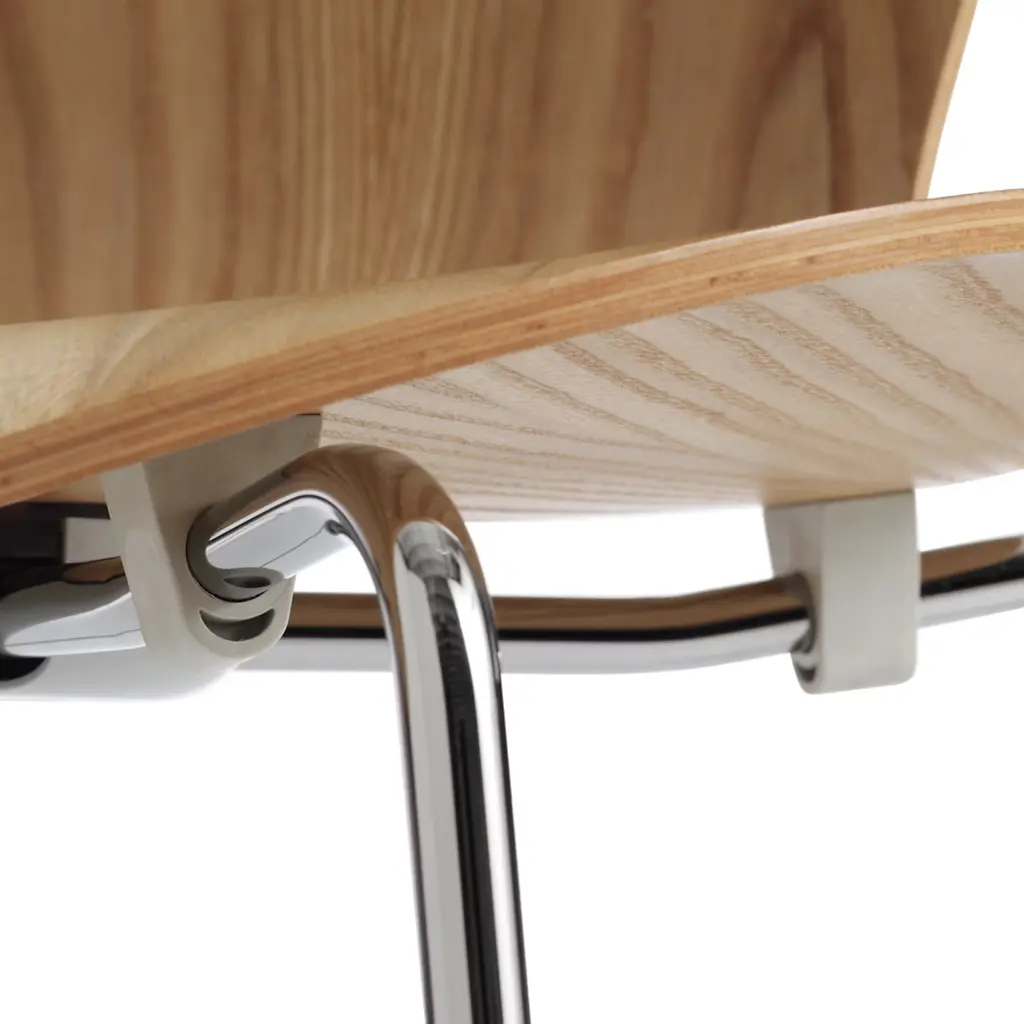 The Series 7 Chair (1955) features an ideal shape for the human form, with a back that offers just the right amount of give to keep your upper body comfortable and a waterfall seat that supports your legs without pressing into them. Arne Jacobsen shaped the core of Danish design identity with this chair by forming it from one piece of plywood narrowed in the middle to accommodate three different bends. Stacks six high. This is the authentic Series 7 Stool by Fritz Hansen. Made in Poland.