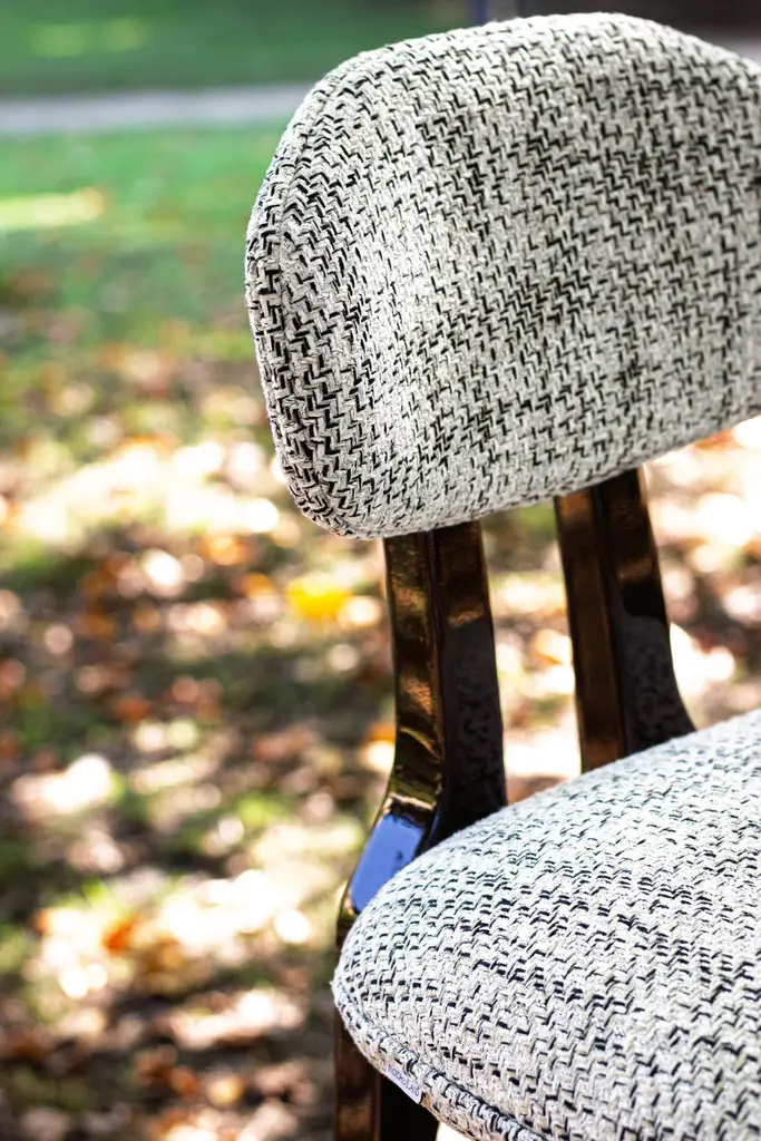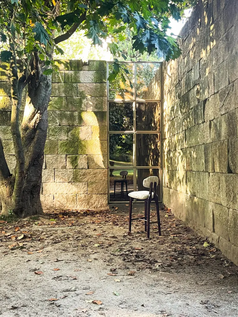 Silhouette is a surreal reminiscence of a woman’s sensual curves that arise designed in an eye catching counter stool.The joint dimension of people and objects strongly influenced the Silhouette counter stool, whose elegant wooden structure uncovers parts of a woman’s body who sits on it. The slightly curved seat draws an inviting smile that harmonizes with the structure, revealing the movement of the hips, as parts of a female body. Silhouette shows contours of a mysterious profile and presents the observer with feminine sensuality.Product detailsUpholstery: InsidherLand Mix ref. 2.Frame: wood structure with translucent dark brown in high gloss varnish.Metal: oxidized brushed brass.COM: 1 m 39,37" (Standard width 140 cm55")Product optionsFrame: lacquered in any Ral Classic color.Upholstery: InsidherLand fabrics or client fabric..Weight:9Kg 19.84 lbsMade to order. Custom sizes and other finishes are available under request.Designed by Joana Santos Barbosa, 2022. Handmade in Portugal.