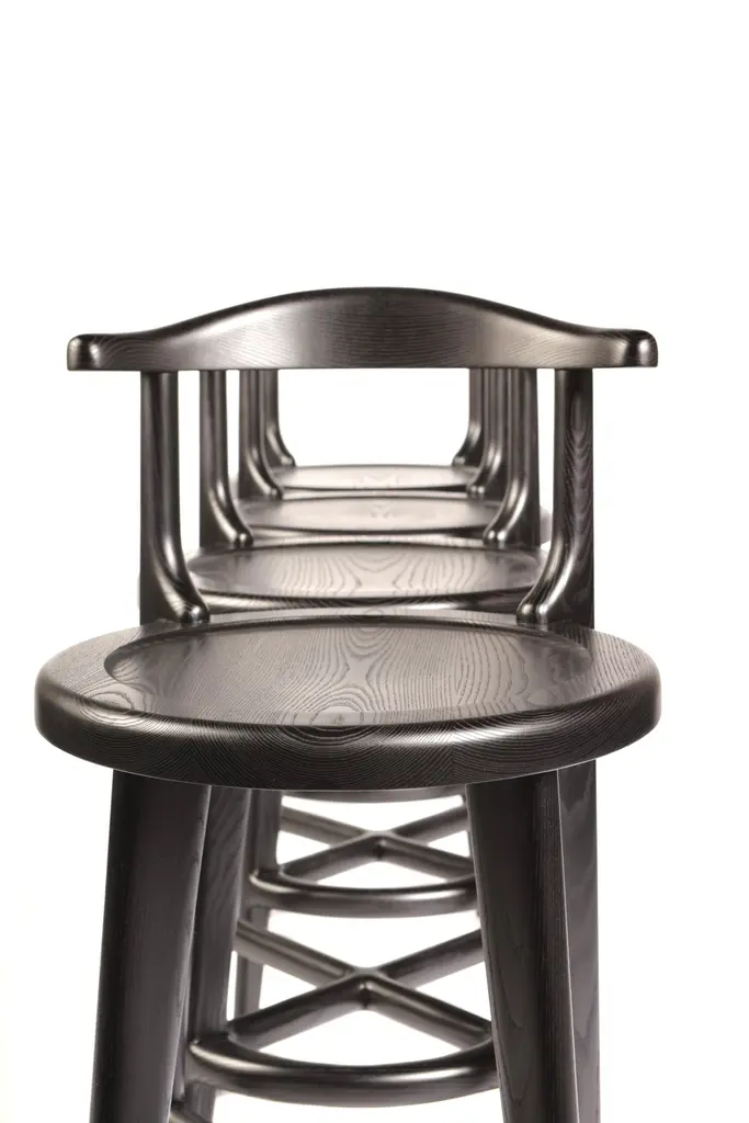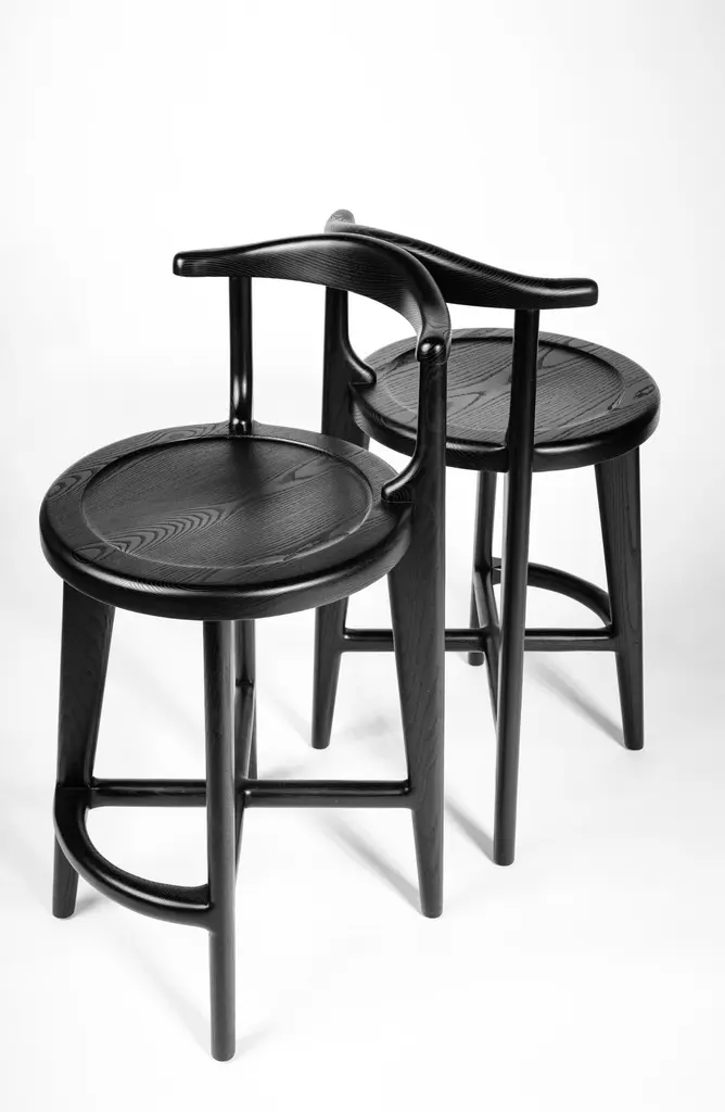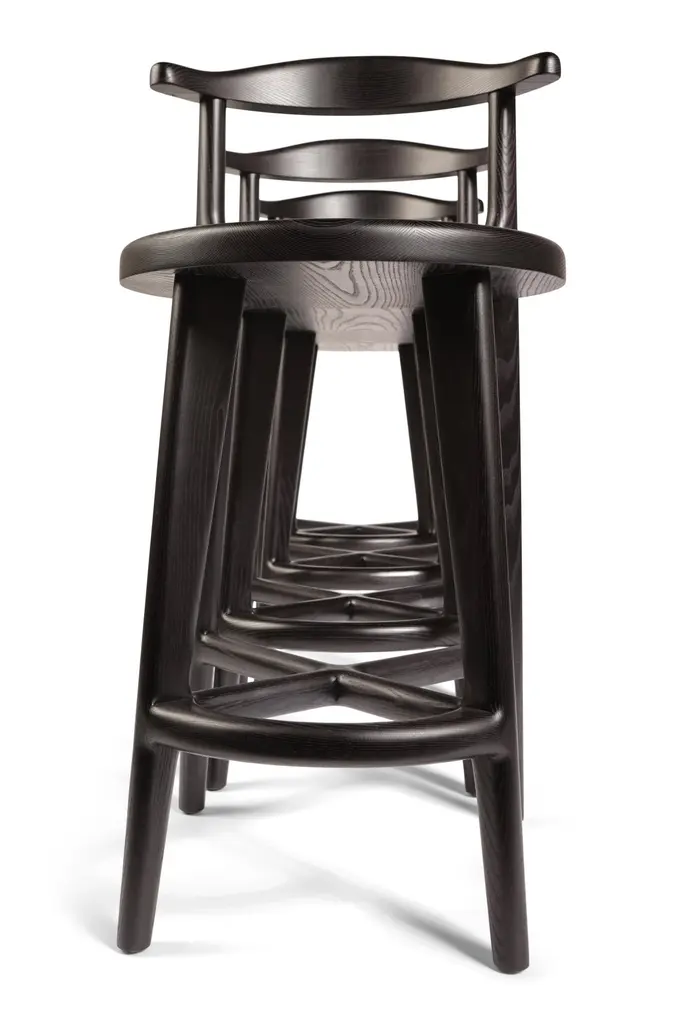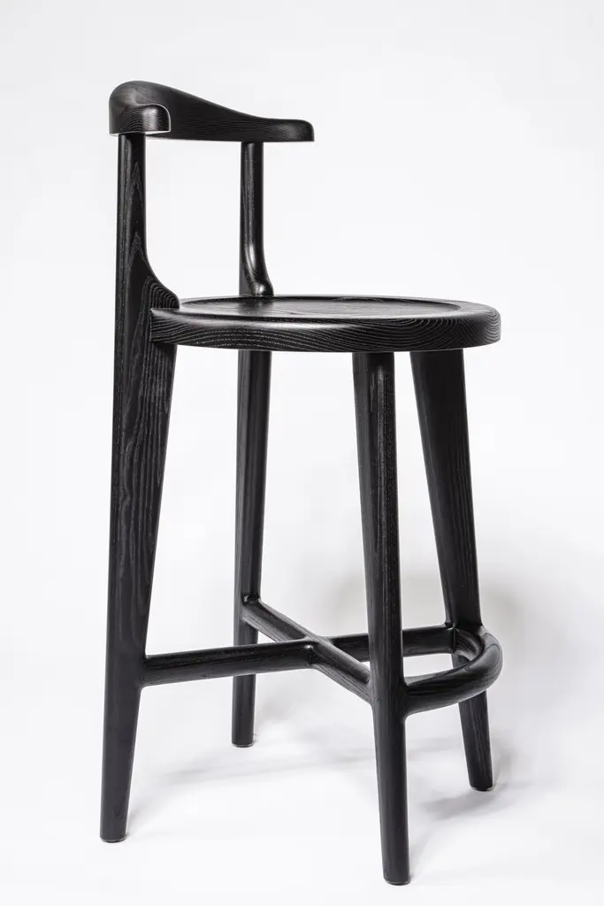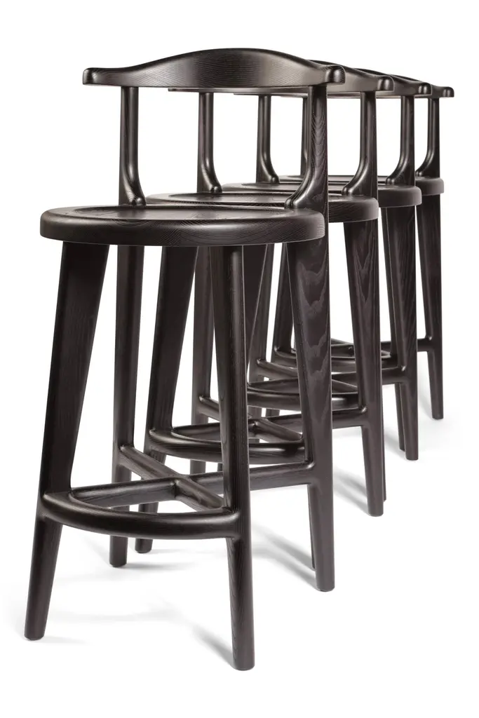 A classic design that will beautifully suit any home interior. Crafted from solid American Ash with a grain-popping jet-Black stain. Our stools feature generously sized seats and ergonomically sculpted back / arm rests.A beautifully sculpted footrest completes the design. This piece is built to order - bespoke options always available. Wood species include white oak, blackened or invisible ash, black walnut and more. Sizing can be modified to suit (counter height, bar height, or other). Also available without backrest. Additional photos available on request.