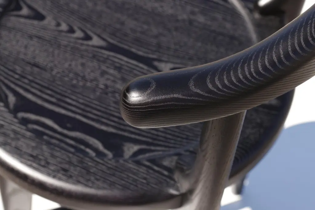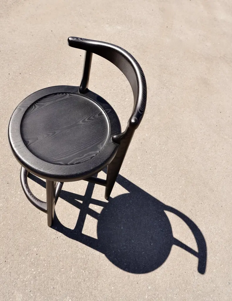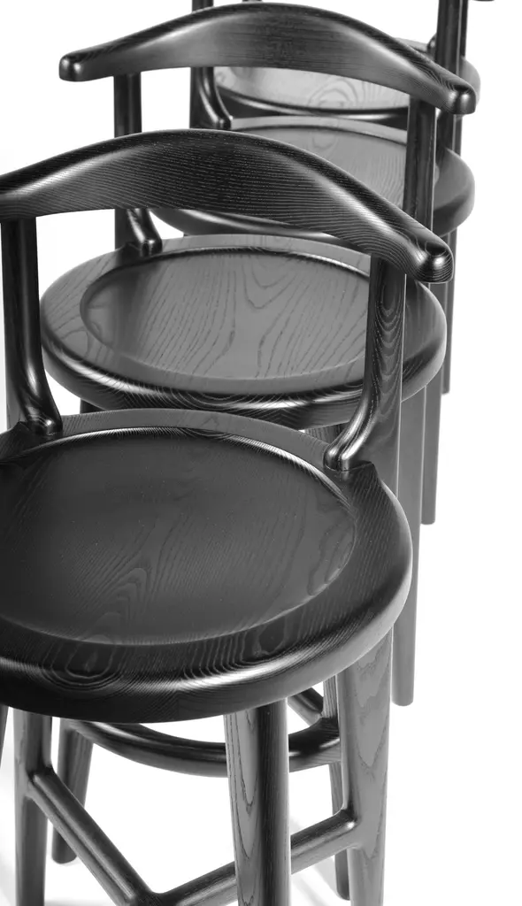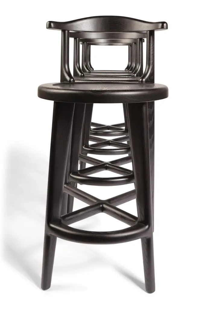 A classic design that will beautifully suit any home interior. Crafted from solid American Ash with a grain-popping jet-Black stain. Our stools feature generously sized seats and ergonomically sculpted back / arm rests.A beautifully sculpted footrest completes the design. This piece is built to order - bespoke options always available. Wood species include white oak, blackened or invisible ash, black walnut and more. Sizing can be modified to suit (counter height, bar height, or other). Also available without backrest. Additional photos available on request.