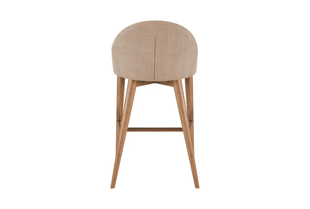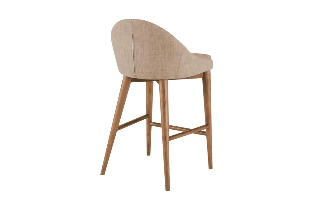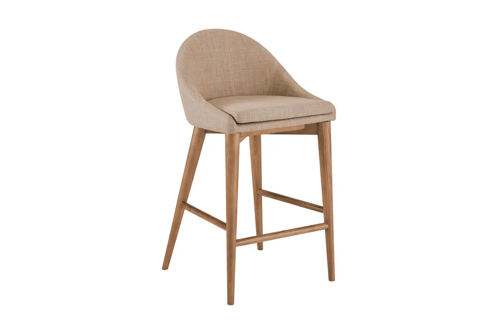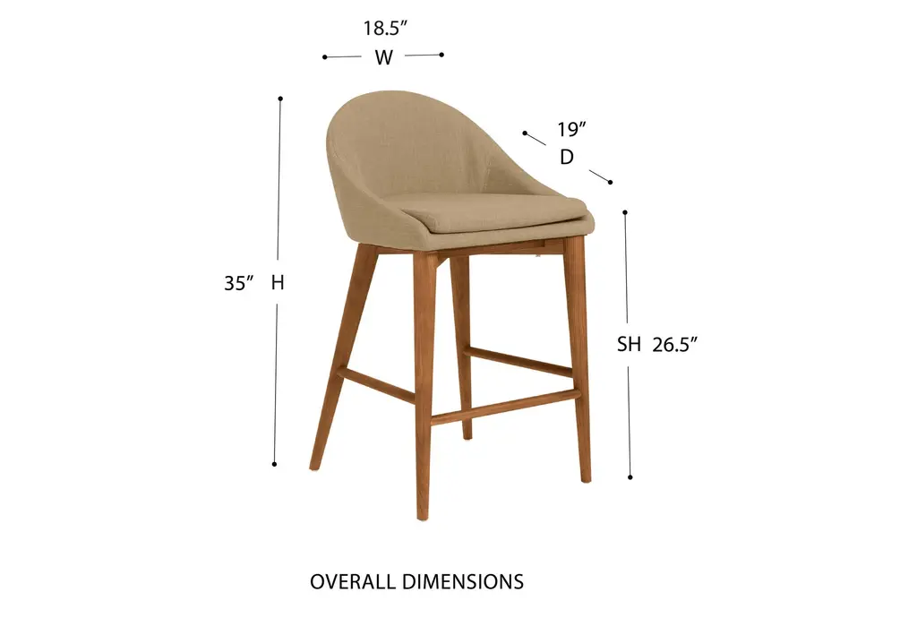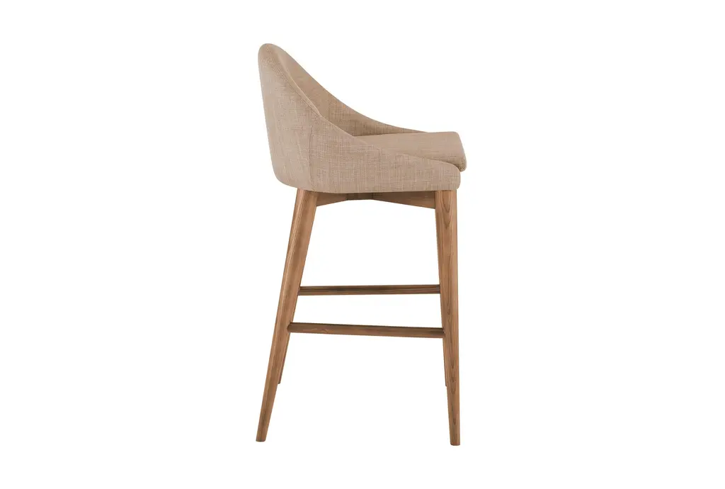 The Tan Contract Grade Mid-Century Modern Fabric Curved Back 26" Counter Height Stool is a perfect addition to your dining room or kitchen. It combines comfort and style with its fabric over foam construction and walnut legs. Designed for durability, this stool features a footrest and tapered legs for added support.