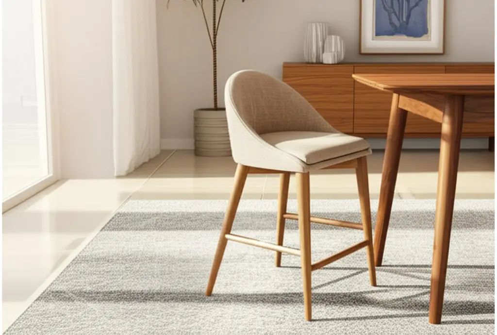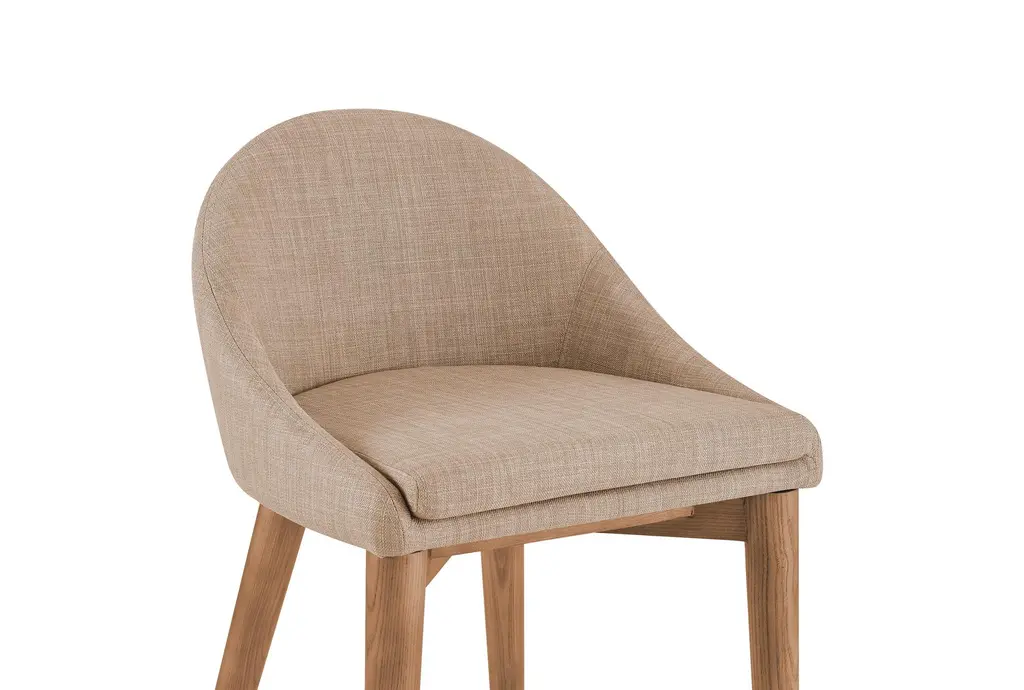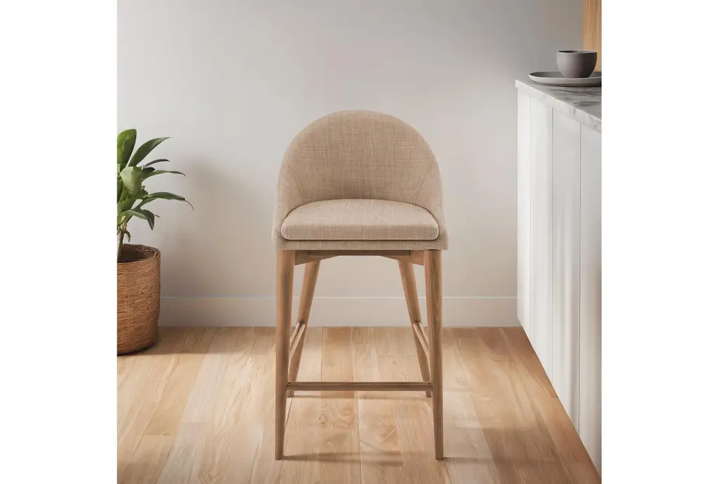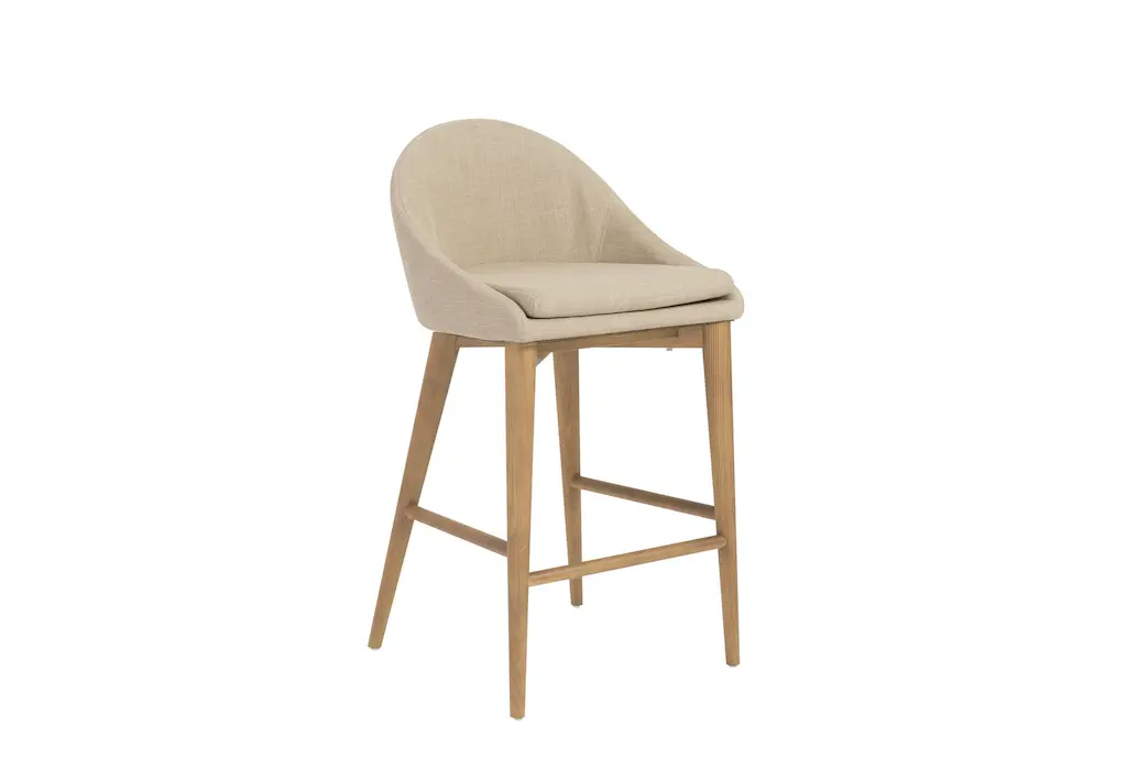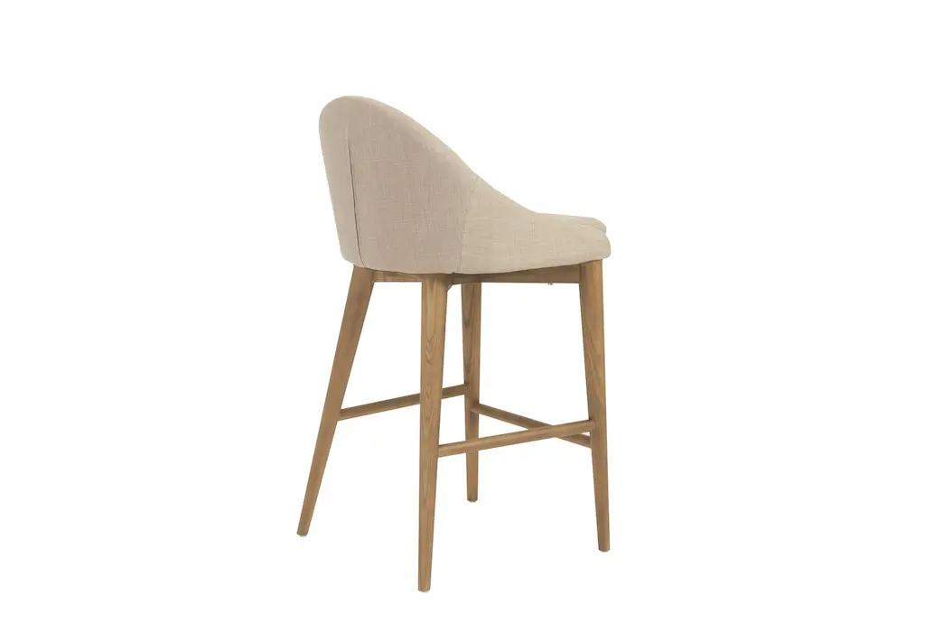 The Tan Contract Grade Mid-Century Modern Fabric Curved Back 26" Counter Height Stool is a perfect addition to your dining room or kitchen. It combines comfort and style with its fabric over foam construction and walnut legs. Designed for durability, this stool features a footrest and tapered legs for added support.