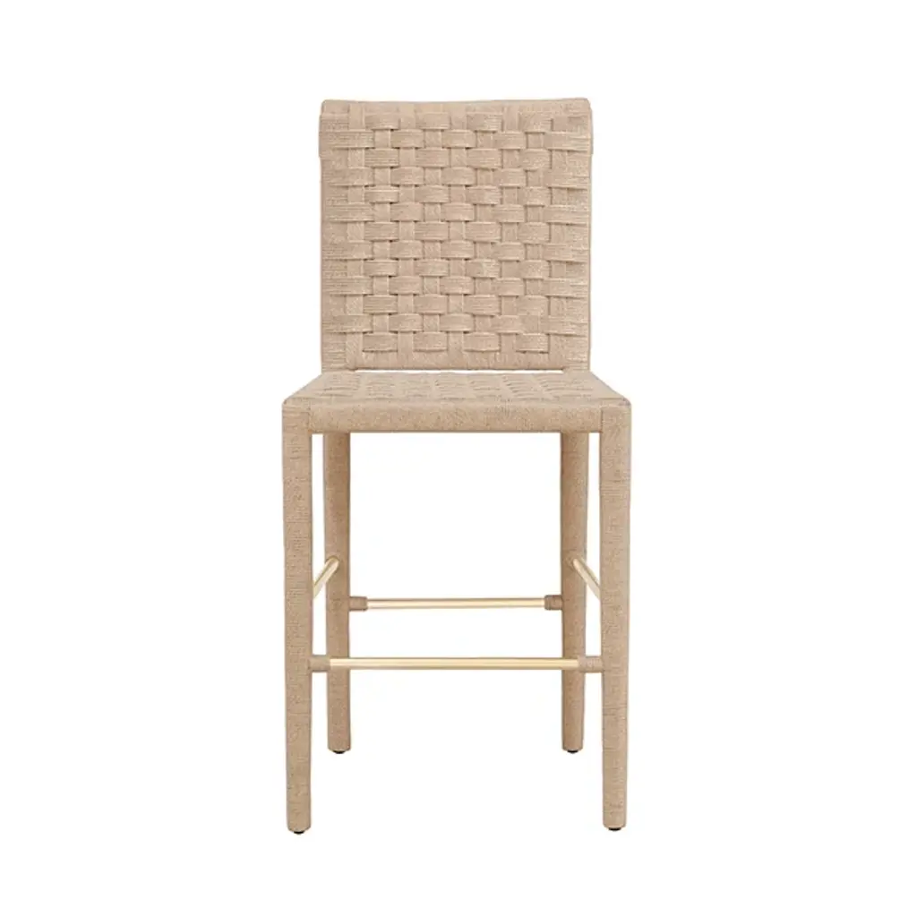 Natural rope basketweave pattern counter stool with antique brass stretcher by Worlds Away.