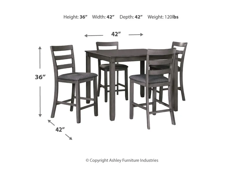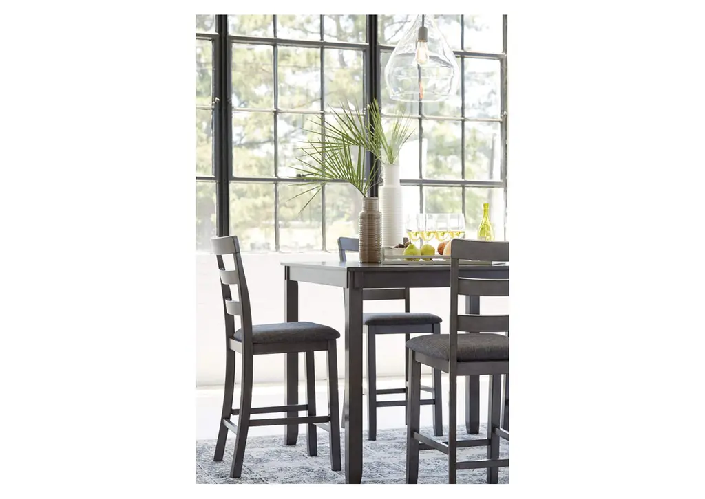 It’s so easy being gray—at least the Bridson 5-piece dining set makes it seem that way. This transitional counter-height table and barstool ensemble sports a charcoal gray finish with textured gray upholstery for an on-trend and relevant appeal. Plushly upholstered seat cushion in a practical polyfiber makes it a pleasure to linger at the table. Best of all, square table design is ideally suited for small spaces. Weight 138.000 lbs. (62.1kgs.)
