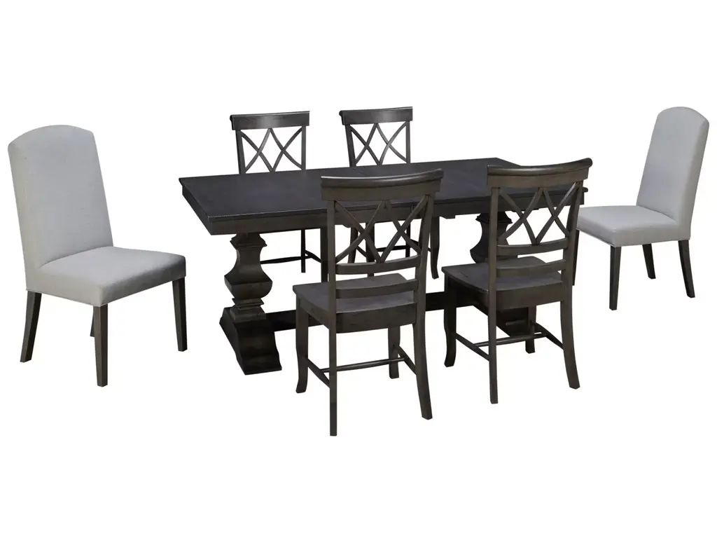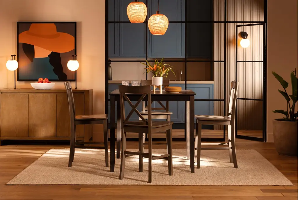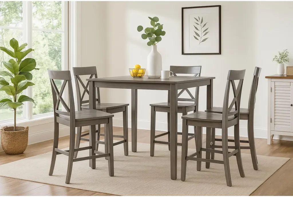 The Percy Grey Square Wood 42" Kitchen Counter Height With X Back Chairs Set For 4 is perfect for casual dining and kitchen spaces. This set features a square table and four matching X-back chairs, all in a soothing grey color. Constructed from wood and MDF, this counter height set offers a blend of durability and classic style.