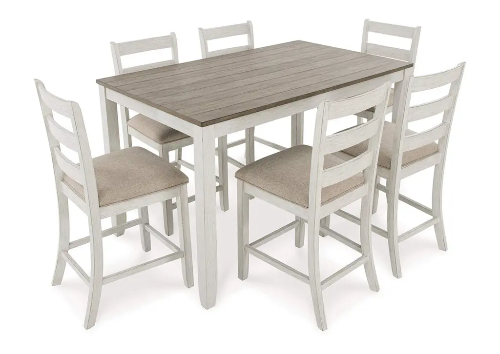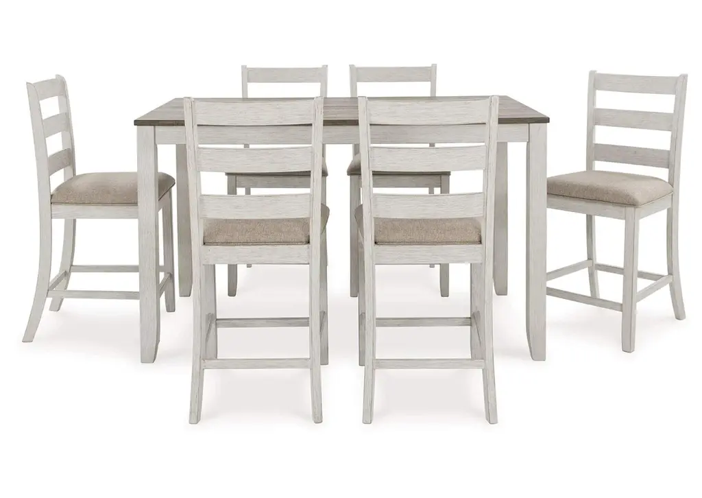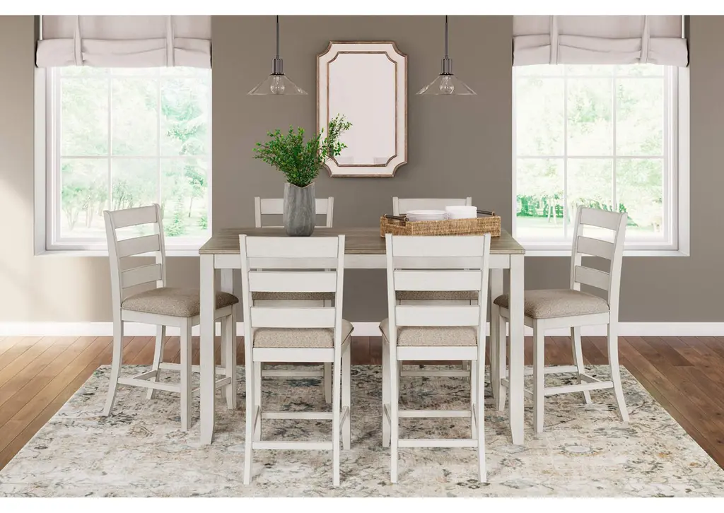 Set the scene for coastal chic or modern farmhouse living with the Skempton counter height dining set. The clean-lined, simply striking table doubles the charm with a brown plank effect top, paired with a grayish white base with a rub through effect for timeworn appeal. Six bar stools with classic ladderback styling and comfortably upholstered seats make room for one and all. Weight 205.000 lbs. (92.25kgs.)