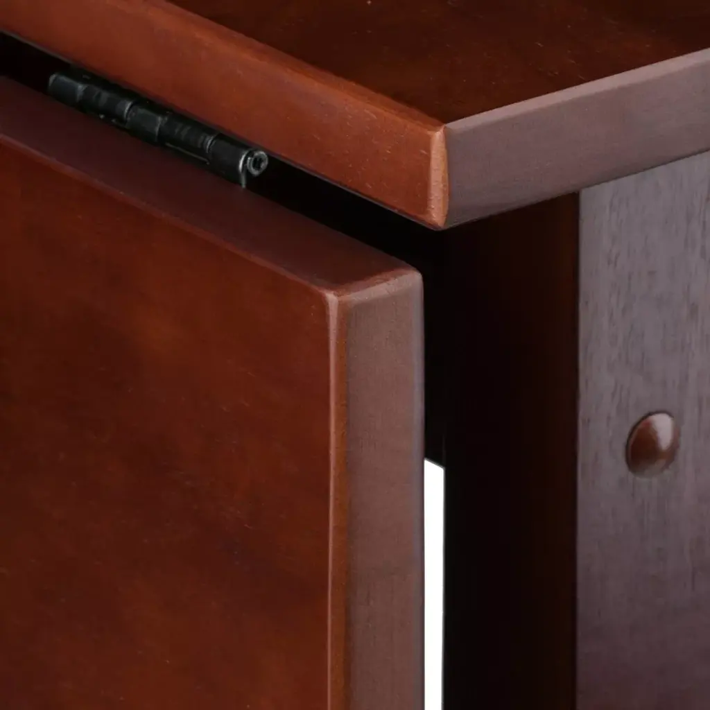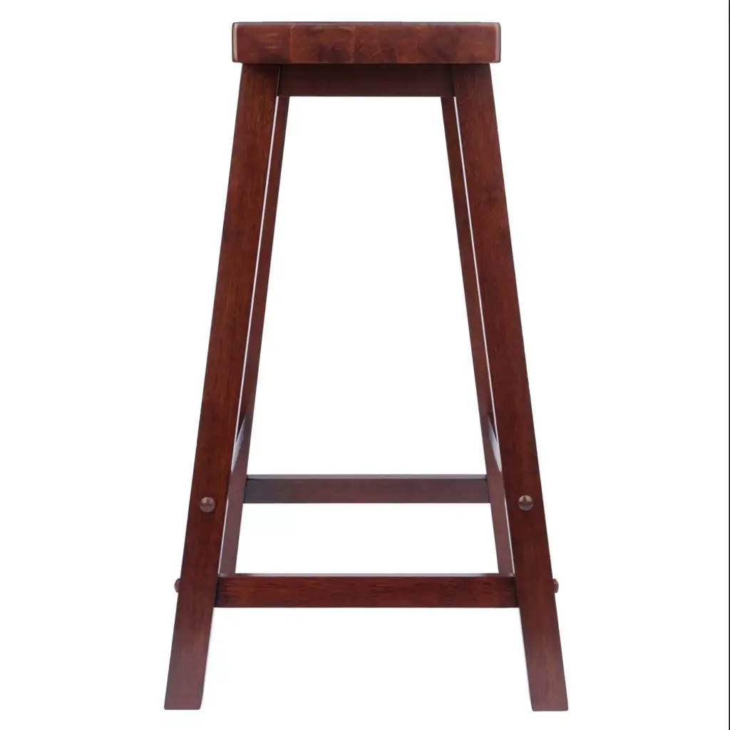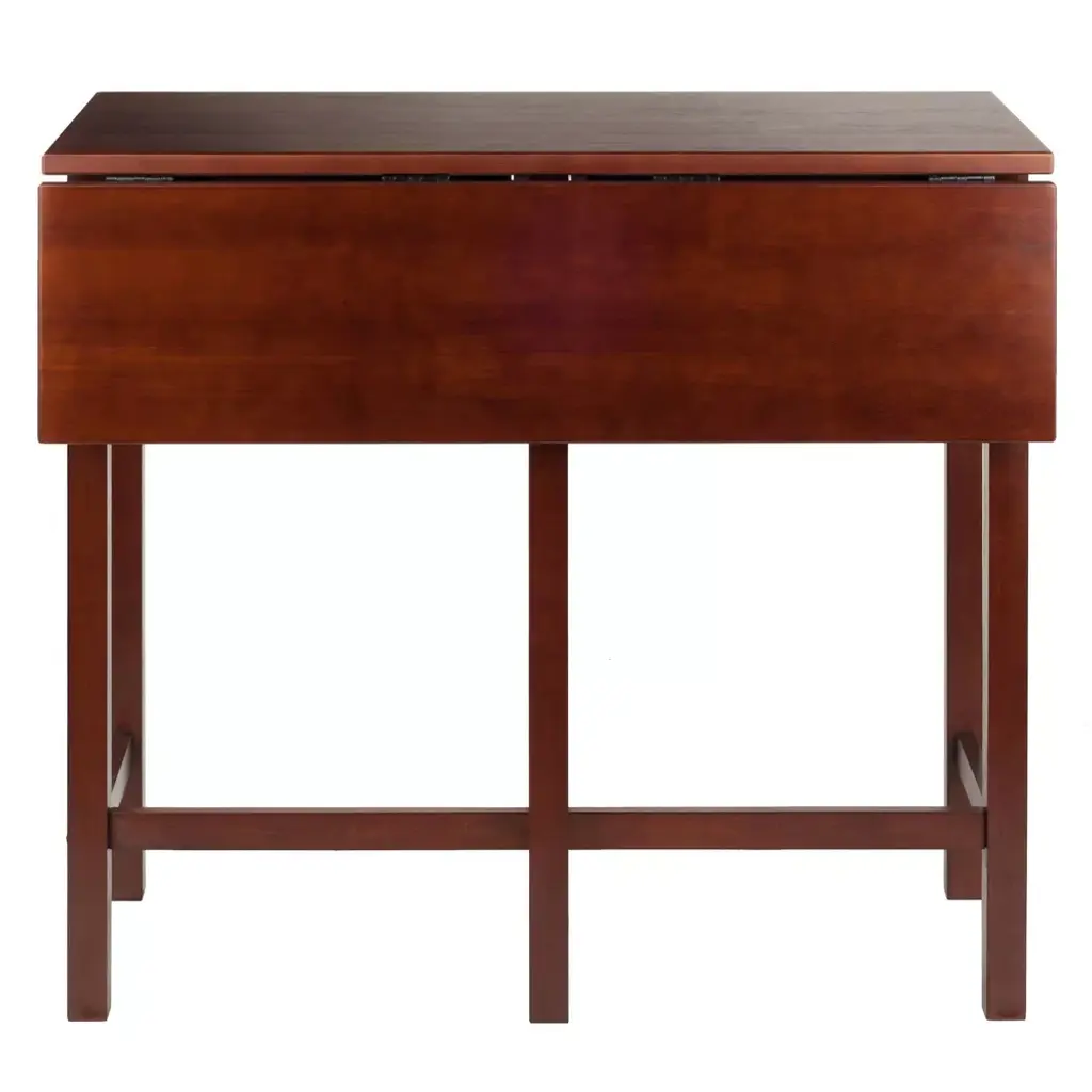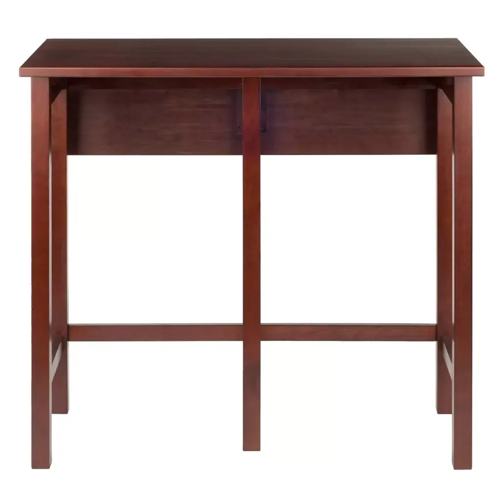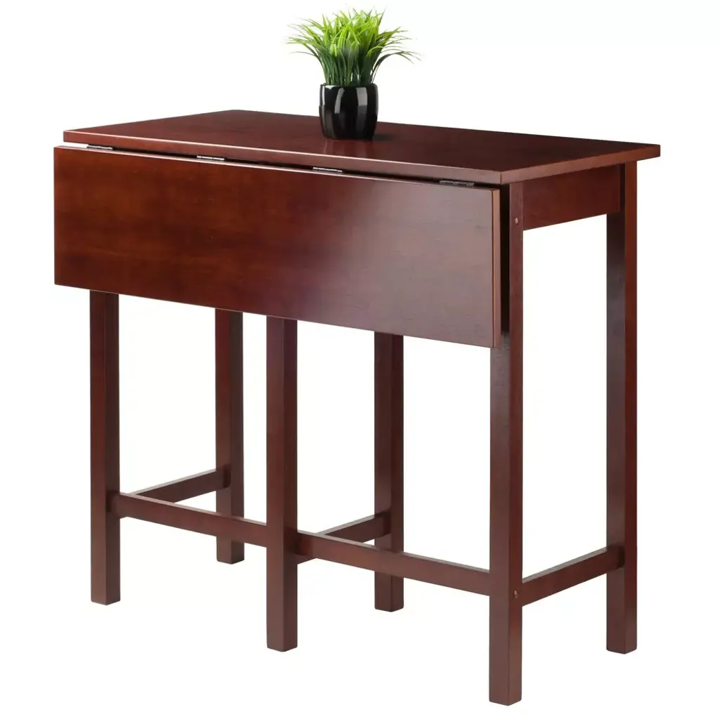 The set comes with a high table and two saddle seat stools. The table is versatile that is space saving and functional. A leaf is folded down for space saving and when in use lift up the leaf for an extension of top surface. Top table area when leaf is up 39.37"W x 30"D x 35.43"H. Table when leaf is folded 39.37"W x 20.70"D x 35.43"H. Drop leaf 39.37"W x 10.31"D. Saddle Seat Counter Stool is 24" Seat height. Constructed in solid wood in warm Antique Walnut Finish. Ready to Assemble.