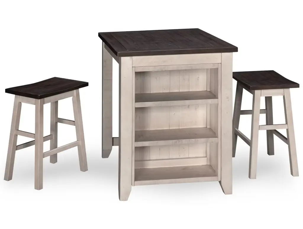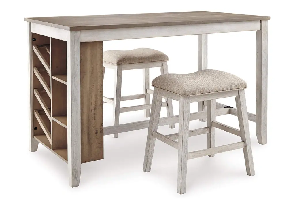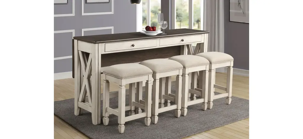 Waverly Counter Height Table and Four Stools - the perfect blend of style, functionality, and versatility for your dining space. Crafted with meticulous attention to detail, this remarkable set combines contemporary design with practical features to enhance your dining experience. The centerpiece of this set is the Waverly Counter Height Table, designed to impress. Its sleek and modern silhouette is complemented by a stunning drop leaf feature, allowing you to effortlessly expand the seating capacity from four to a generous eight people. Whether you're hosting a cozy dinner with friends or a lively gathering with extended family, this table effortlessly adapts to accommodate everyone. The Waverly Counter Height Table boasts two convenient drawers, providing ample storage space for your dining essentials. With smooth ball bearing guides, accessing and organizing your cutlery, napkins, or placemats has never been easier. Say goodbye to cluttered surfaces and embrace a more organized dining area. Designed with your space-saving needs in mind, this table truly shines. Its cleverly engineered construction allows it to expand for larger gatherings, while still maintaining a compact footprint when not in use.