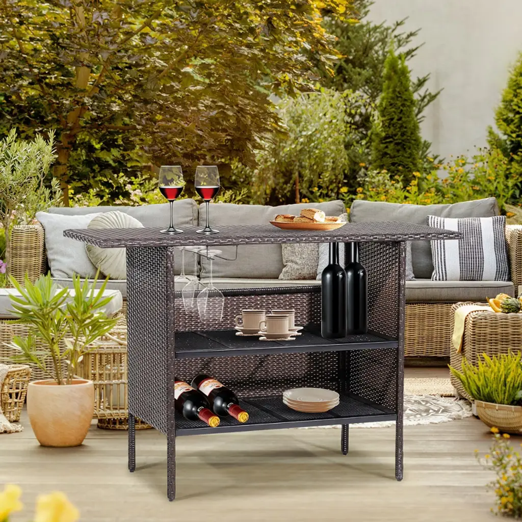 Our bar table provides a comfortable place for you to drink and chat with friends outdoors and enjoy the warmth of the sun. The suitable height of the table will make you feel very comfortable to sit around. Its large and classified storage space allows you to put wine, snacks, and drinks on the shelves for your convenience, so you can enjoy them anytime. Furthermore, the table is super sturdy with the reinforced steel structure and adjustable footpads. Meanwhile, the simple and elegant style also makes it a beautiful decoration for your balcony or garden, and will give you a feeling of relax ation and happiness when you relax with your family or friends. Imagine how you will spend your wonderful time with it. FeaturesMultifunctional storage with wide tabletop and 2 shelves 2-rail stemware rack is perfect to hang 4 wine glasses Solid steel frame ensures high stability and weight capacity Powder-coated surface prevents steel pipes from rust Adjustable footpads highly increase the stability Premium PE rattan is elegant and weatherproof Ideal for backyard, poolside, deck, etc. Easy to assemble with the help of clear instructionColor: Mix Brown Material: PE Rattan, Steel Overall Dimension: 55'' x 18.5'' x 36'' (L x W x H) Net Weight: 35 lbs Weight Capacity of Tabletop: 77 lbs Weight Capacity of Top Shelf: 33 lbs Weight Capacity of Bottom Shelf: 165 lbs Package Includes: 1 x Patio Bar Table 1 x Instruction