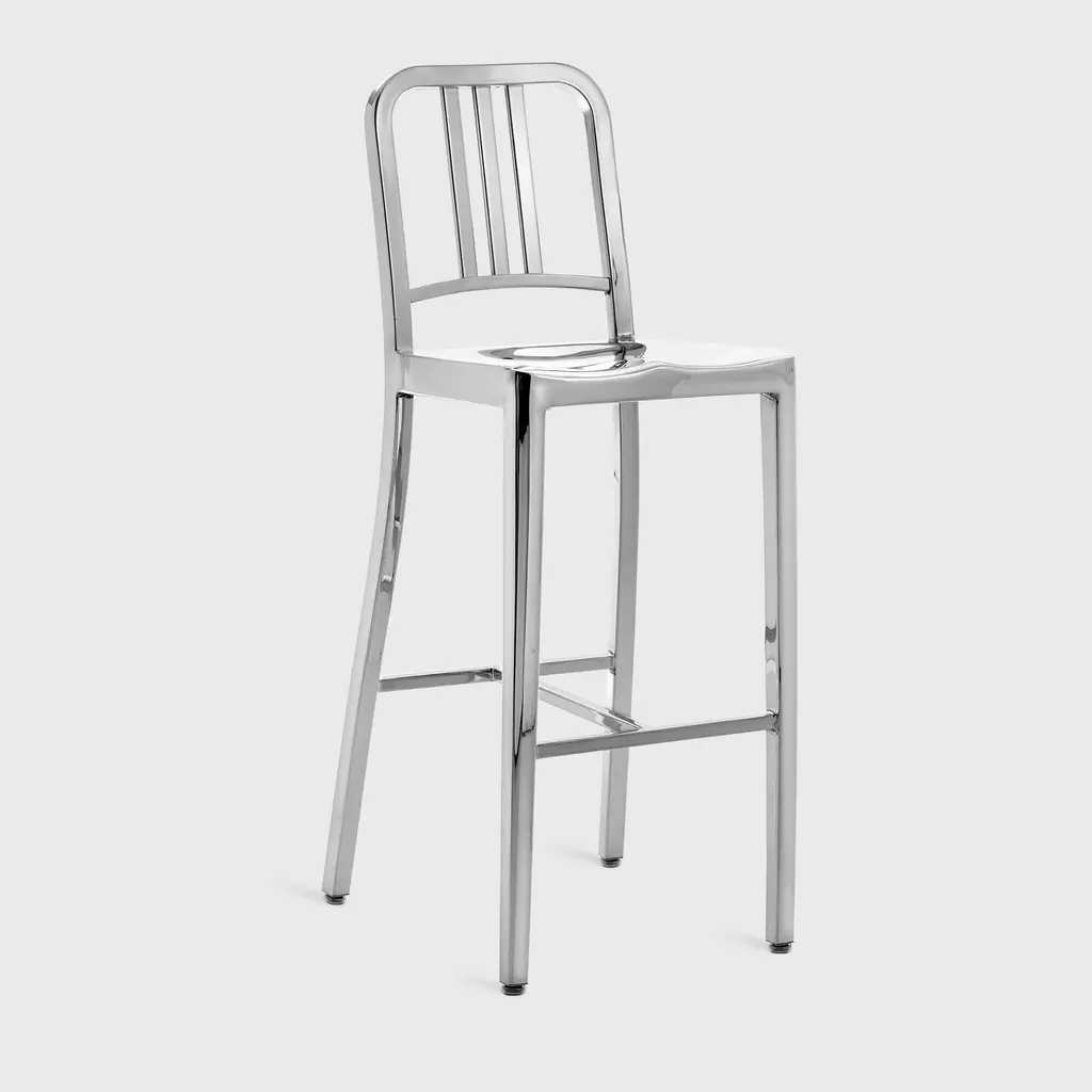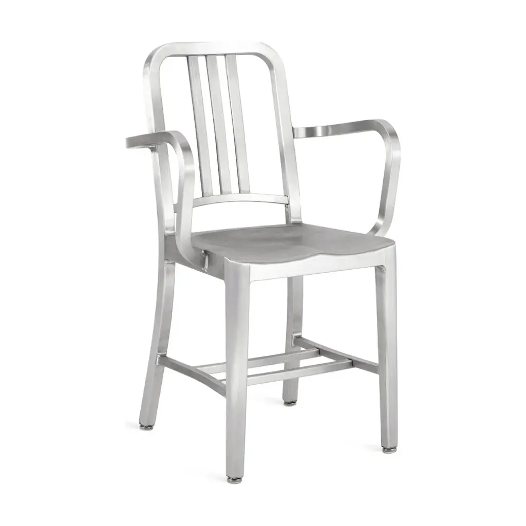 A legendary design, ready to make your home look more refined. First made for the US Navy and submarine use in 1944, the Navy Chair has become one of the most iconic chair designs of the 20th-century and beyond. Made by Emeco, the chair is now available in various versions that keep the original’s style intact. This Navy Counter Stool with Arms is perfect for kitchens and bars thanks to its height. Apart from the curved seat, the stool also features curved armrests and a footrest for more comfort. Like all of the other chairs from the Navy line, this stool is made of recycled aluminum through a complex 77-step manufacturing process. Backed by a lifetime warranty from Emeco, this counter stool will be a part of your home forever.