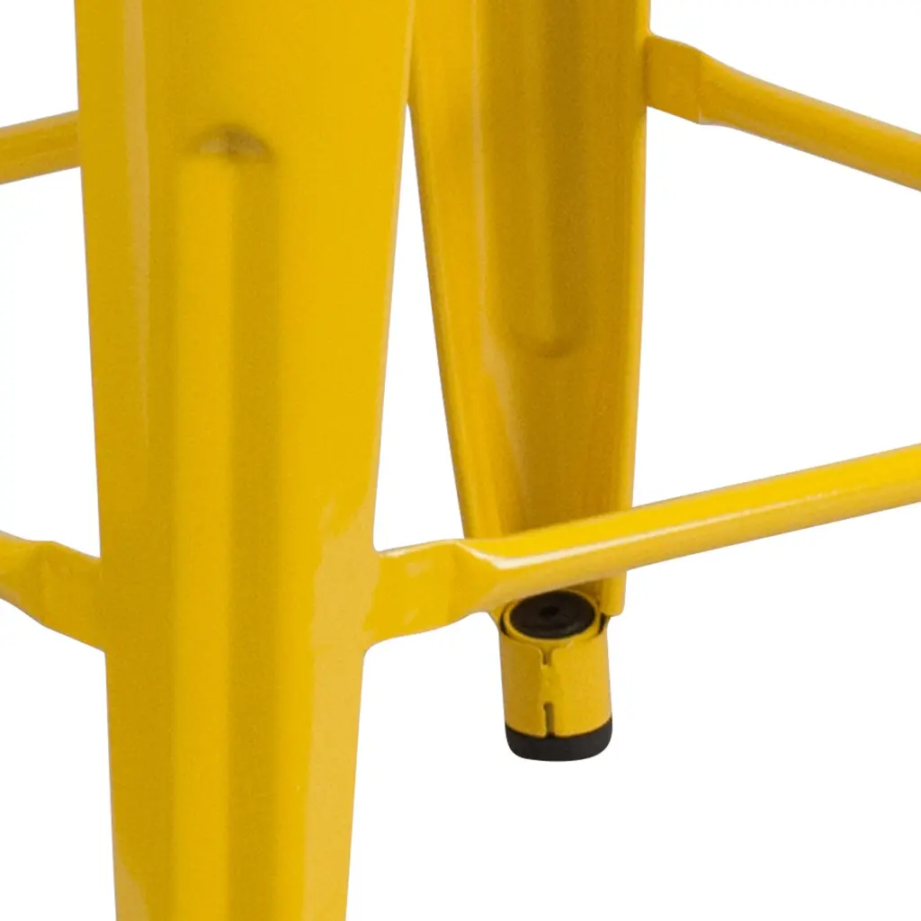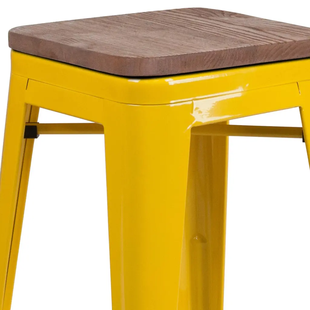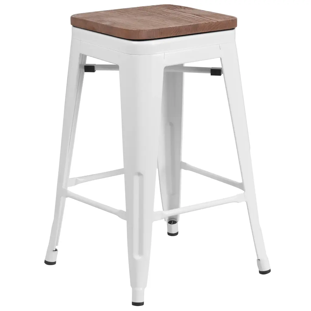 Save on space with this Backless Metal Counter Stool with wood seat. The clean lines and simple design of this square, industrial style stool will look great in your kitchen or inside your bar/restaurant.Designed to stack, this stool is an ideal choice in the restaurant industry. A cross brace underneath the seat adds extra stability and features plastic caps that prevent the finish from scratching when stacked. The lower support brace doubles as a footrest, and floor glides protect your floor by sliding smoothly when moving it.Designed for both commercial and residential use, this counter stool will provide refreshing rustic feel with its metal and wood features.