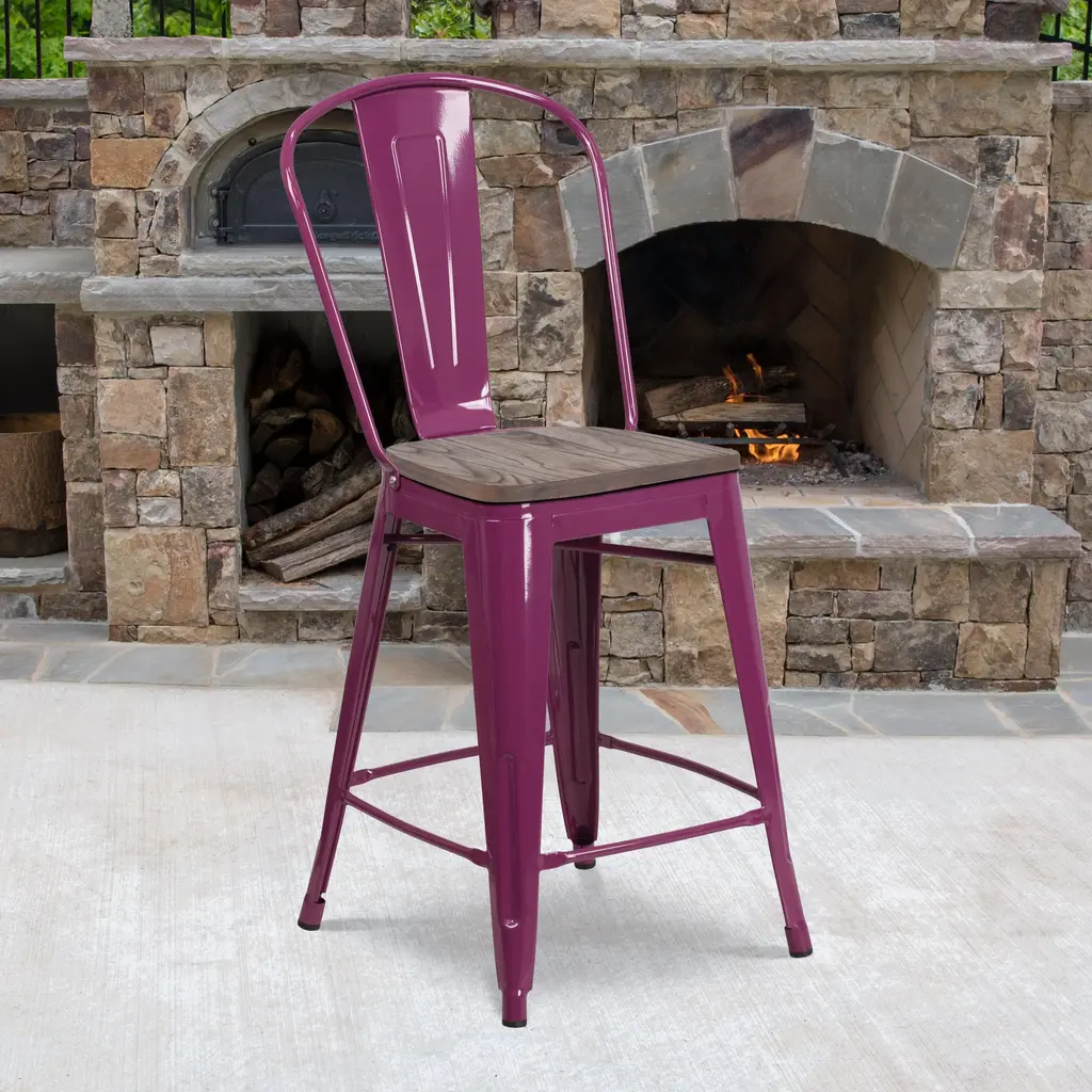 24" High Metal Counter Height Stool With Back And Wood Seat
