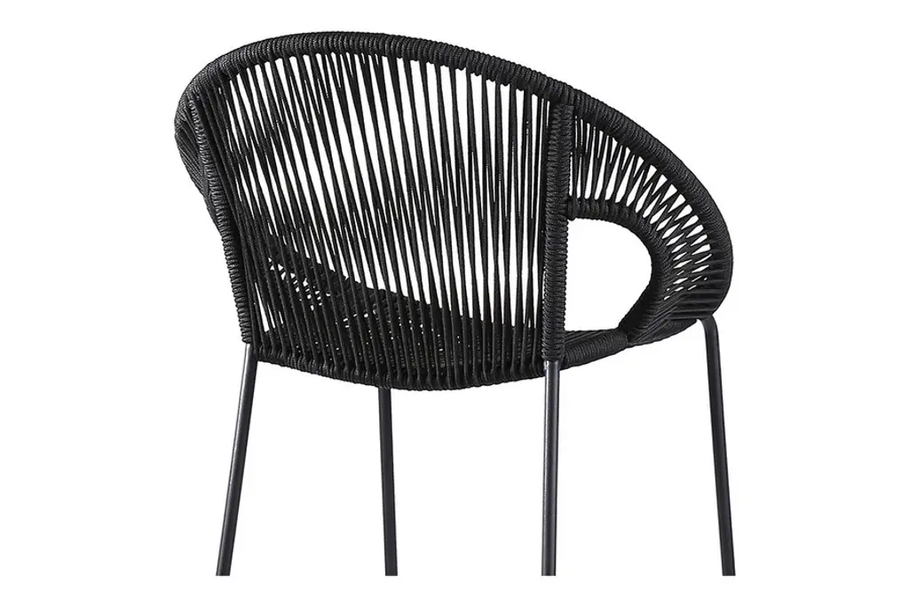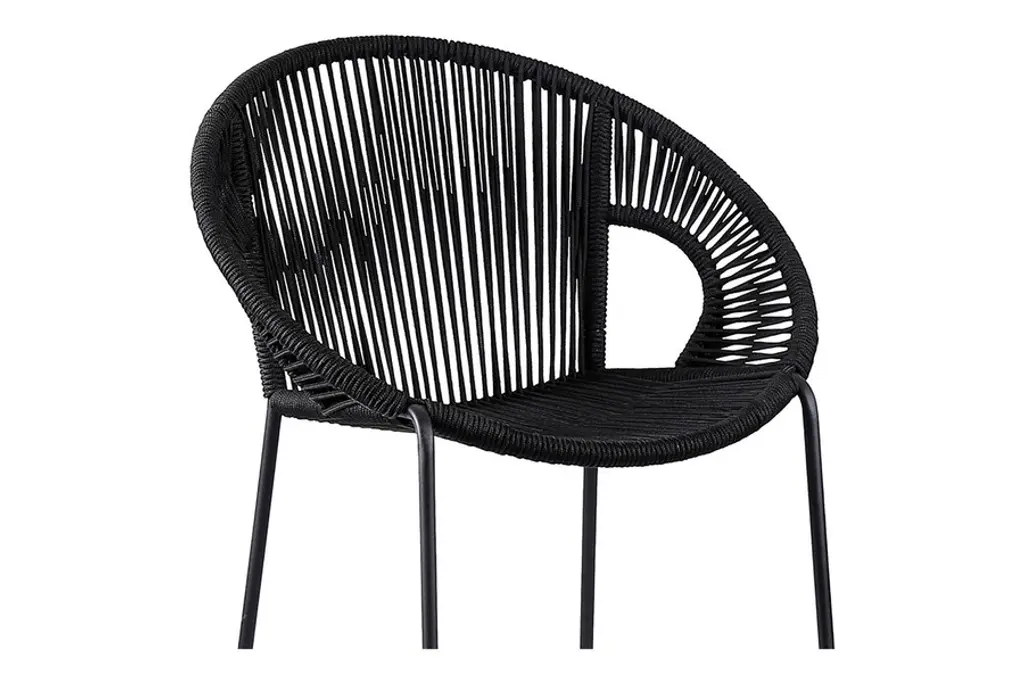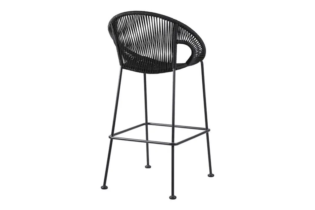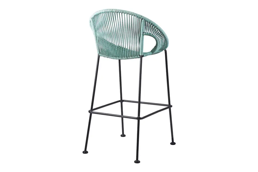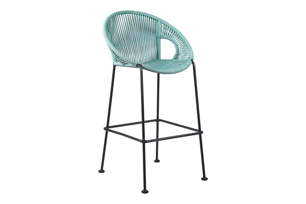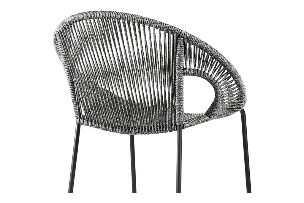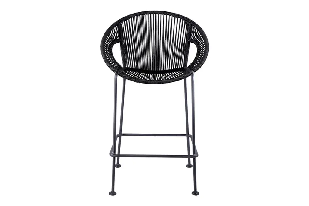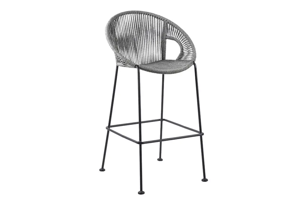 The forecast today is great modern style built for everyday outdoor use with the Acapulco Indoor Outdoor Counter Stool. Featuring a versatile exotic regatta rope corded seat in a festive vertical string layout, this outdoor barstool is capable of withstanding the elements while providing endless hours of comfort as you relax and sip on your favorite refreshing beverage. Its prominent rounded backrest seamlessly flows into gracefully curved armrests emphasizing its neatly perforated corded pattern. Its tall stature is emphasized by hairpin style steel legs with a stabilizing footrest and supportive reinforced stretchers. Its resilient and durable construction does not overshadow its comfortable ergonomic design. It is entirely made for time well spent outdoors hanging poolside or indoors seated at your in-home bar front.