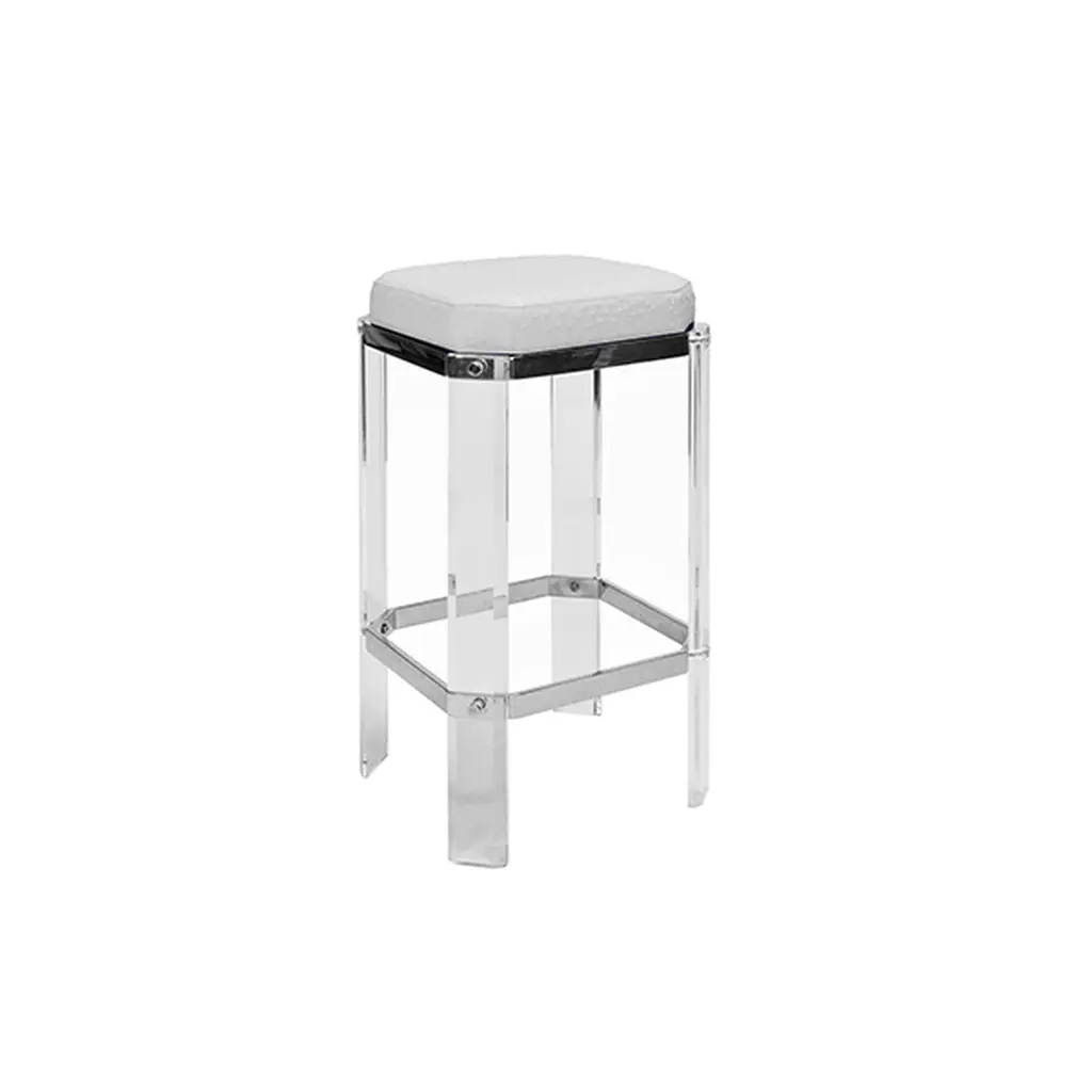 With a nod to Hollywood's Golden Age, our opulent Dorsey counter stool will channel your inner celebrity. Faceted lucite legs are studded with polished nickel accents, and its luxurious navy velvet or white ostrich cushion finishes this glamour shot.