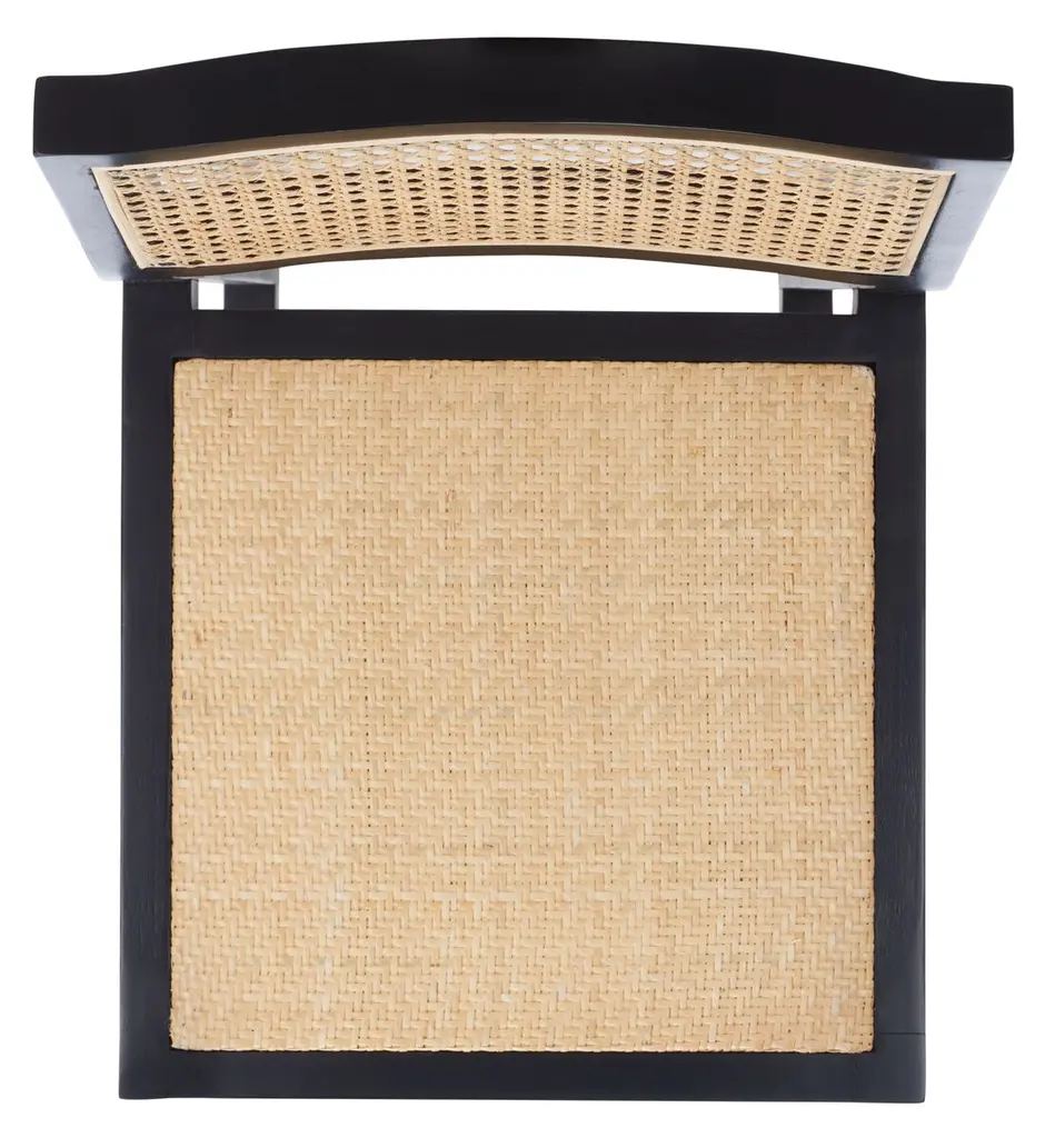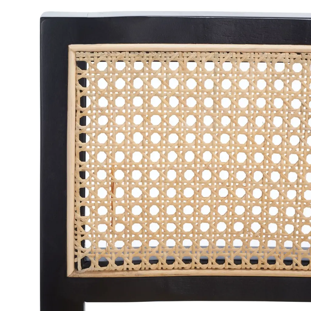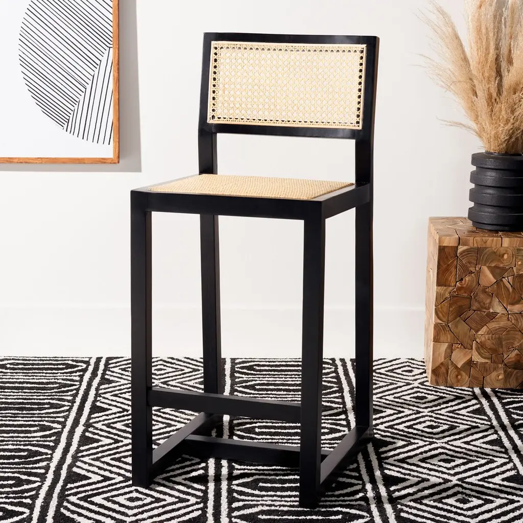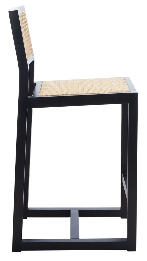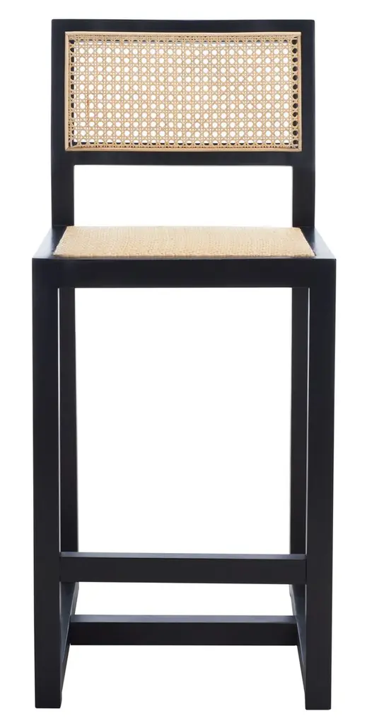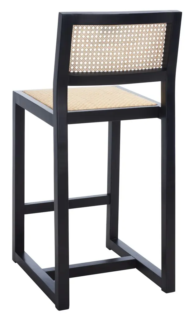 The woven cane seat and back give this counter stool a tropical airiness that complements its streamlined silhouette.