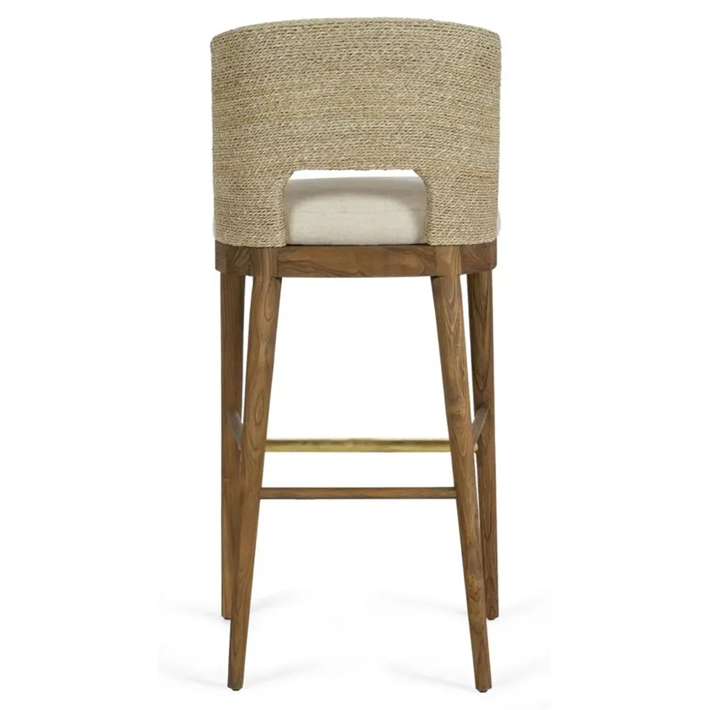 Adelyn Coastal Brown Teak Handwoven Seagrass Back Grey Performance Counter Stool