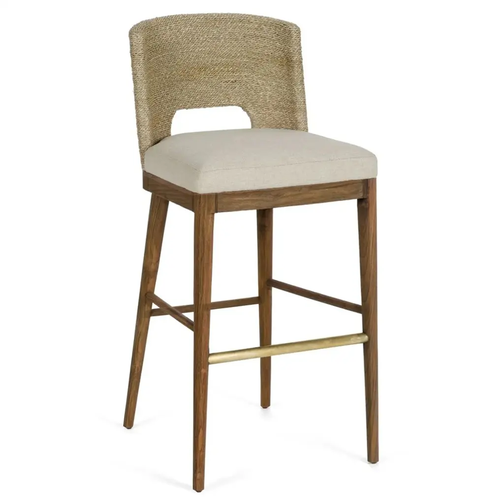 Add coastal charm to your dining area with our Adelyn Coastal Brown Teak Handwoven Seagrass Back Grey Performance Counter Stool. This designer counter stools is crafted from teak wood, sea grass, and brass, and is the perfect seating option for counters and kitchen islands. Plus, it features a brass footrest.