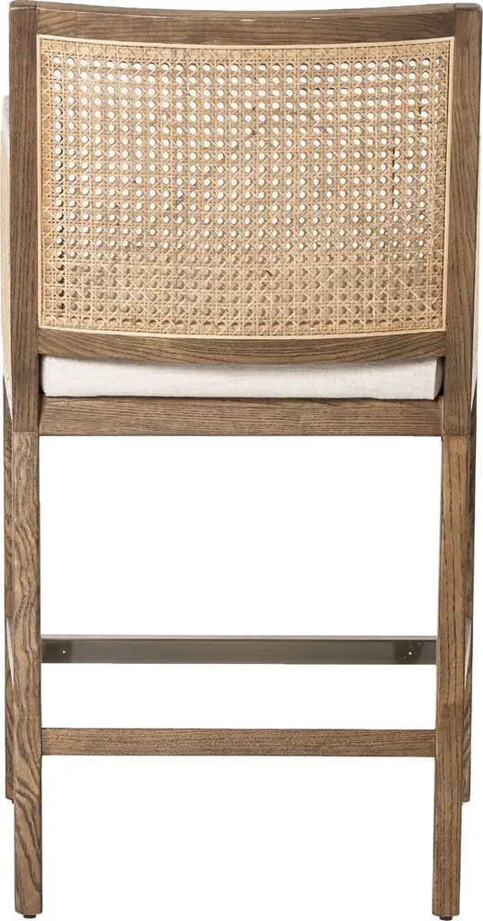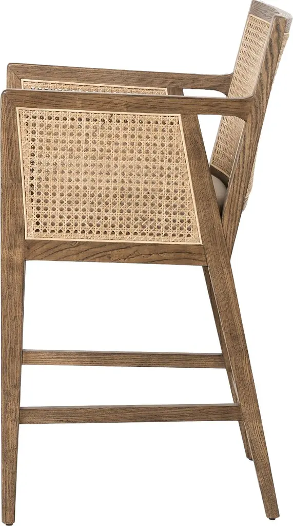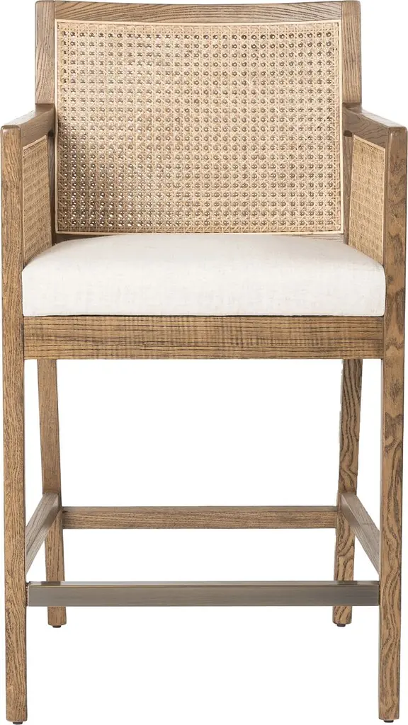 This counter stool's cane back and side inserts provide an inviting textural contrast to the durable (and sustainable) parawood frame. The amply filled seat cushion ensures optimal comfort, while the brass finish of the iron footrest adds a warm glimmer.