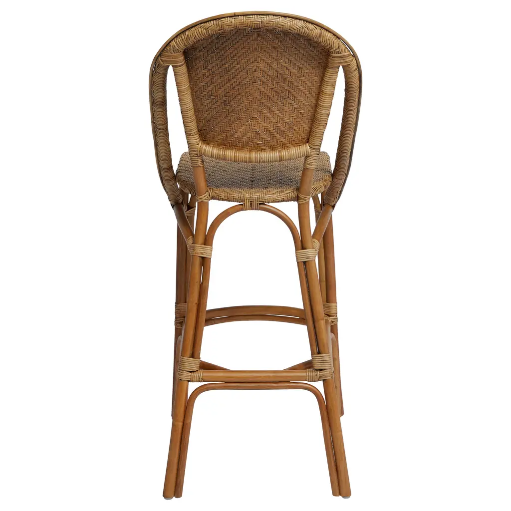 Inspired by Parisian bistro barstools, the Alanis Rattan Stool is an elegant complement a contemporary bar or dining counter. Handcrafted of sustainably grown rattan, the design showcases a herringbone weave on the back, arms and chair seat. Reinforced legs and footrest add to the durability of this charming stool, which brings an elegant update to your home bar or elevate the seating in a café, bar or restaurant. Features