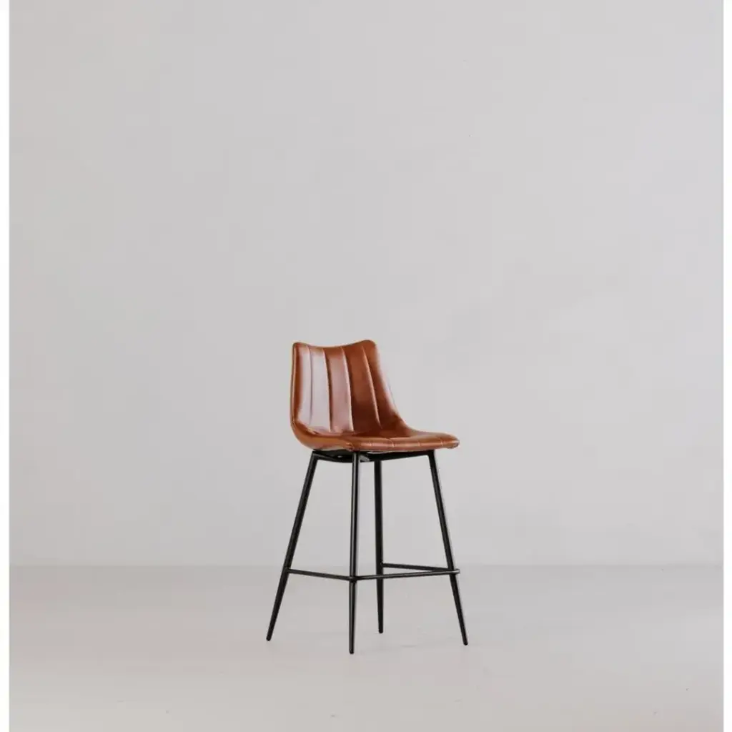 Contemporary modern counter stools get a new take with this sleek aesthetic. The Alibi counter stool features striking vertical line stitches that add subtle detail to its monochromatic design. A Soft faux leather seat is shaped to fit for comfort so guests can relax at the island or bar counter.
