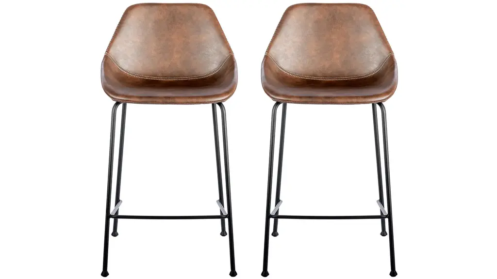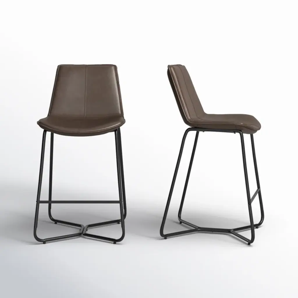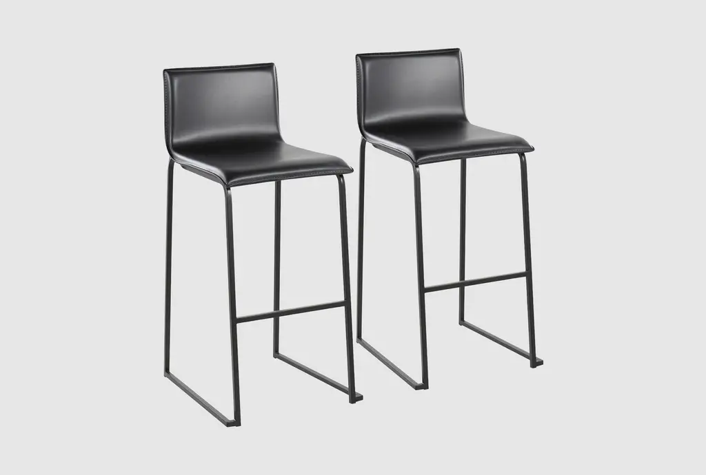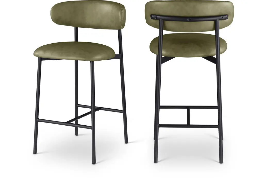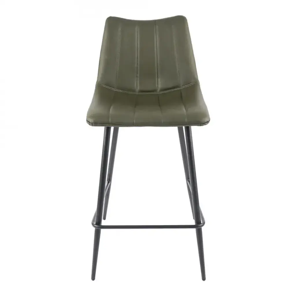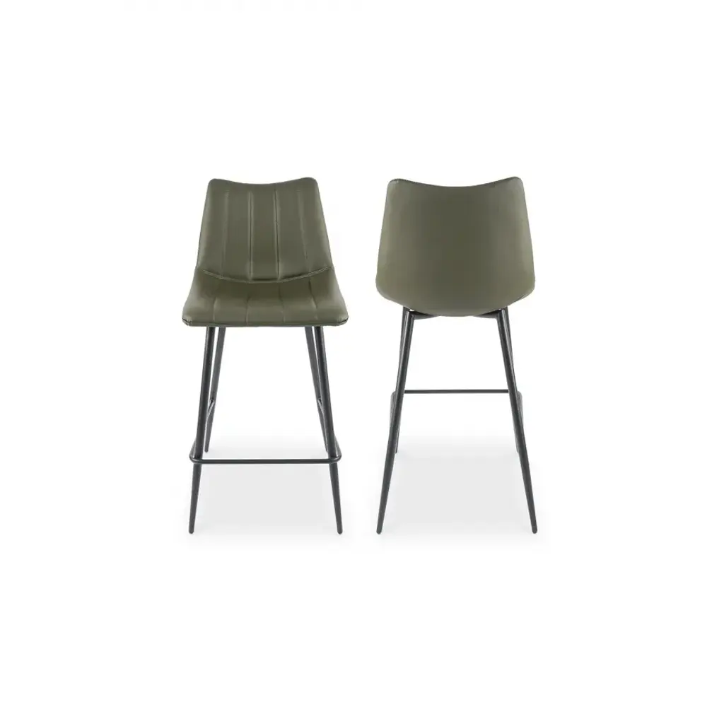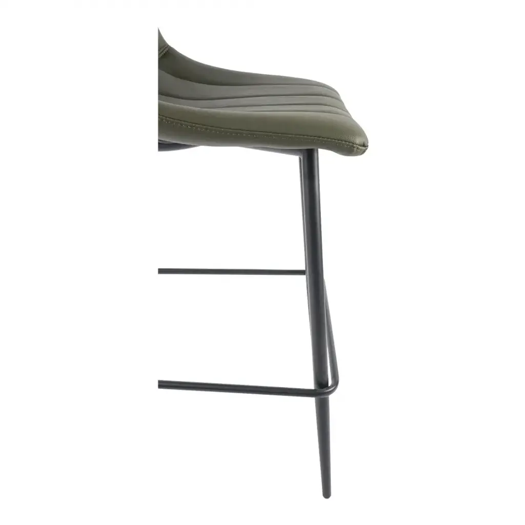 Contemporary modern counter stools get a new take with this sleek aesthetic. Available in several colors, the Alibi counter stool features striking vertical line stitches that add subtle detail to its monochromatic design. A soft vegan leather seat is shaped to fit for comfort so guests can relax at the island or bar counter.