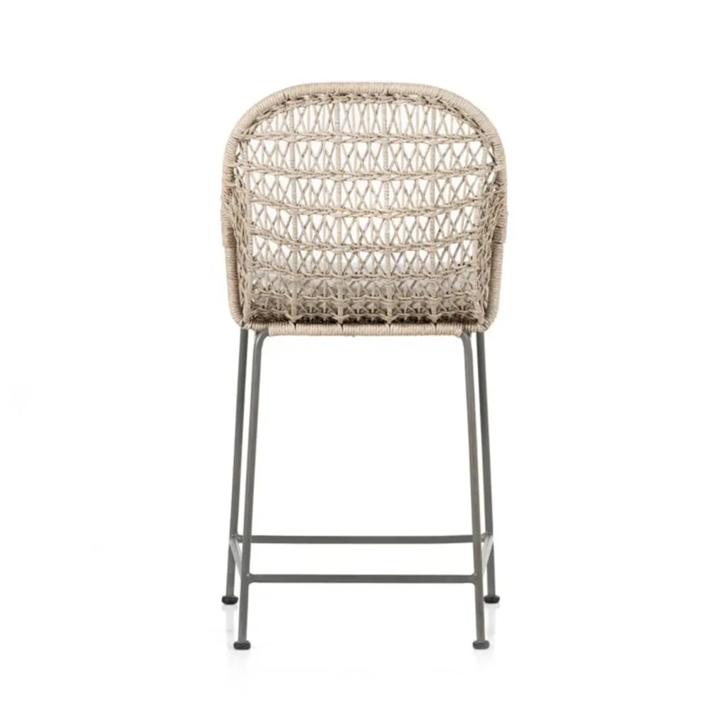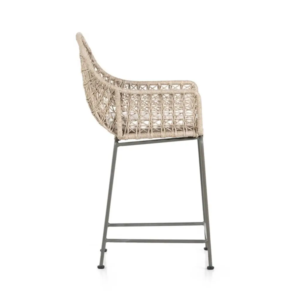 Armchair comfort and modern minimalism unite in our outdoor Arcadia stool. A breezy open cross weave of all-weather wicker wraps on a linear grey-bronze iron frame, complementing the slim legs and showcasing the seat's flowing curves. A white seat cushion adds a layer of comfort. With its beachy vibe and contemporary style, the counter stool is perfect for hanging out at a high-dining table or outdoor bar.