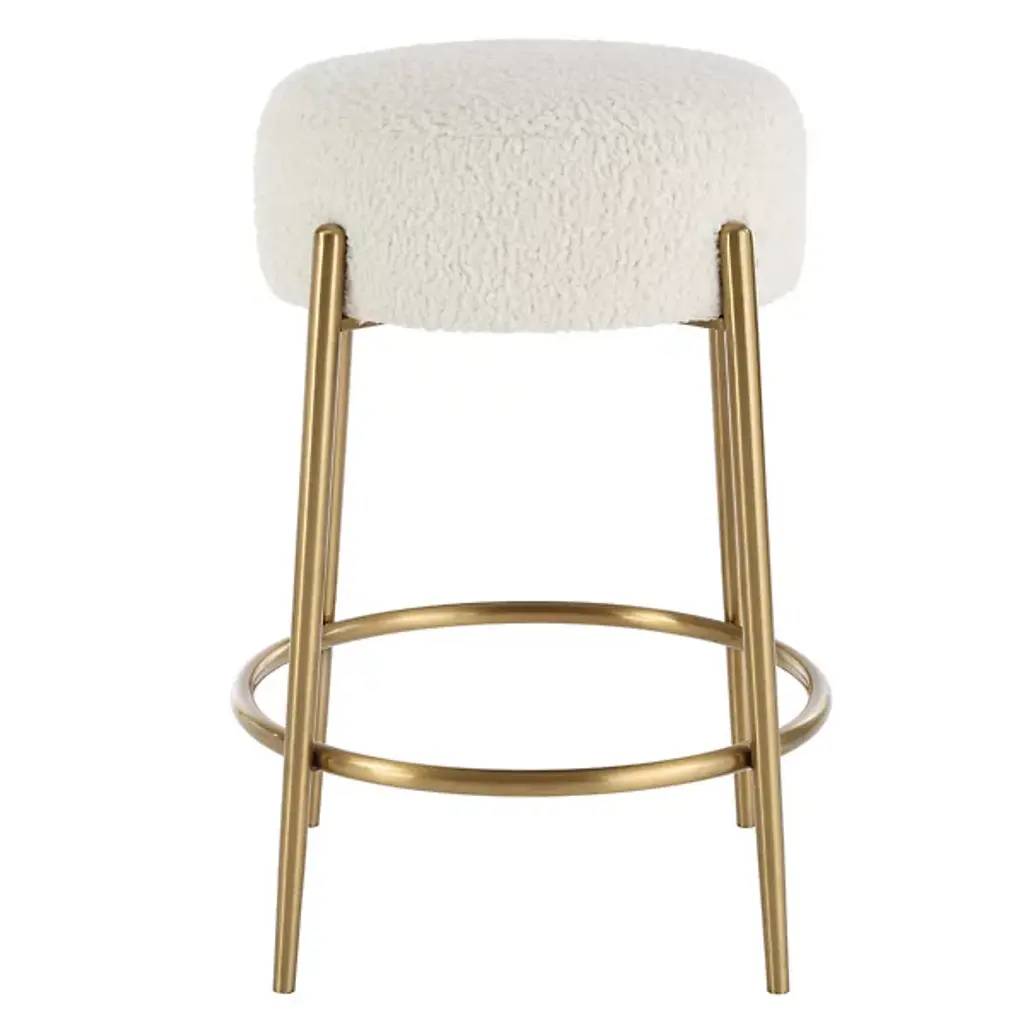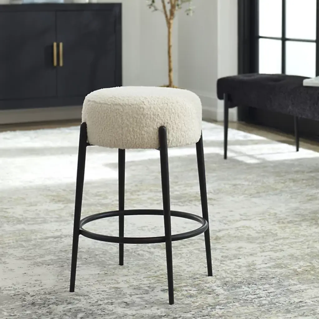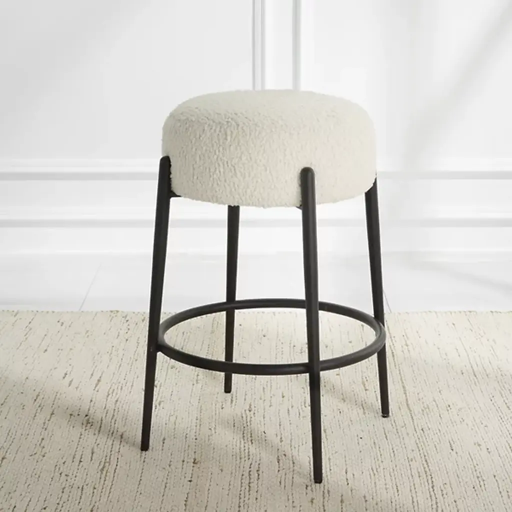 The Arles Counter Stool from Uttermost exudes contemporary sophistication with its plush design and luxurious white faux shearling upholstery, gracefully suspended by satin black finished metal legs. The stool embodies the vision of designer Matthew Williams, focused on comfort and appeal; its polyester fabric ensures both comfort and durability. The foam fill and a thoughtfully constructed frame of metal create a balance of style and substance, contributing to modern interiors seeking elevated comfort and refined aesthetics.