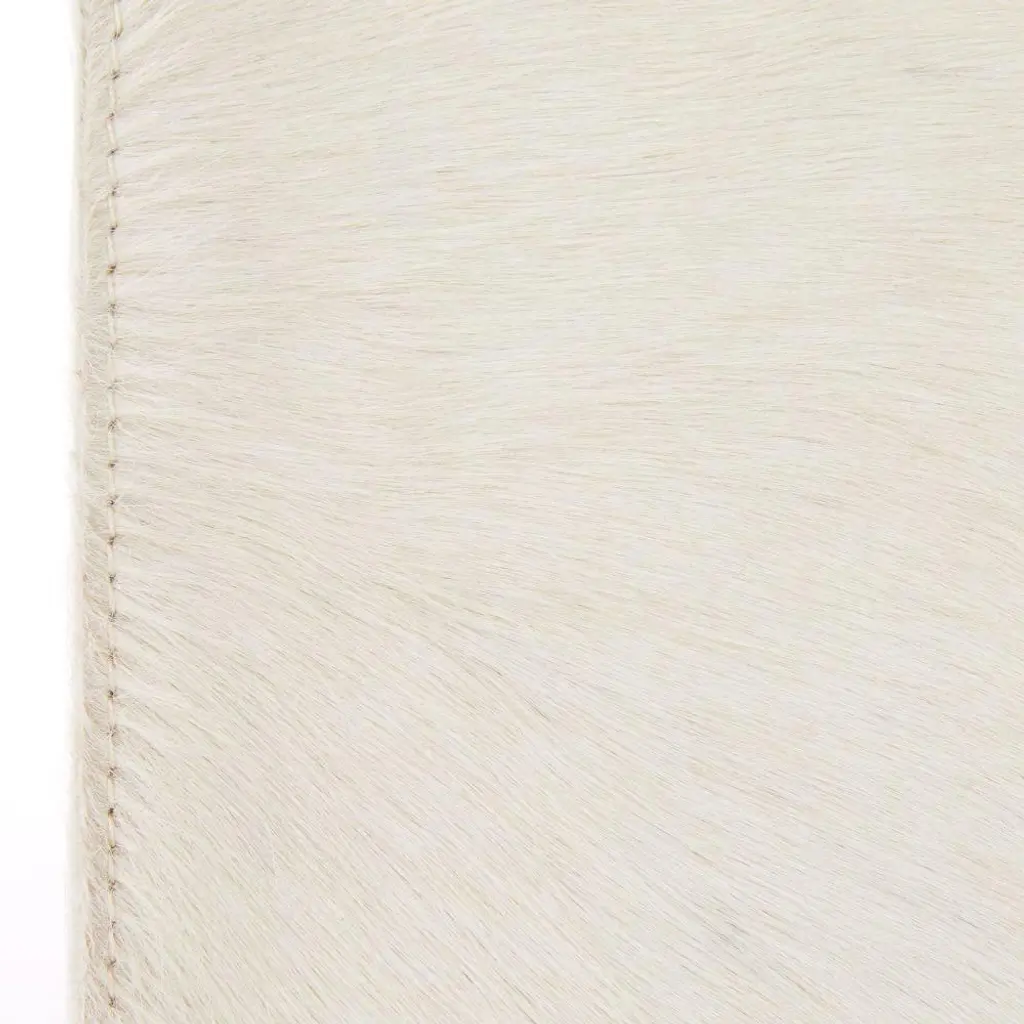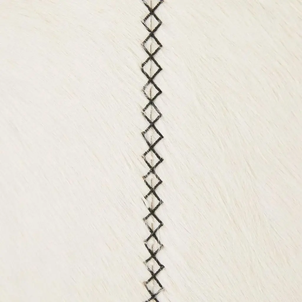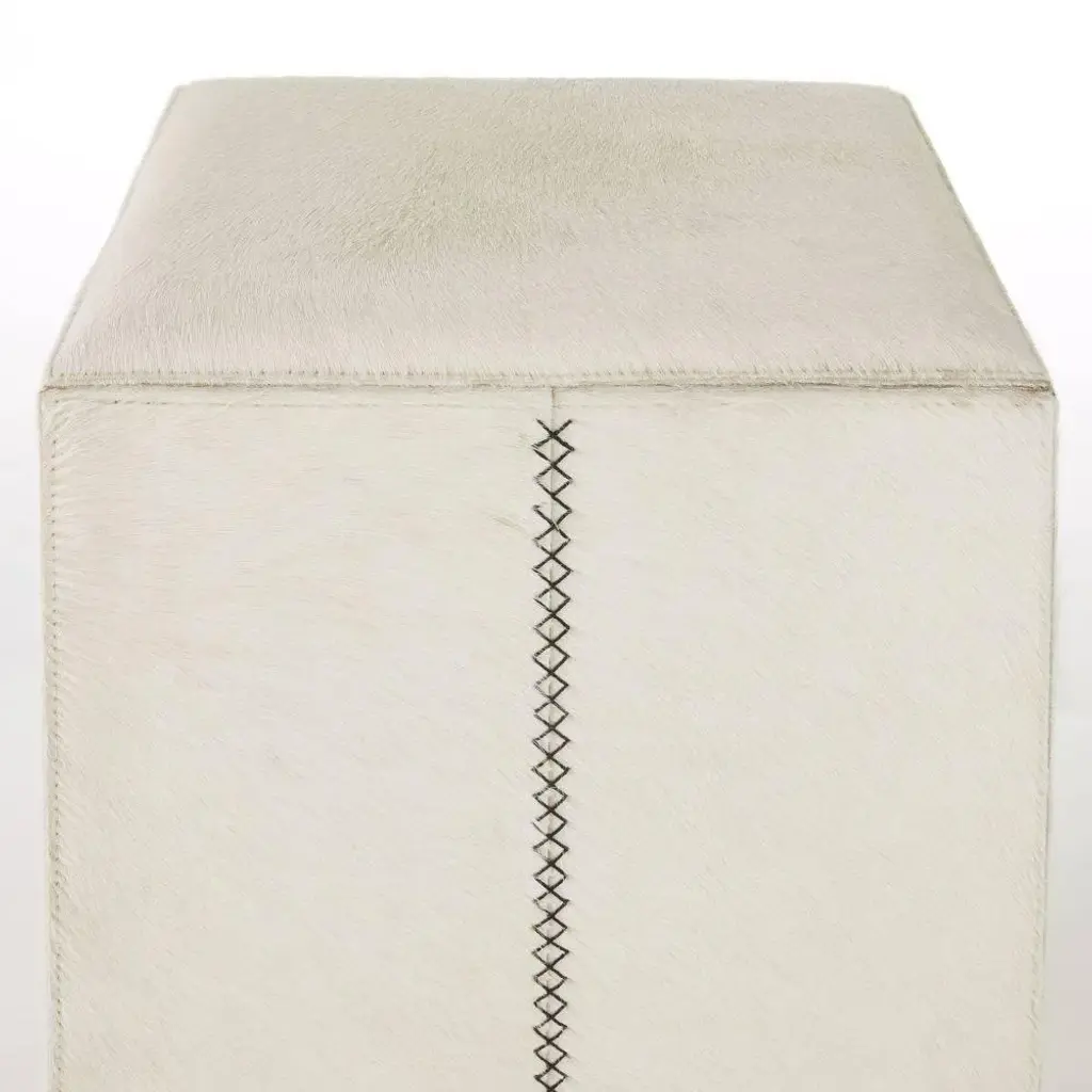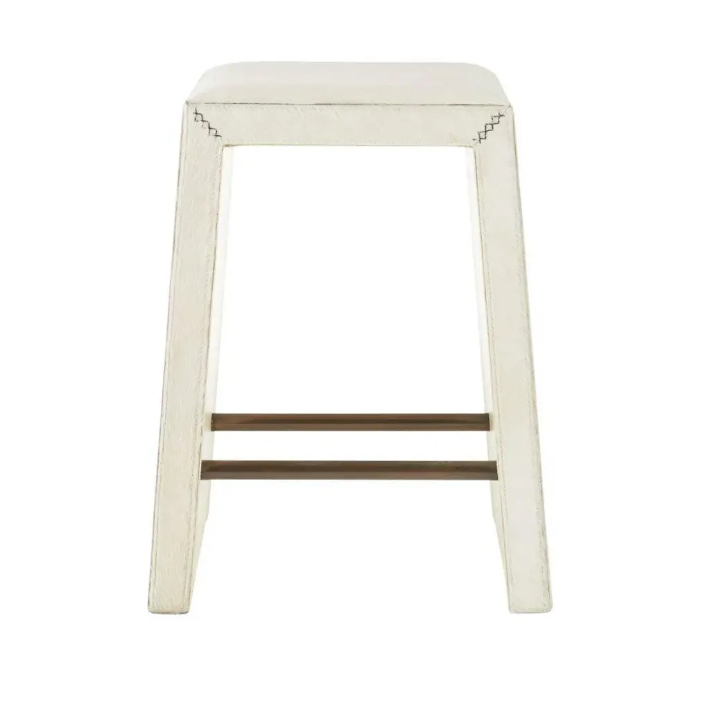 Crafted of white hair-on-hide, this backless counter stool is a tactile delight. A mitered whipstitch creates a racing stripe down the center of each side, while slim antique brass bridges add contrast and support to this minimal design. Hide will vary.