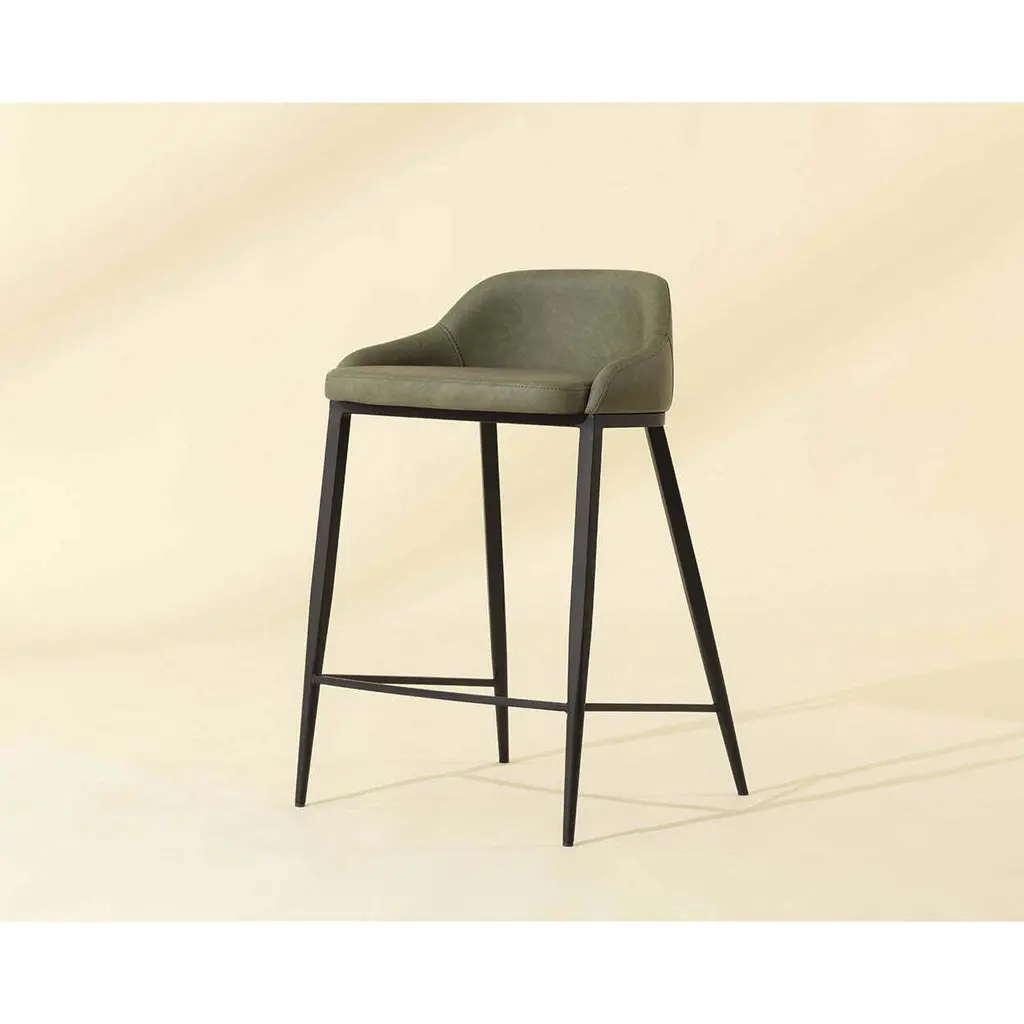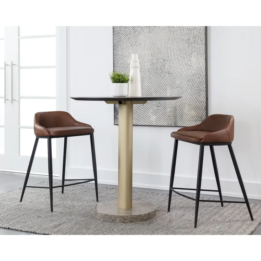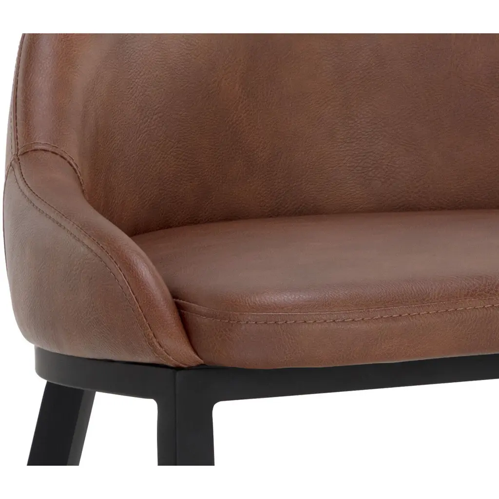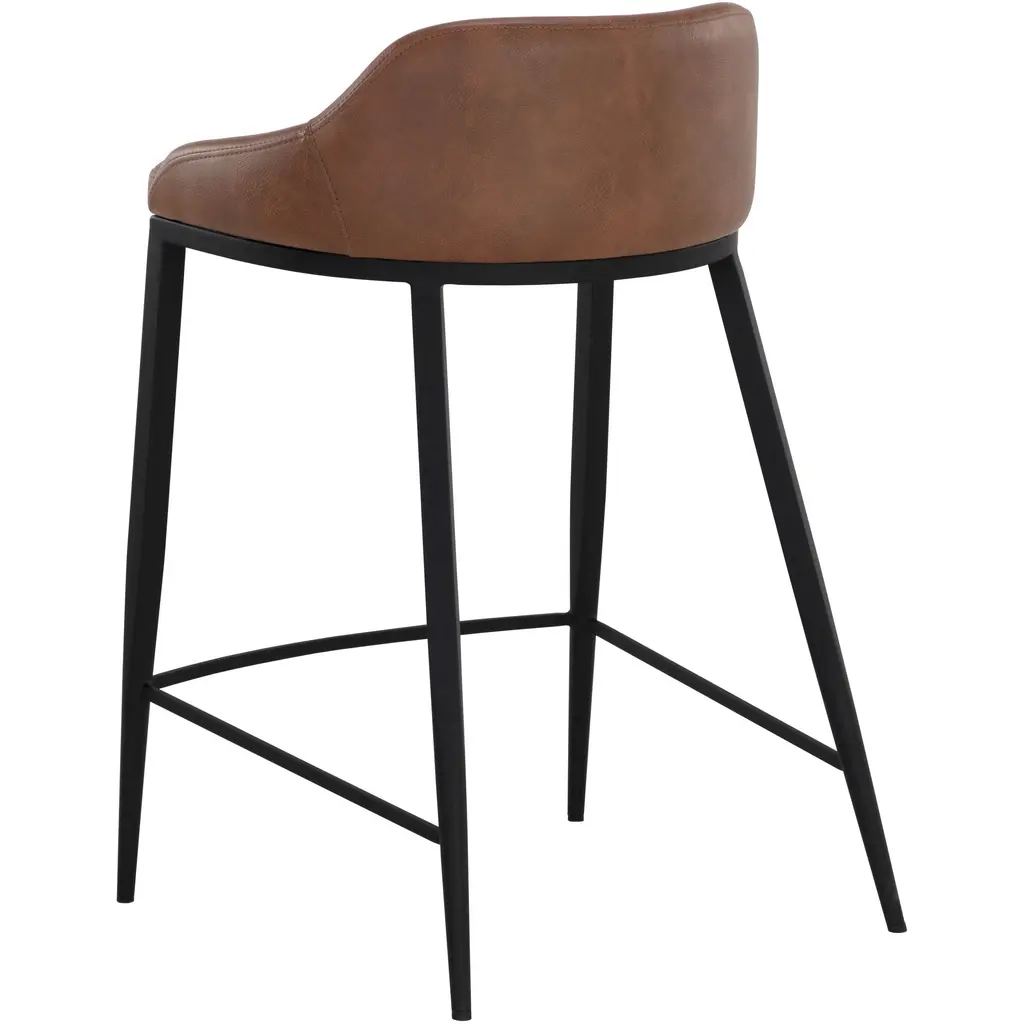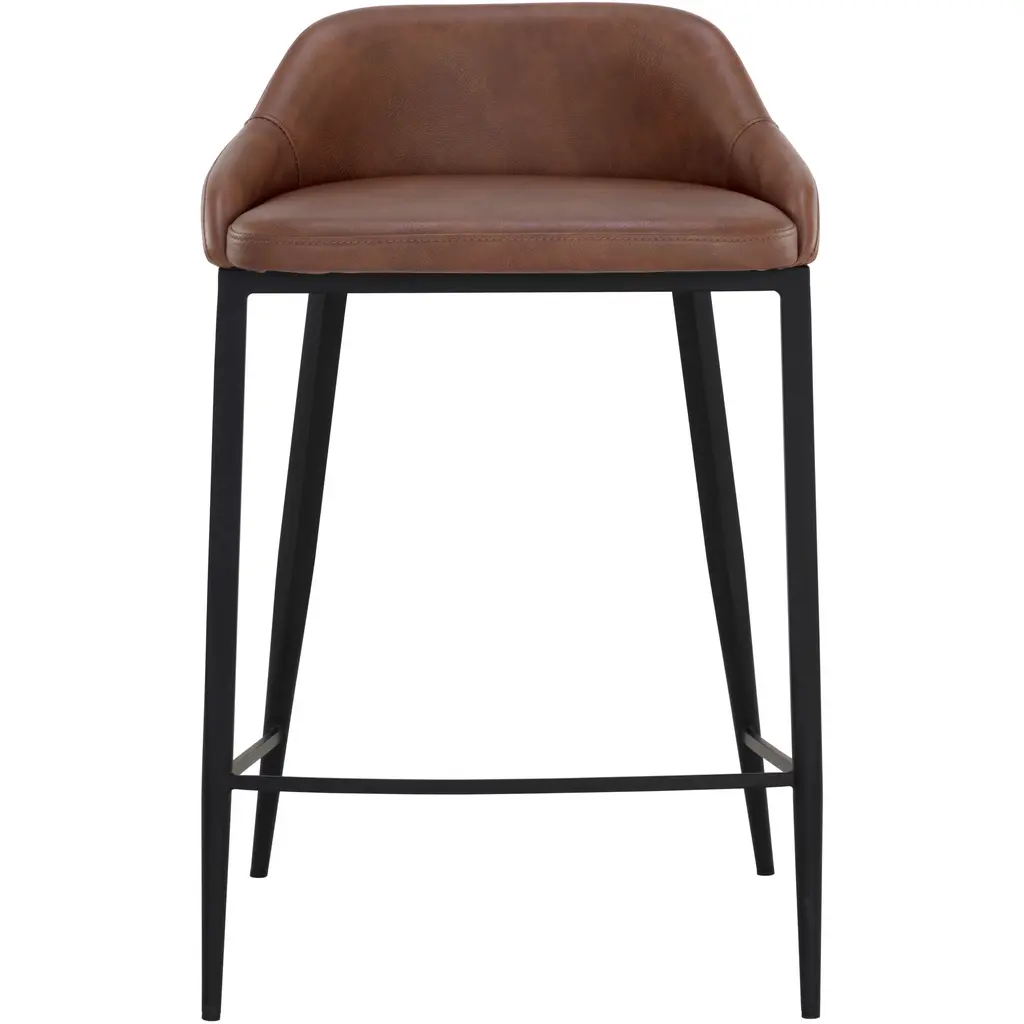 The Astra Counter Stool is distinguished by its strong modern silhouette and sleek black powder-coated iron legs. Smooth cinnamon brown faux leather wraps around a comfortable low back seat. Handle With Care: This design has been crafted with faux leather. Faux leather is manufactured to reflect the natural characteristics of leather as such, colour variations, markings, wrinkles, grooves, and light scratches are appreciated characteristics. No two pieces will be alike. Visit our Product Care page for more information on how to ensure the lasting beauty of this piece.