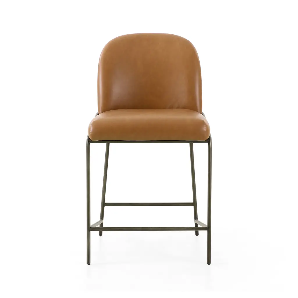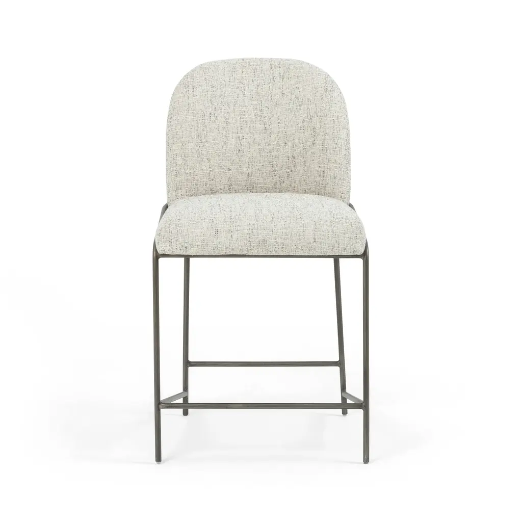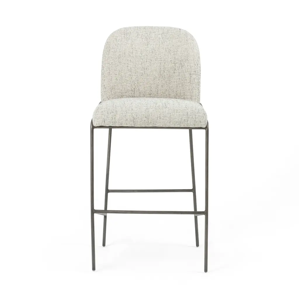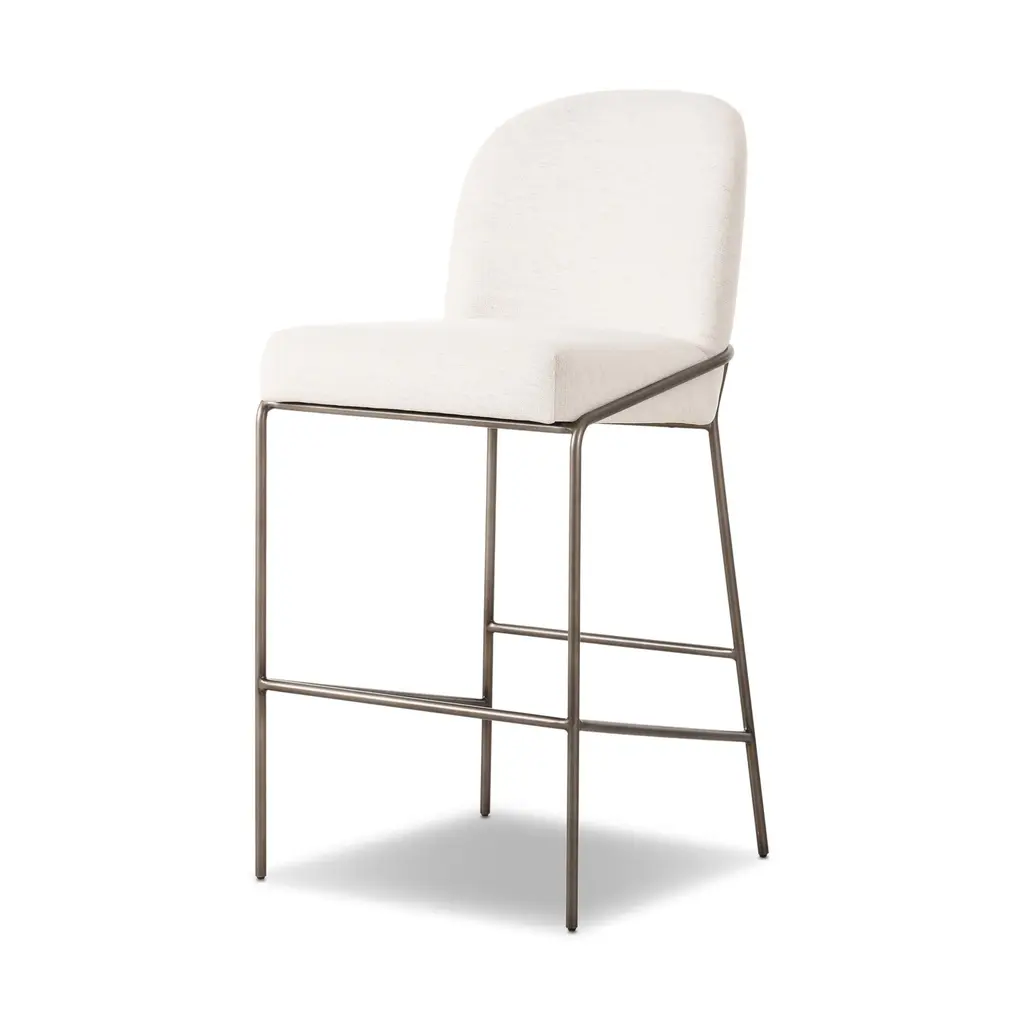 A unique statement piece, the Astrud Bar & Counter Stool from Four Hands is designed to bring dreamy Art Deco flair to any home. Its finely crafted, scalloped back is upholstered with luxurious performance fabric or faux leather atop slim, iron tube framing. The Fiqa fabrics are designed for maximum comfort and durability, and are stain-resistant, water-repellent, and antimicrobial. Add sophistication and timeless style to any room with this exquisite seating design. Highlights