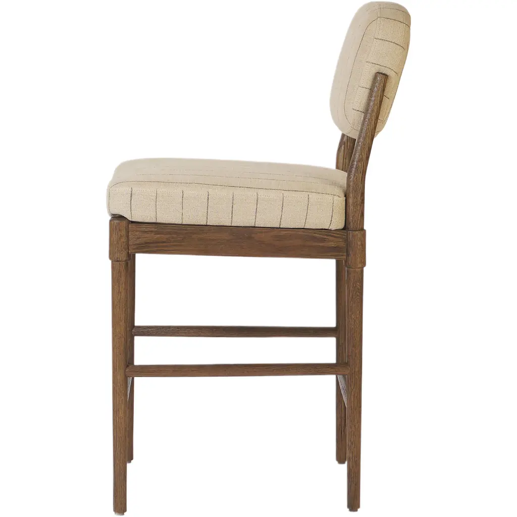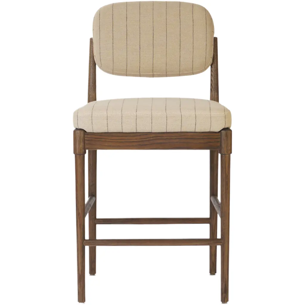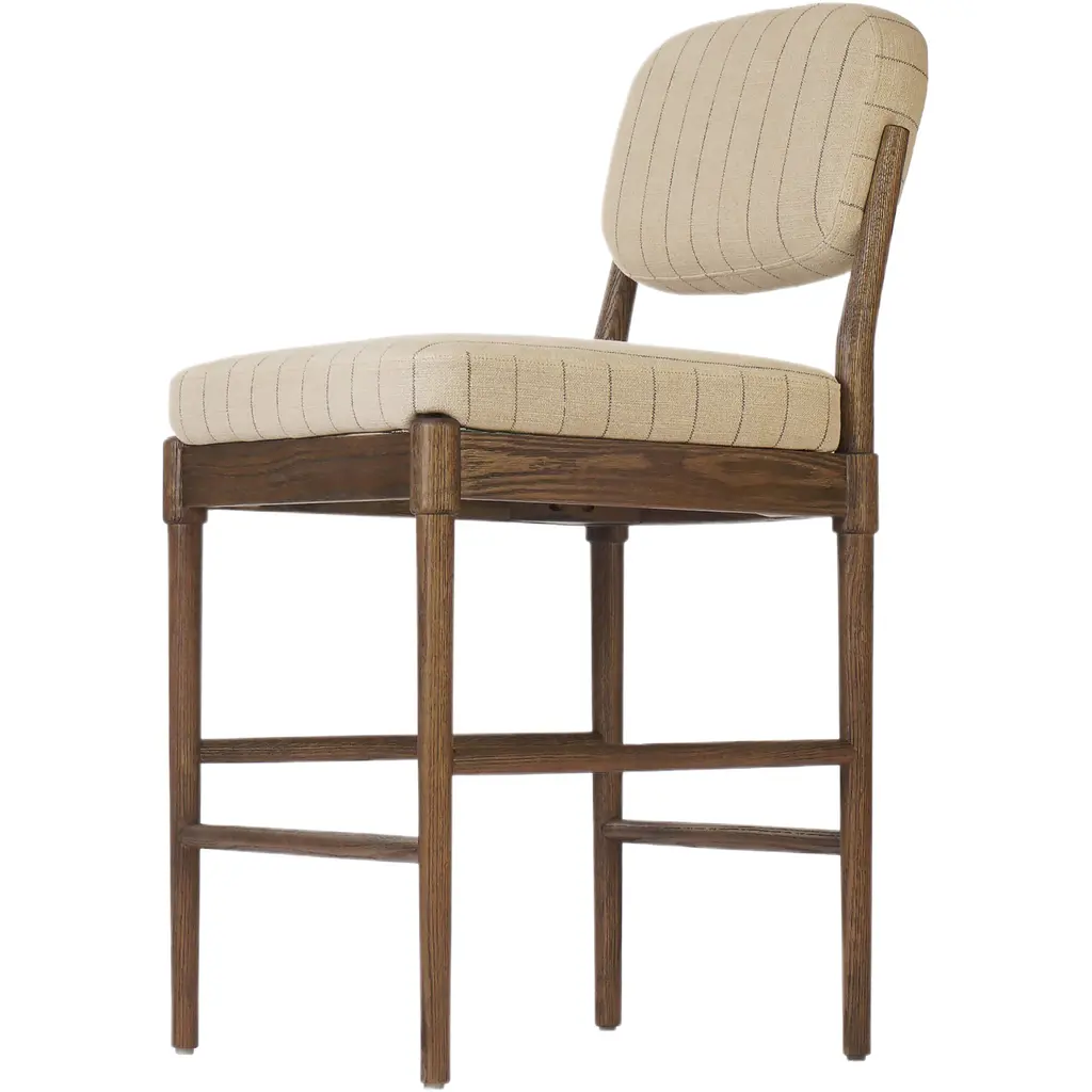 The Auretta Counter Stool offers a modern twist on the traditional counter stool design. Its linen and cotton blend cushioning features a subtle pinstripe pattern, providing a unique yet versatile aesthetic. The stool is elegantly framed with brown oak, making it an ideal choice for pairing or grouping in any space.
