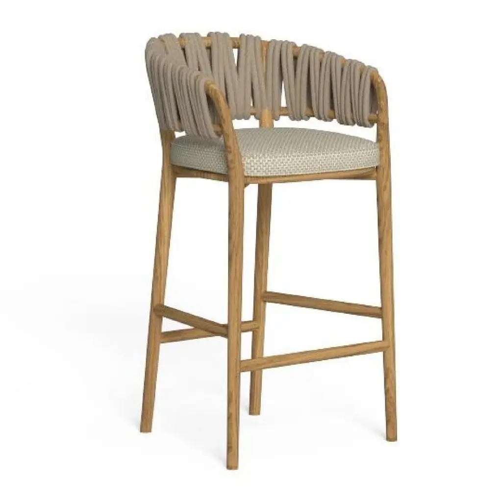 The natural material mix of the Ava Seagrass Counter Stool not only elevates its design but adds casual approachability. The hand-woven seagrass back is bent into shape and fitted with a sandblasted teak frame. An upholstered, beach colored crypton fabric seat and brass footrest complete its design.