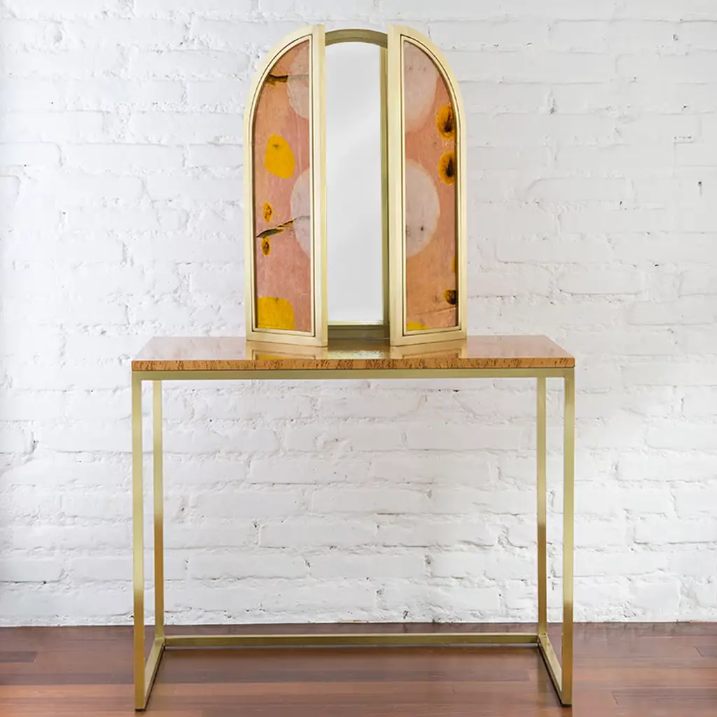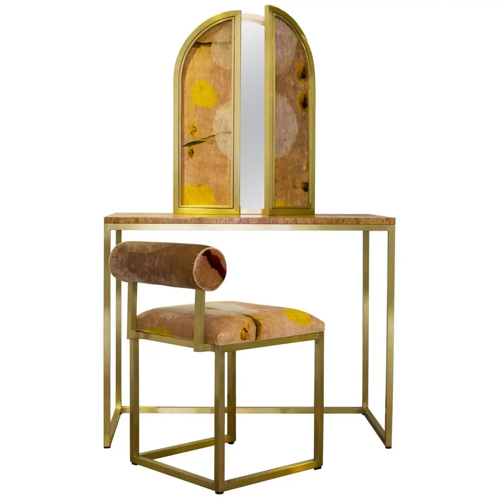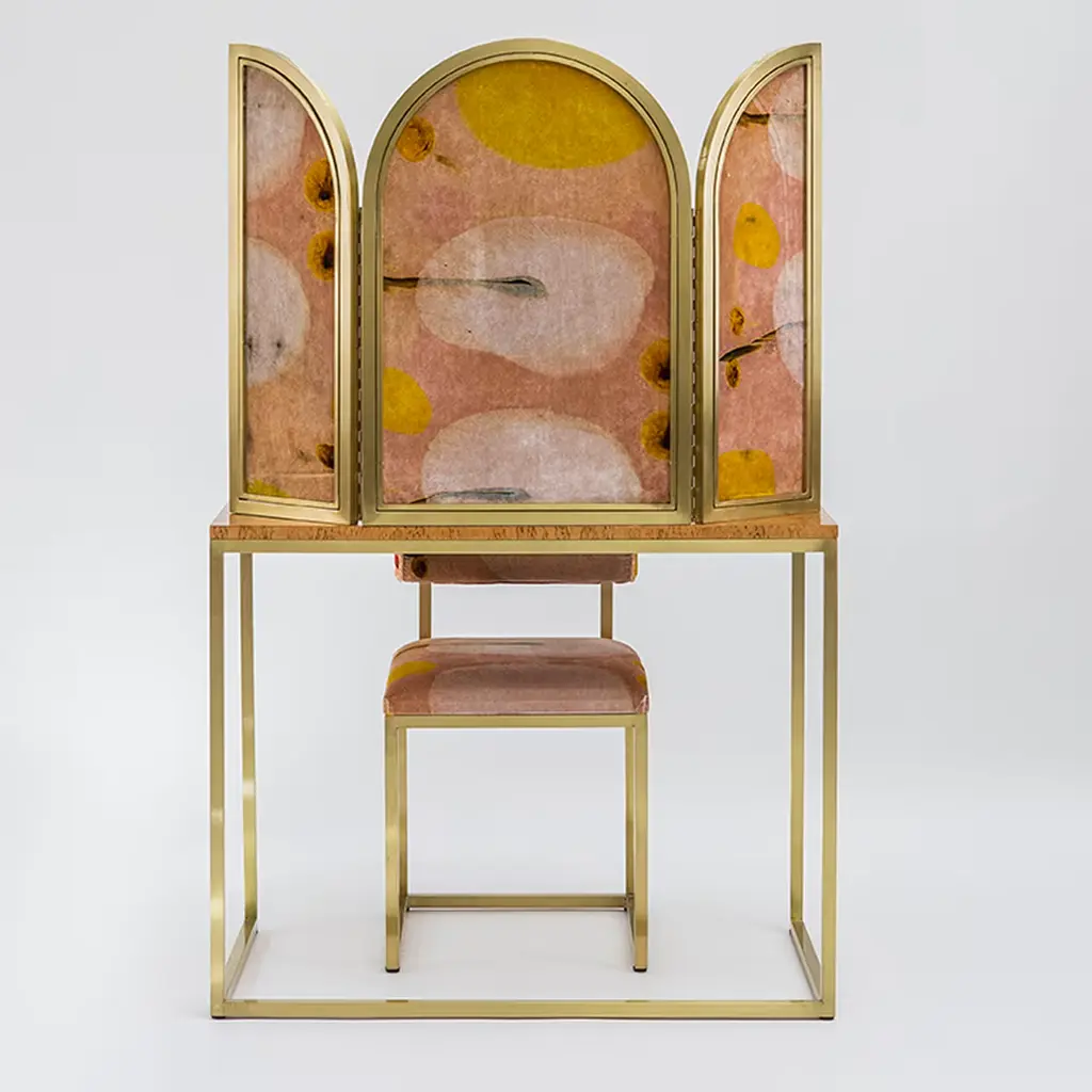 The project’s name speaks to the feeling of anticipation and excitement that precedes an encounter and it’s deeply linked to the purpose of the objects: benches, stools, a mirror, a vanity table, and a room divider. Awaiting is a feminine and sensual collection that mixes a taste of classic and contemporary in pieces of furniture realized in golden brass, glass, and velvet.