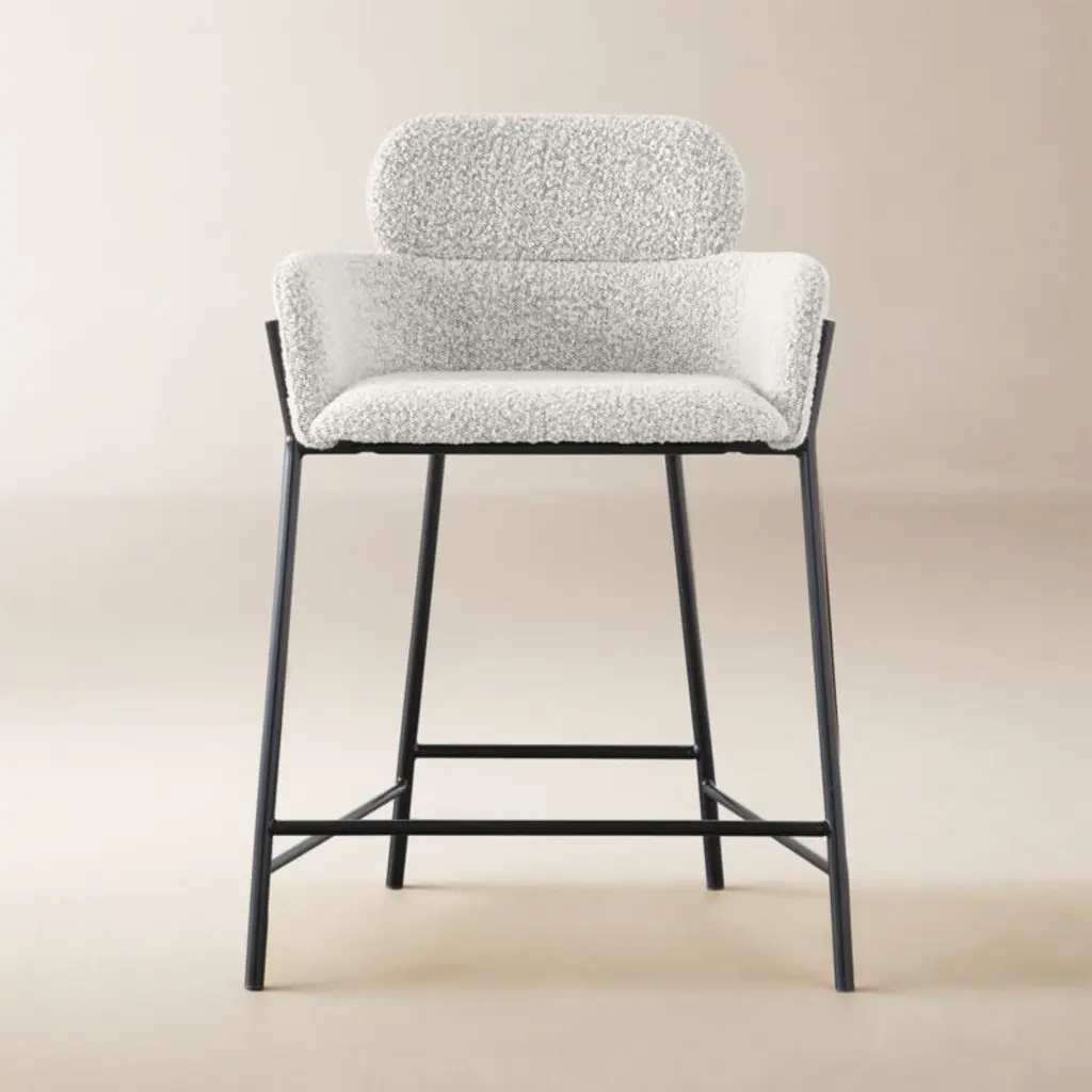 Designed by Caleb Zipperer and curved with two tiers of comfort. Soft boucle counter stool invites guests to stay a while. Sits plush with bottom tier sized just right for arm resting. Learn more about Caleb Zipperer on our blog. CB2 exclusive.
