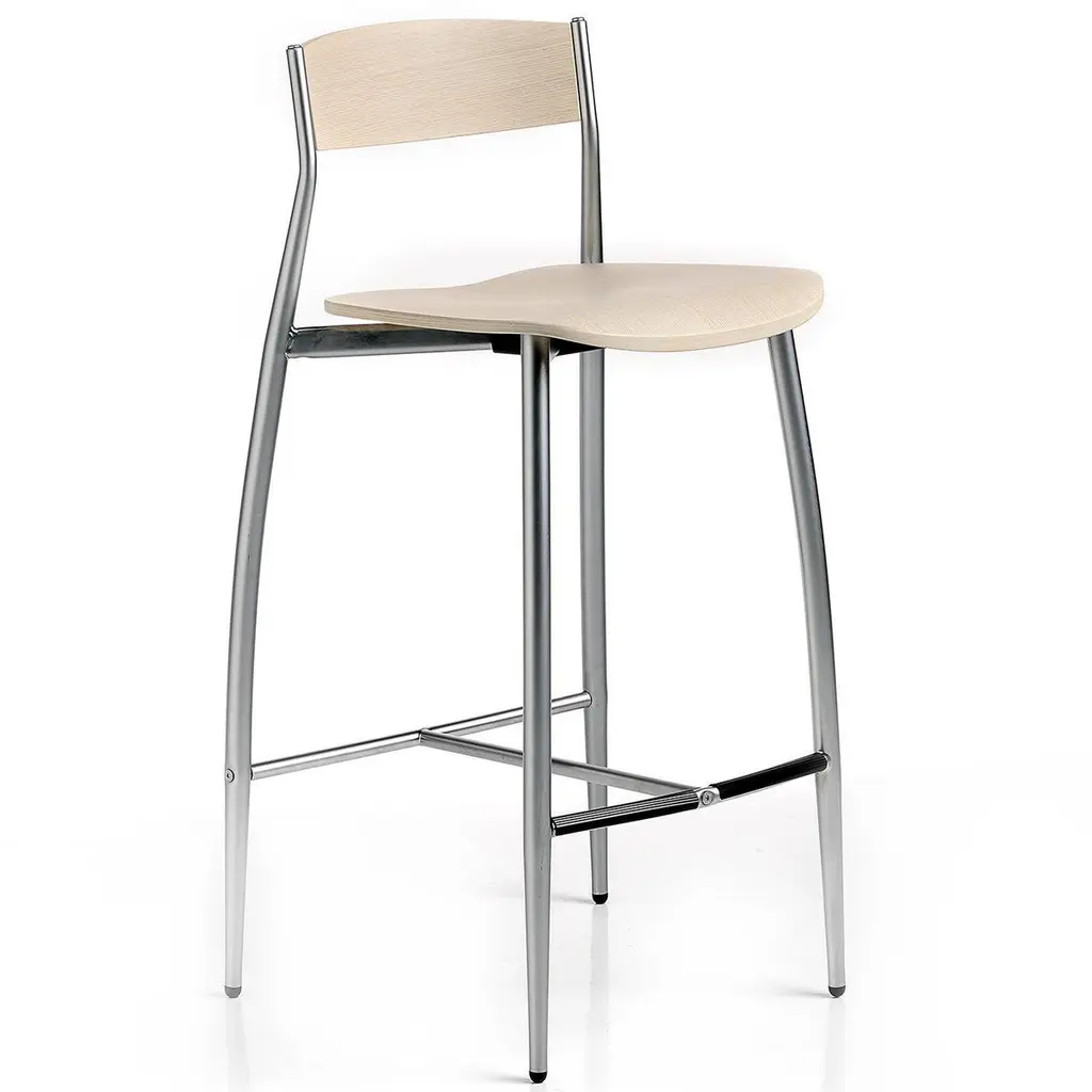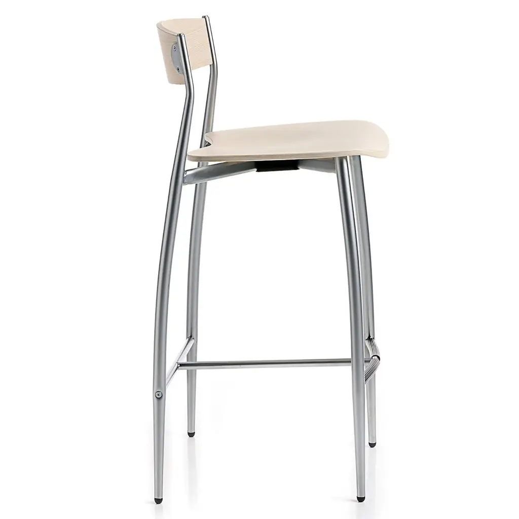 A perfect example of clean-lined modern design, these counter-height stools by Sergio Mian reveal a deep understanding of the human body and emphasis on the slightest details. The bleached oak-veneered seat (height is 67cm) and backrest are shaped to offer a comfortable seating experience at the optimal height (76 cm), while the sleek chromed cylindrical steel frame (diameter 25 mm, thickness 1.5 mm) add lightness and stability. Minimum order of two pieces that ship 1 fully assembled and 1 with foot-rest to assemble (hardware and tools included). Please note that the wood of these stools darkens slightly over time.