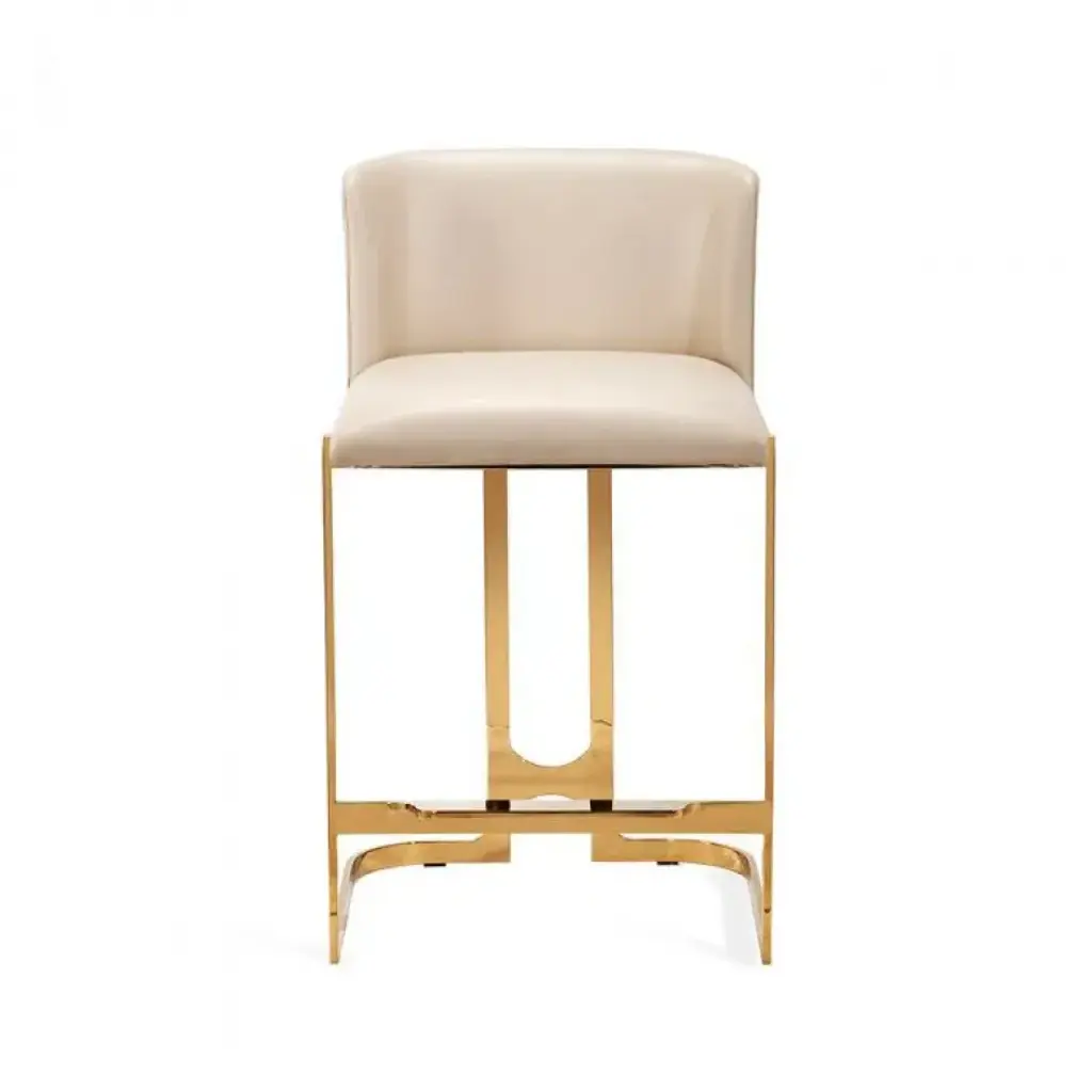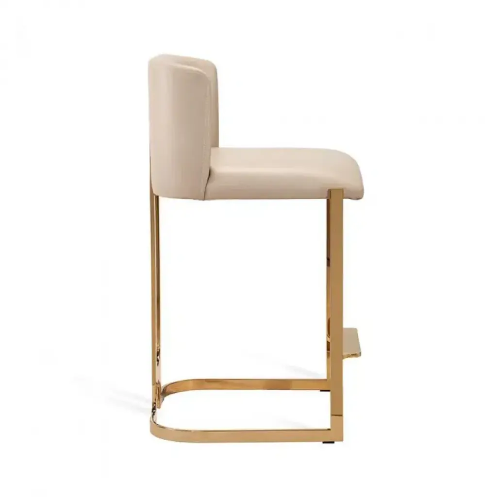Sleek and so glam, the Banks Counter Stool boasts an architectural stainless steel frame in a polished brass finish, and a cream latte faux leather seat.