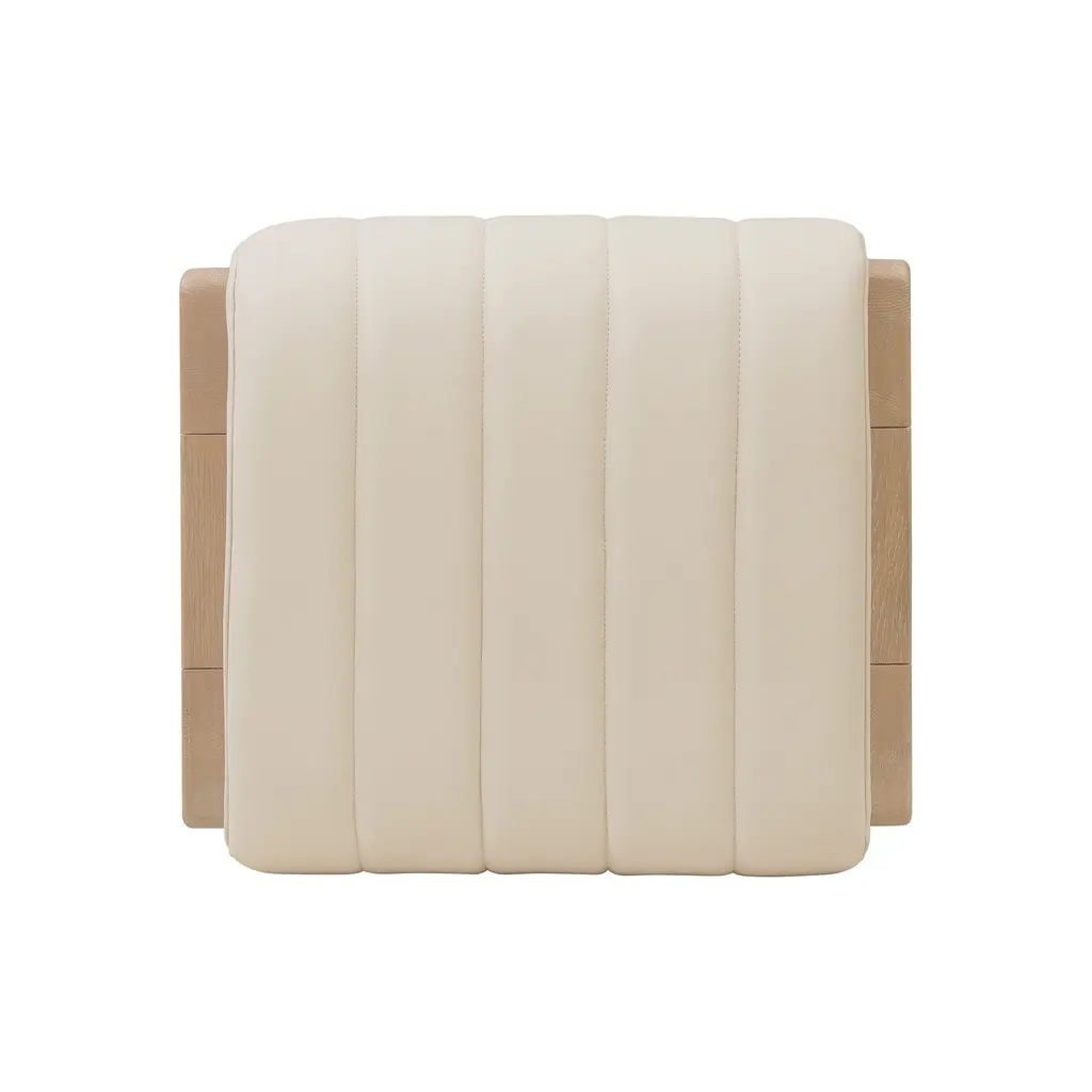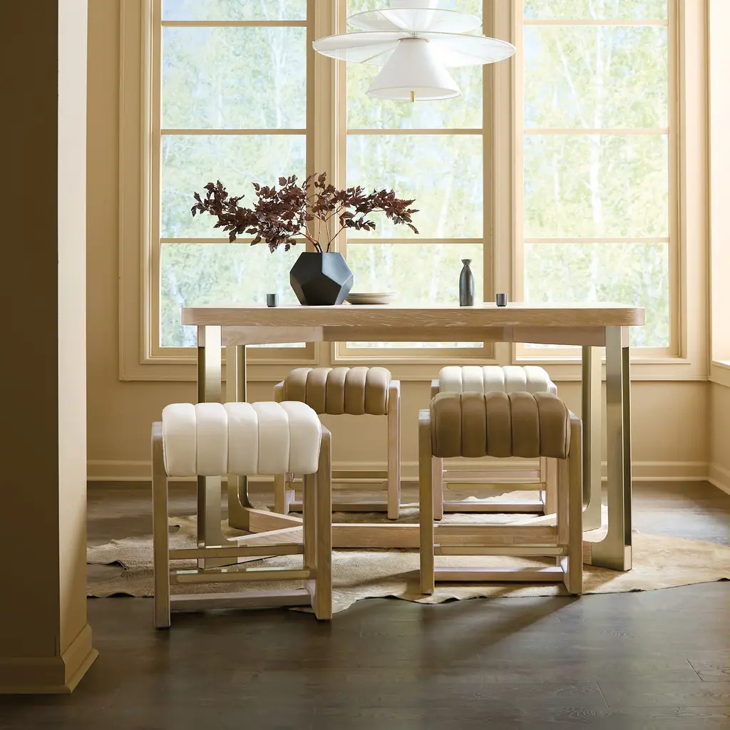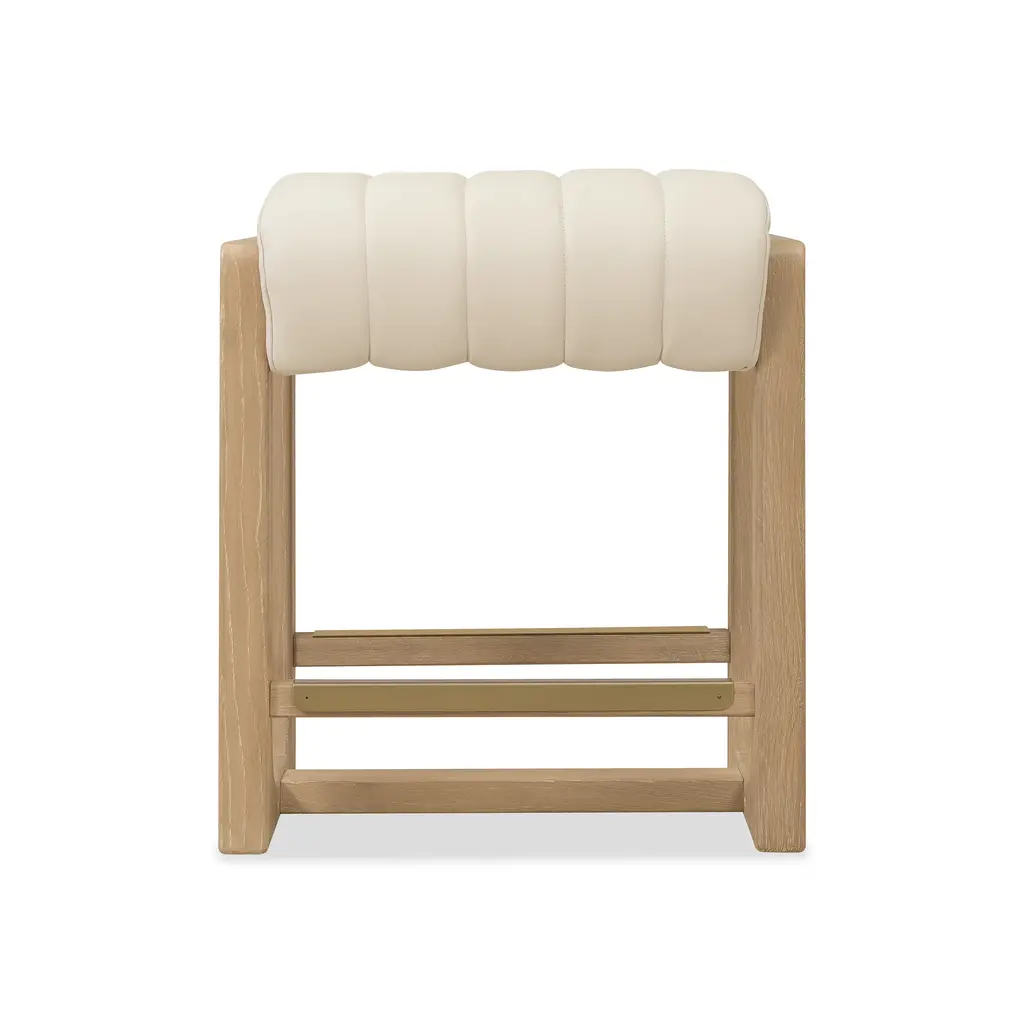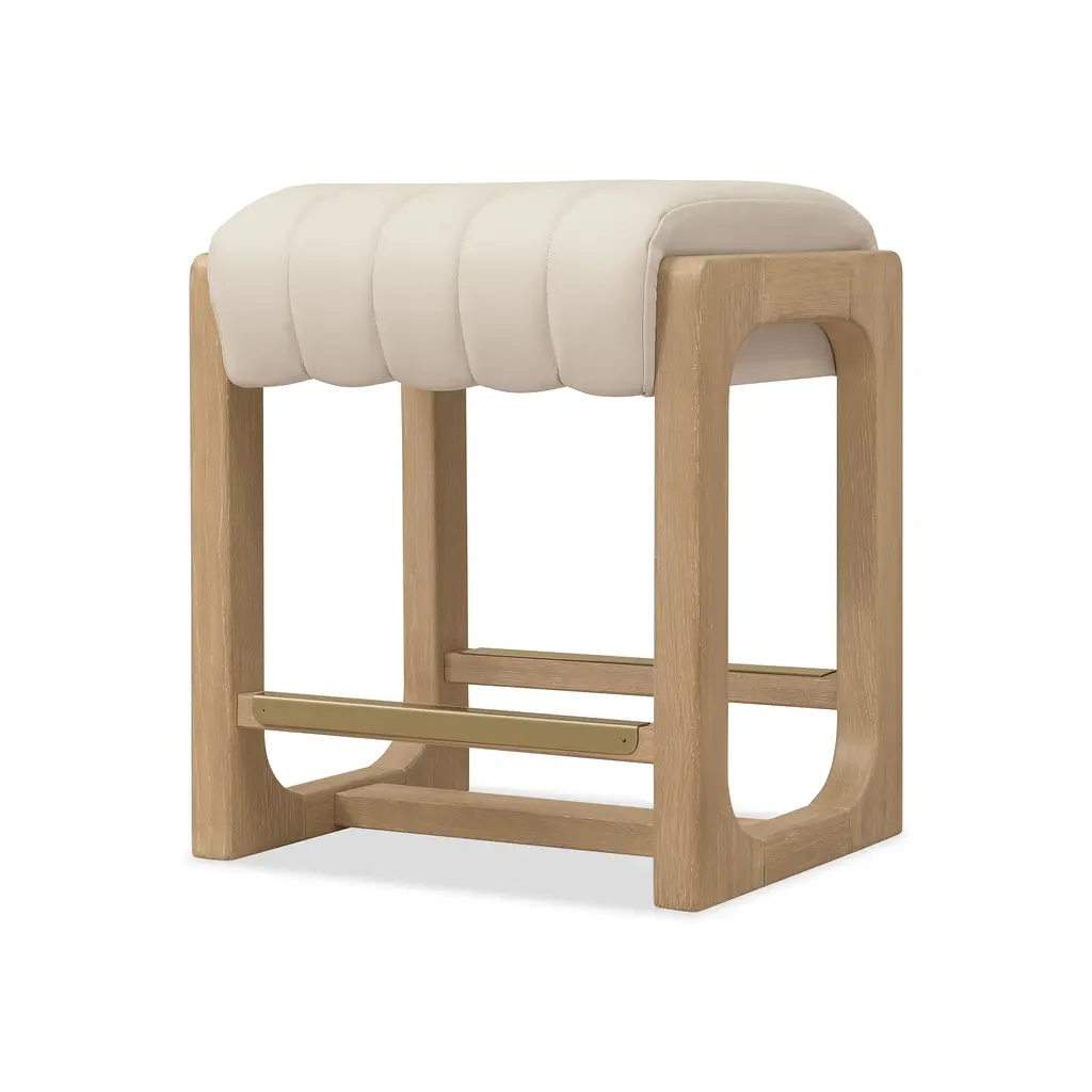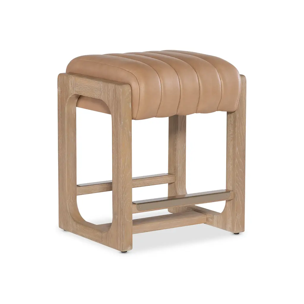 The Banyon Bay Counter Stool from Hooker is a sophisticated and functional addition to any kitchen or bar area. Made with white oak solids and veneers, this stool features a comfortable leather seat with channeled stitching. The brushed brass footrest adds a luxurious touch to the minimalist design. Choose between beige or brown leather to complement your contemporary decor. Highlights