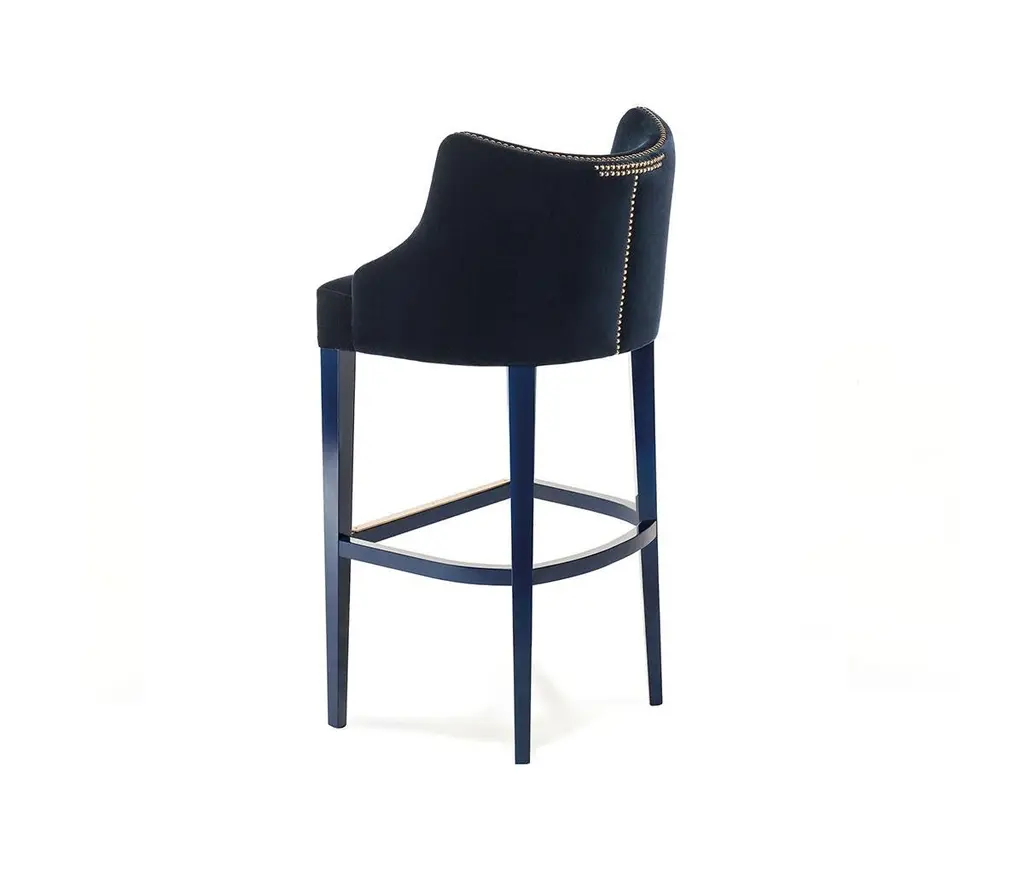 Becomes Me Counter Stool by MunnaDimensions: D 50 x W 53 x H 95 cm. SH: 70 cm.Materials: Solid wood, foam, brass, and upholstery.Finish: Upholstery: Cotton Velvet, ref. Midnight Blue, CV17. Legs: Midnight blue gloss lacquer. Metal detail: Brushed brass. Nails: Plated Brass.Available in all Munna fabrics except Wild Silk. Available in client’s ownmaterial. Available upholstered, Rosewood or Ebony veneer, solid Walnut, Wengé stain, or lacquer in all RAL colors, in matt or gloss. Fire retardant interlining is available on request. Handmade in Porto. Please contact us.Established in Porto in 2008, Munna is a furniture design brand renowned for creating handmade upholstery with unmatched craftsmanship, seamlessly blending noble materials and timeless design, for both commercial and residential projects.Made by hand in Porto, Munna’s pieces honor the profound heritage of craftsmanship, while drawing inspiration from history’s most influential artistic periods. Munna’s pieces are made of the finest fabrics such as cotton velvet, twill, leather, and silk; the finest wood veneers, such as ebony, walnut, and rosewood; sumptuous gold, silver, and copper leaves, metal details in brass, nickel, and copper, and superior lacquers.